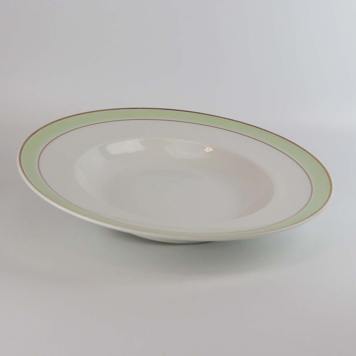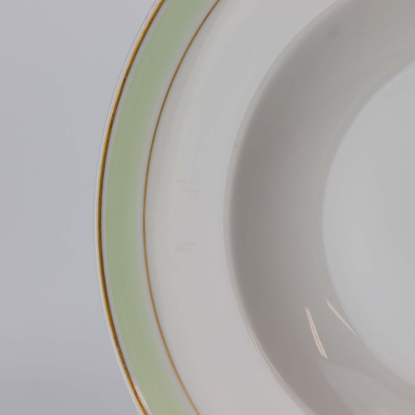 Service i glat hvidt porcelæn med mintgrøn dekoration og to guldkanter