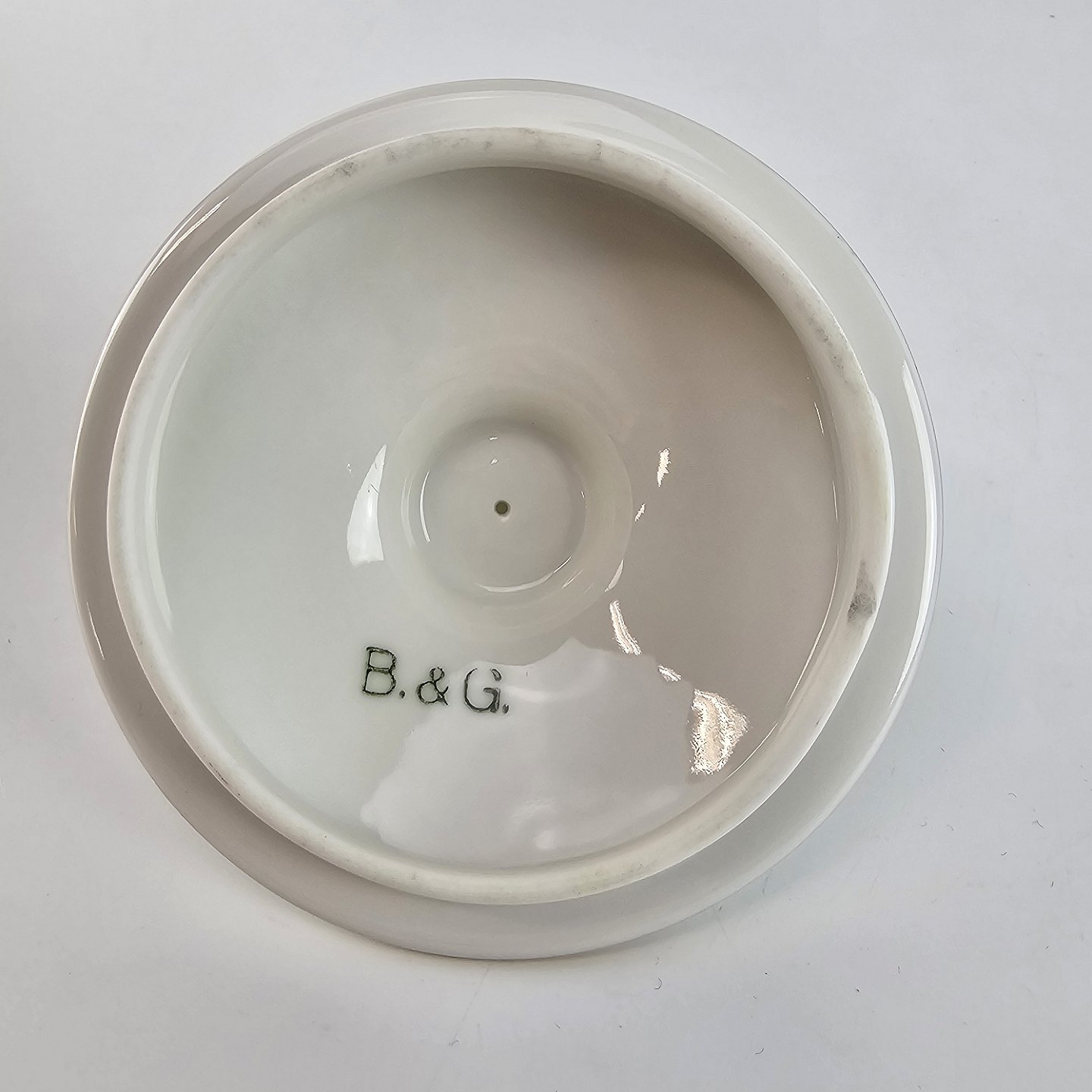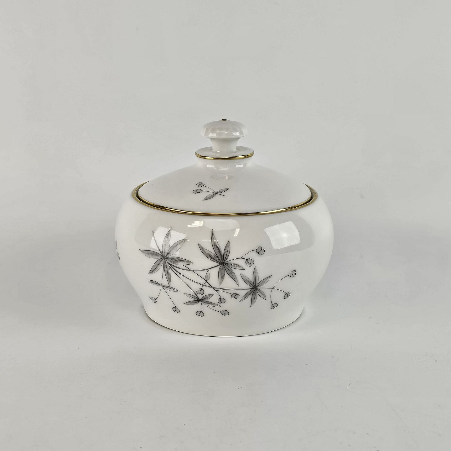 Stellet Henrik er af hvidt porcelæn dekoreret med grå burresnerre og guldkant. Mindre brugsspor kan forekomme