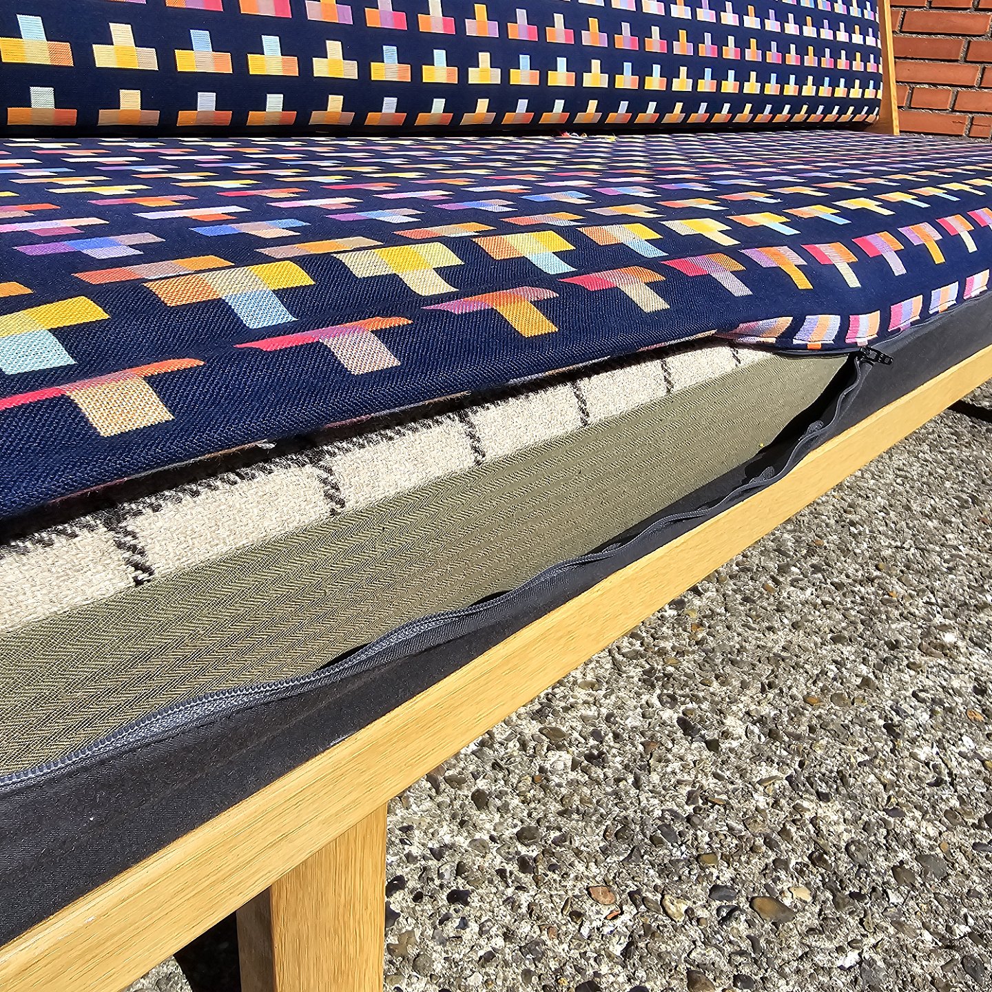 Der er slidt hul i betrækket under ryglænet.