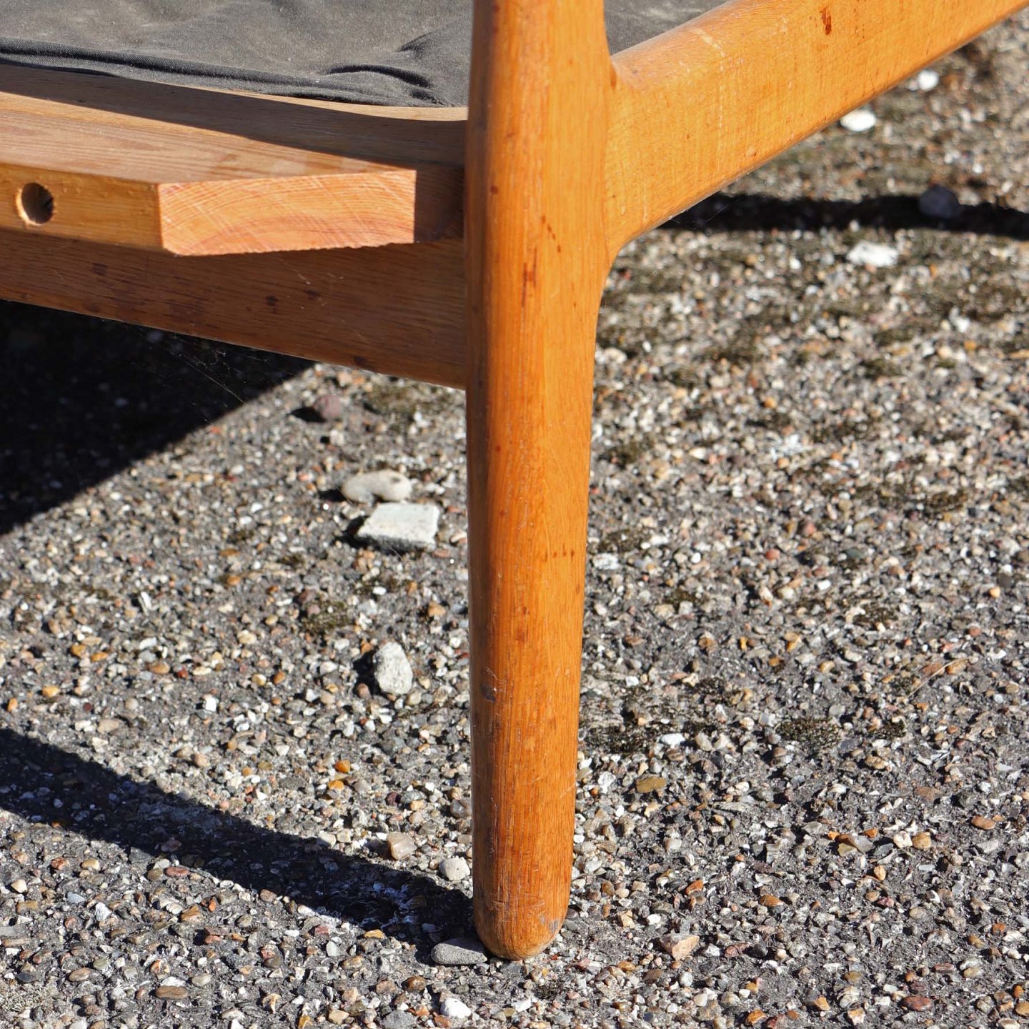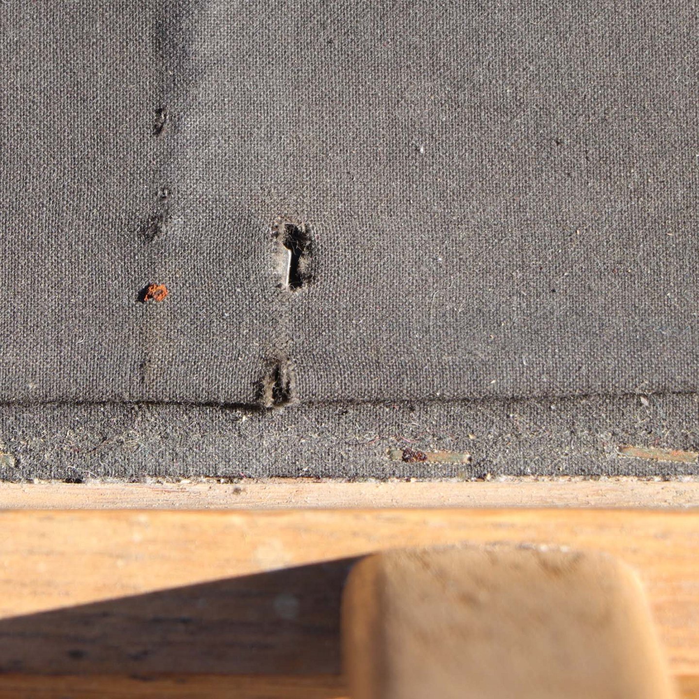 Fremstår med brugsspor som vandmærker, slid på lak og mindre hul i stof ved bunden.