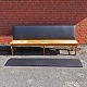 Lang bænk i kirkebænk stilen fremstillet i lakeret egetræ. Bænken har ny polstret ryg samt løs ny polstret sædehynde i sort læder.