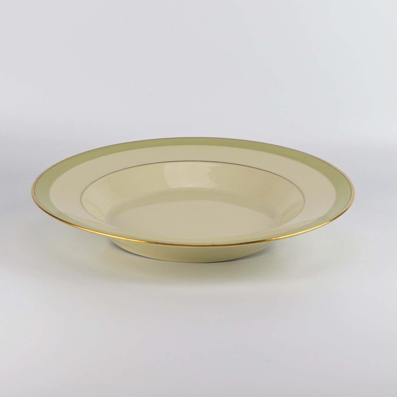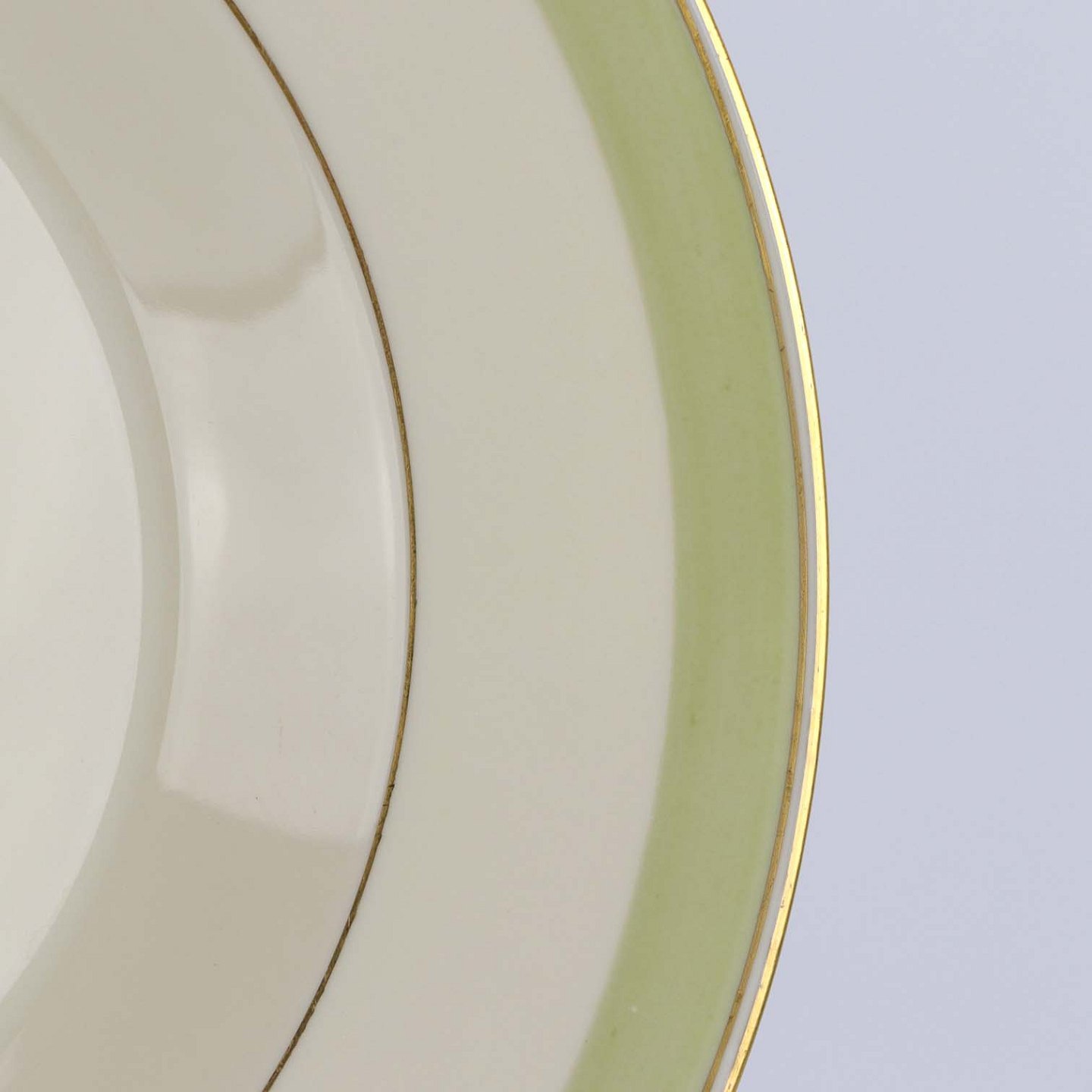 Stellet er fremstillet i glat cremefarvet porcelæn med lysegrøn dekoration og guldkant.