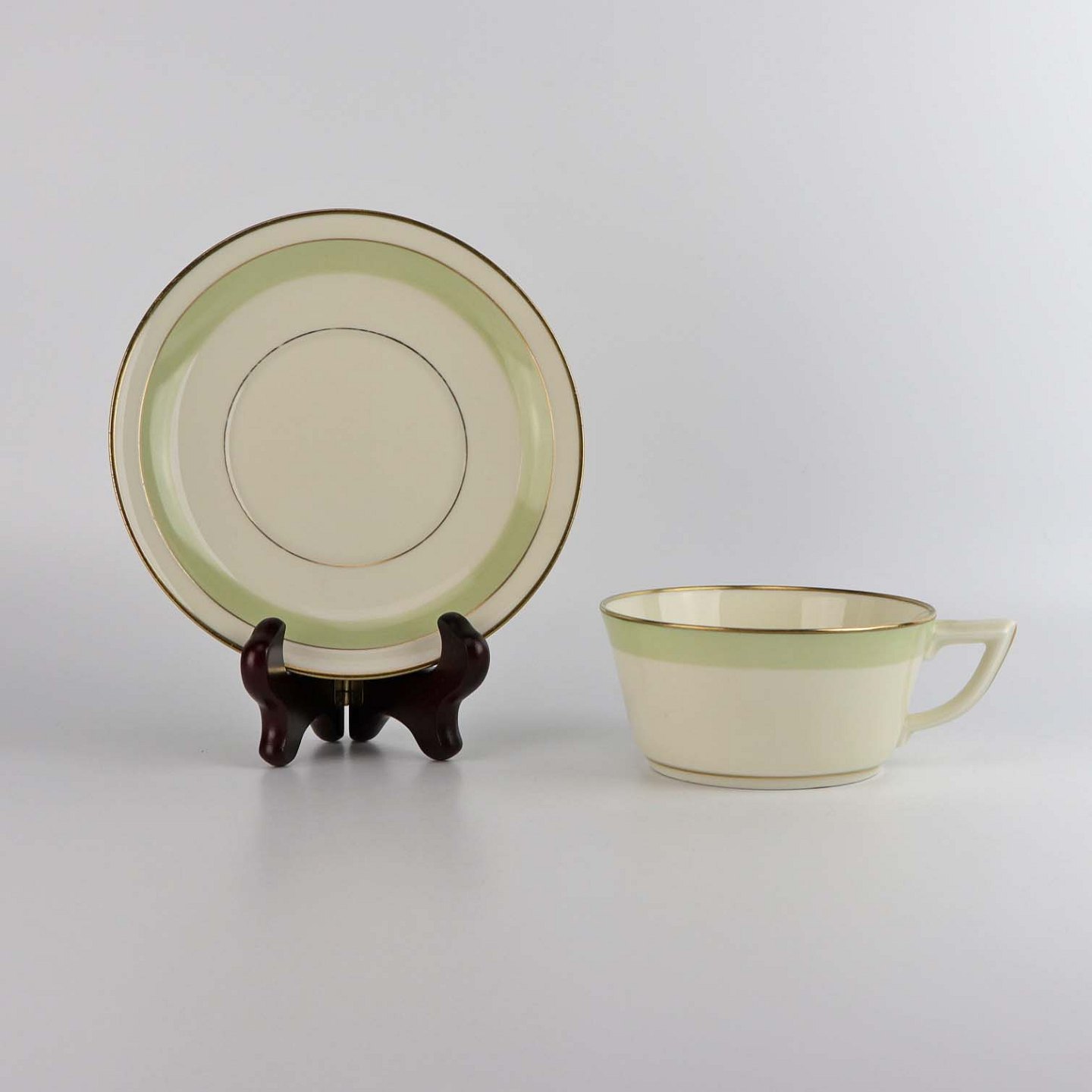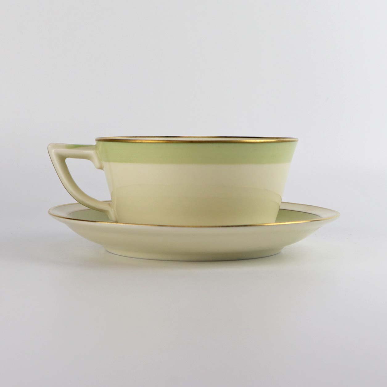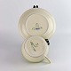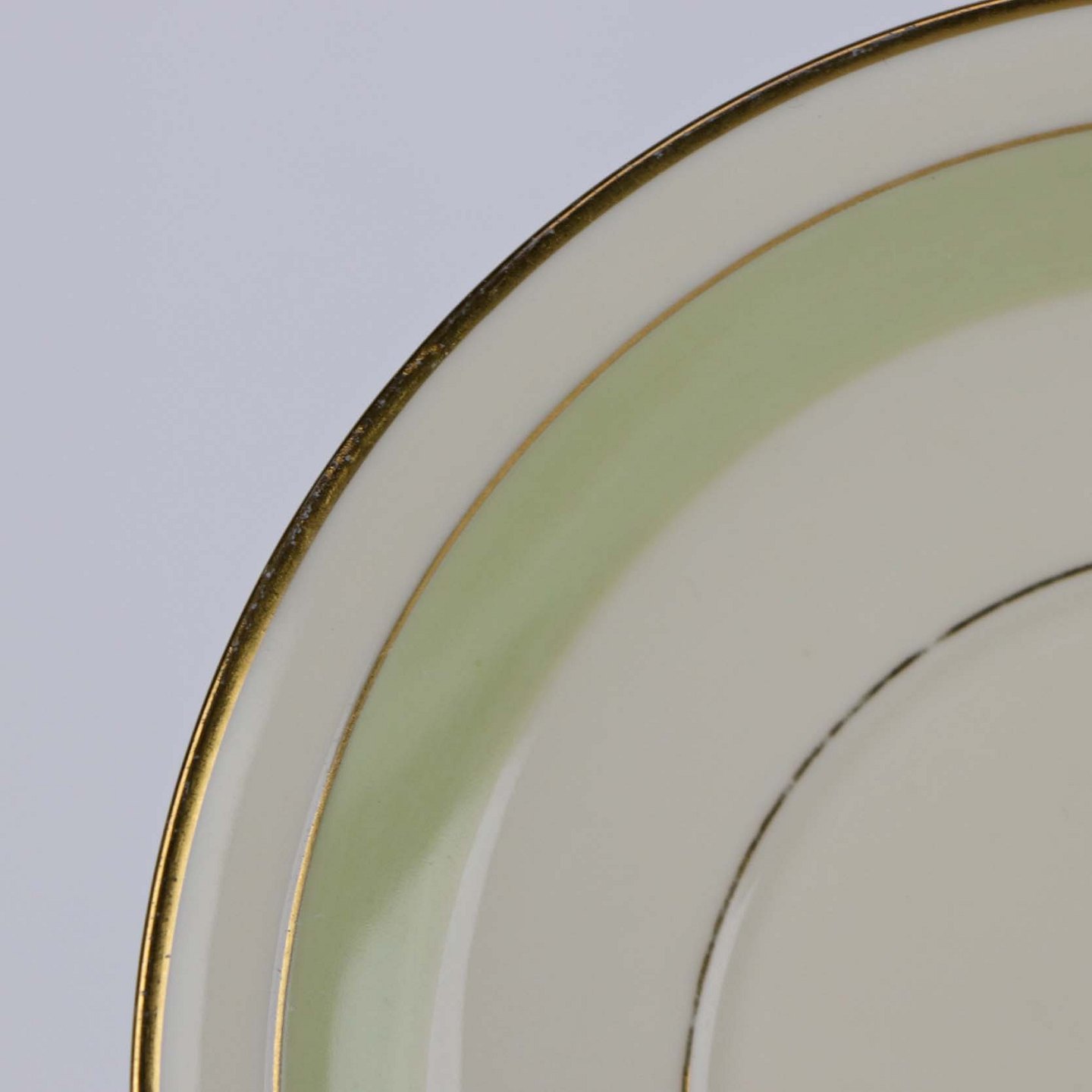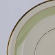 Stellet er fremstillet i glat cremefarvet porcelæn med lysegrøn dekoration og guldkant.