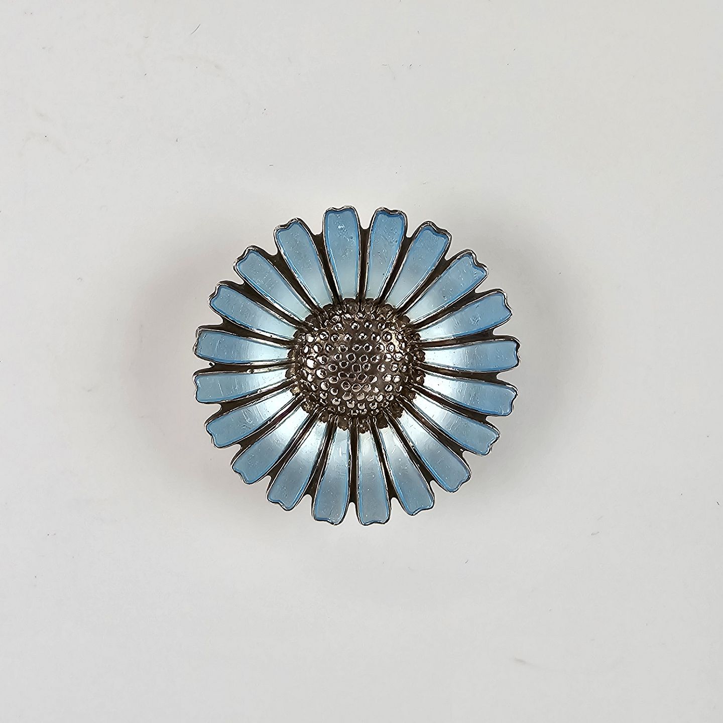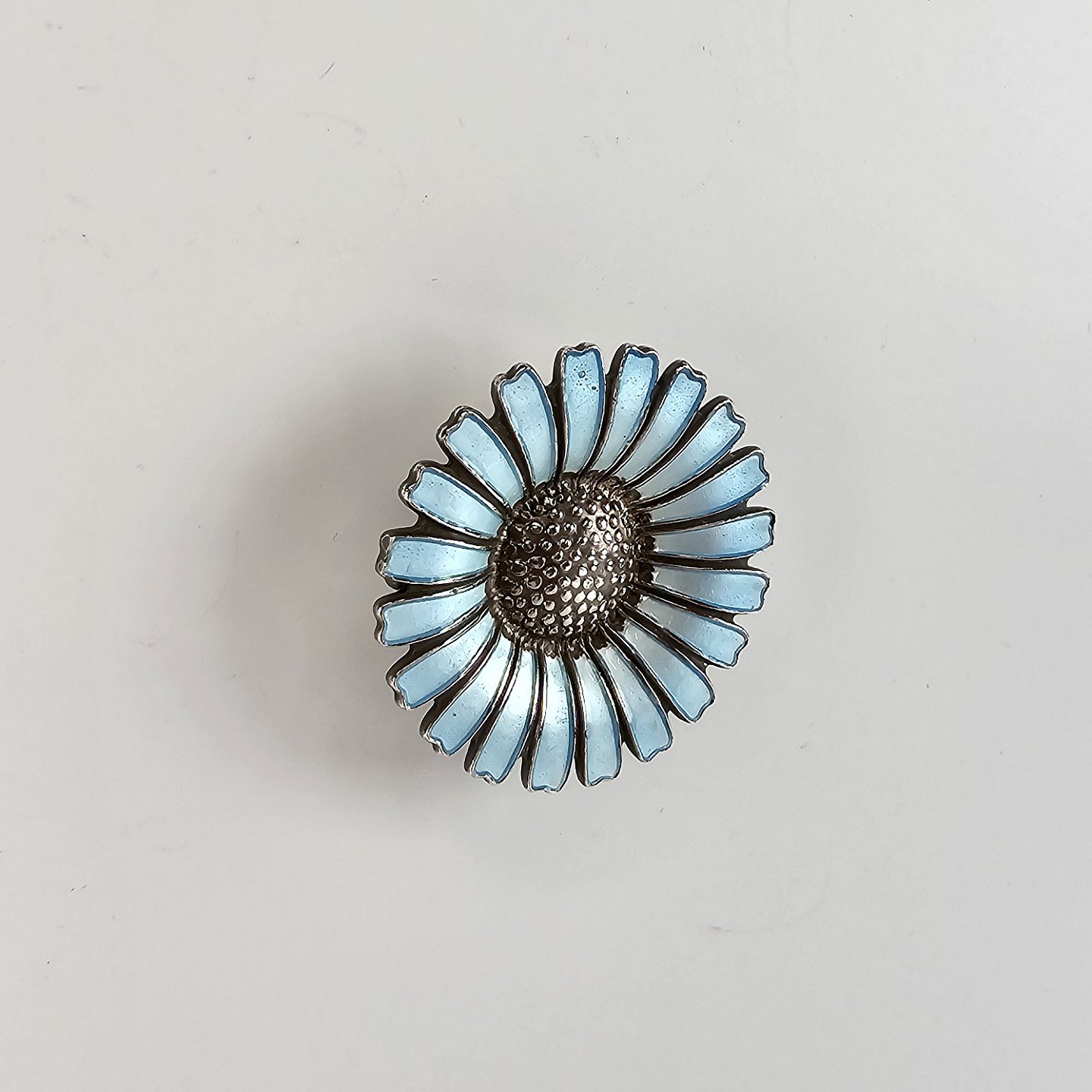 Marguerit/Daisy broche i sterling sølv med lys blå emalje