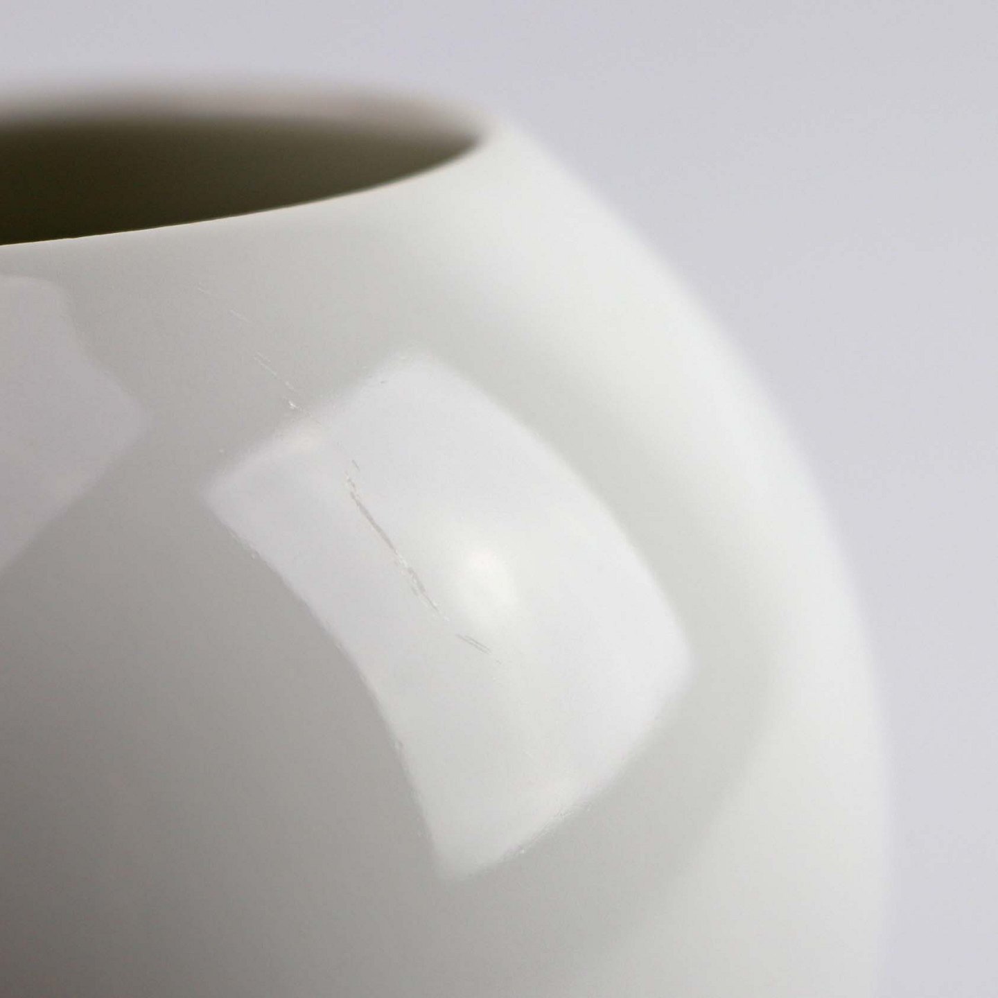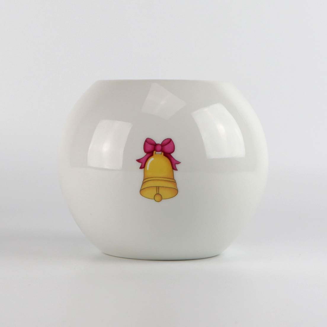 Kuglevase i porcelæn med motiv af vinterklædt pige med pakker samt juleklokke med rød sløjfe på bagsiden. Nr. 5411