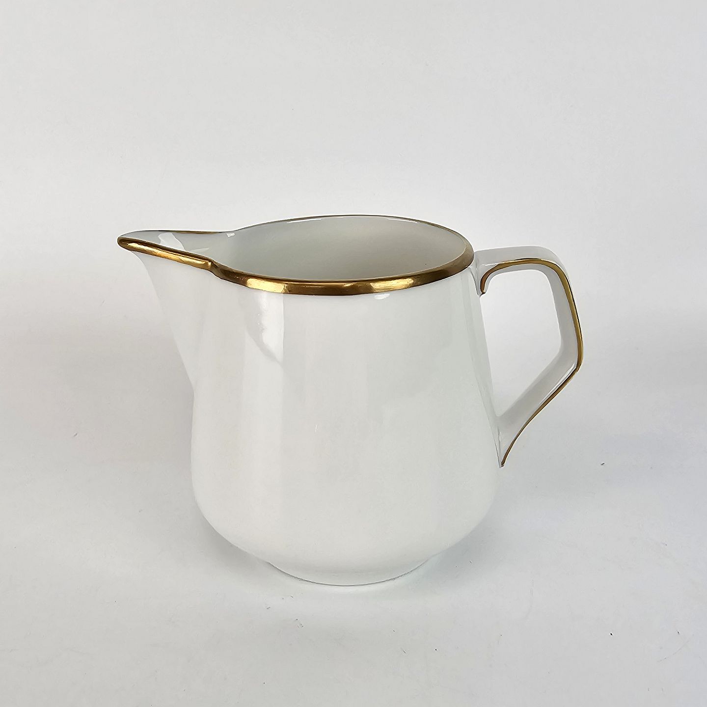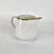 Vega er hvidt porcelæn med guldkant. Tallerkener og fade er dekoreret med riller i kanten. Kan fremstår med brugsspor