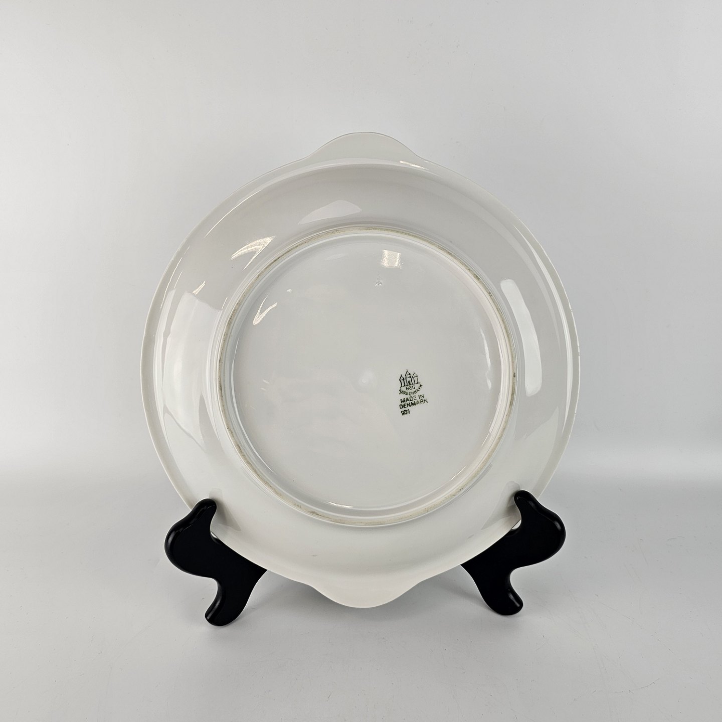 Vega er hvidt porcelæn med guldkant. Tallerkener og fade er dekoreret med riller i kanten. Kan fremstår med brugsspor