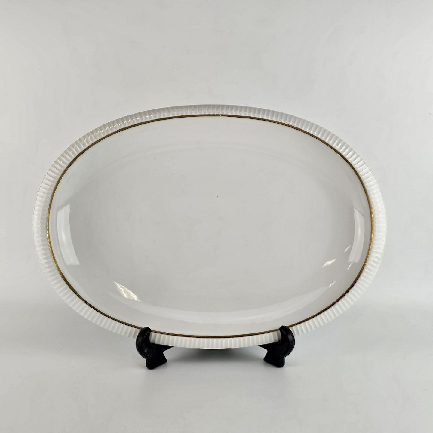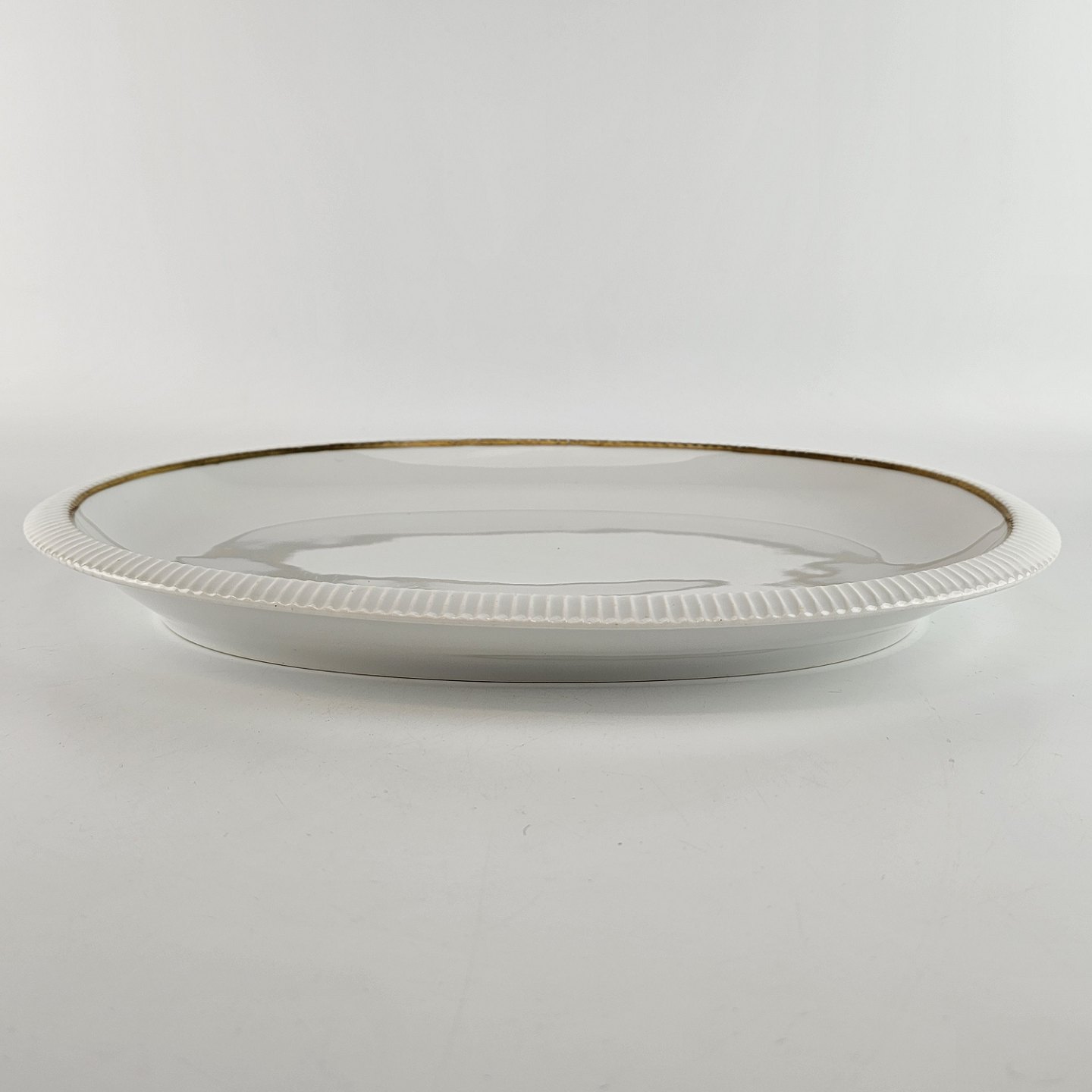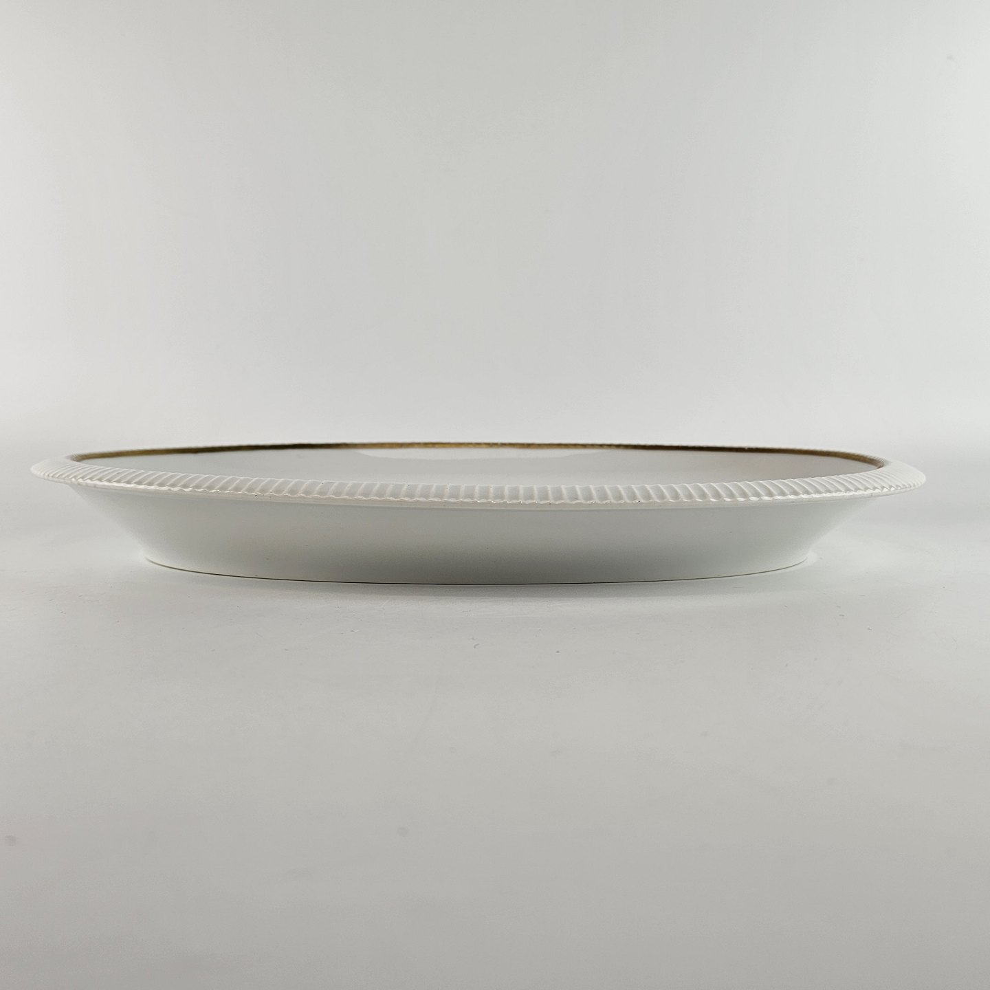 Vega er hvidt porcelæn med guldkant. Tallerkener og fade er dekoreret med riller i kanten. Kan fremstår med brugsspor