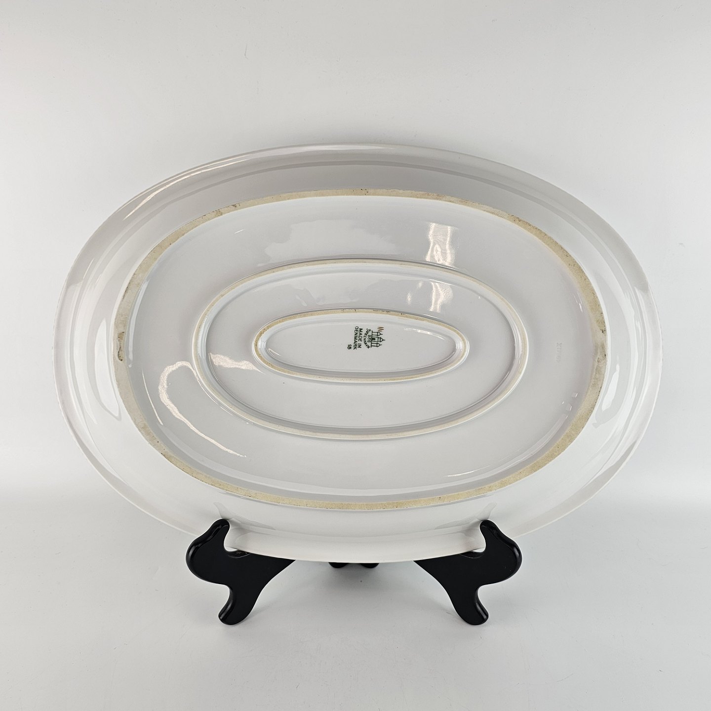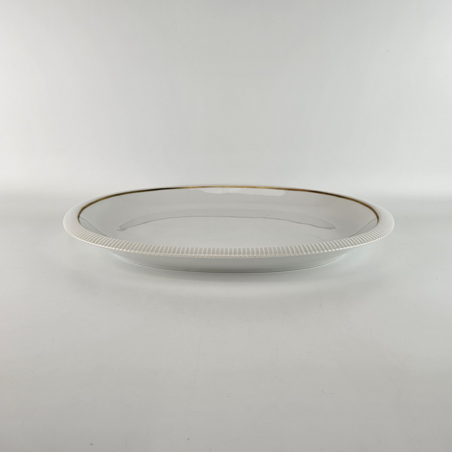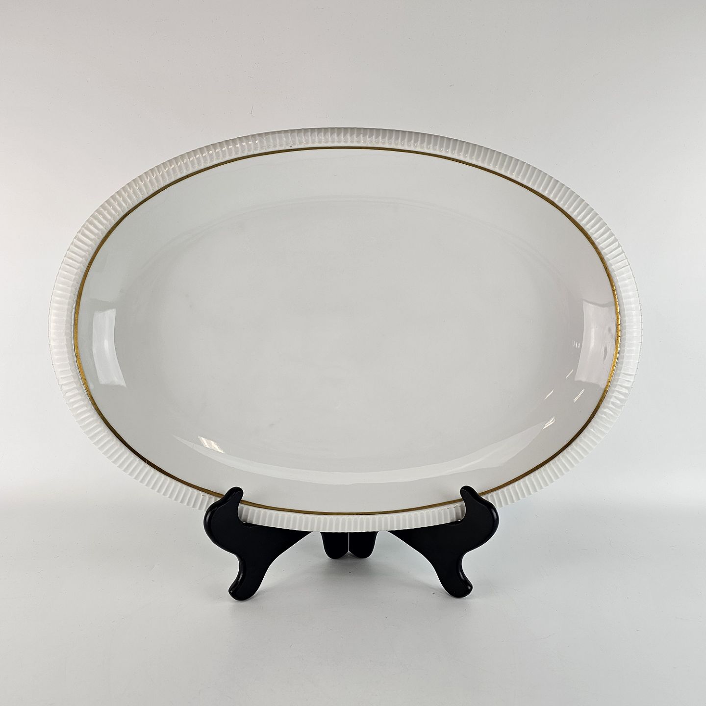 Vega er hvidt porcelæn med guldkant. Tallerkener og fade er dekoreret med riller i kanten. Kan fremstår med brugsspor