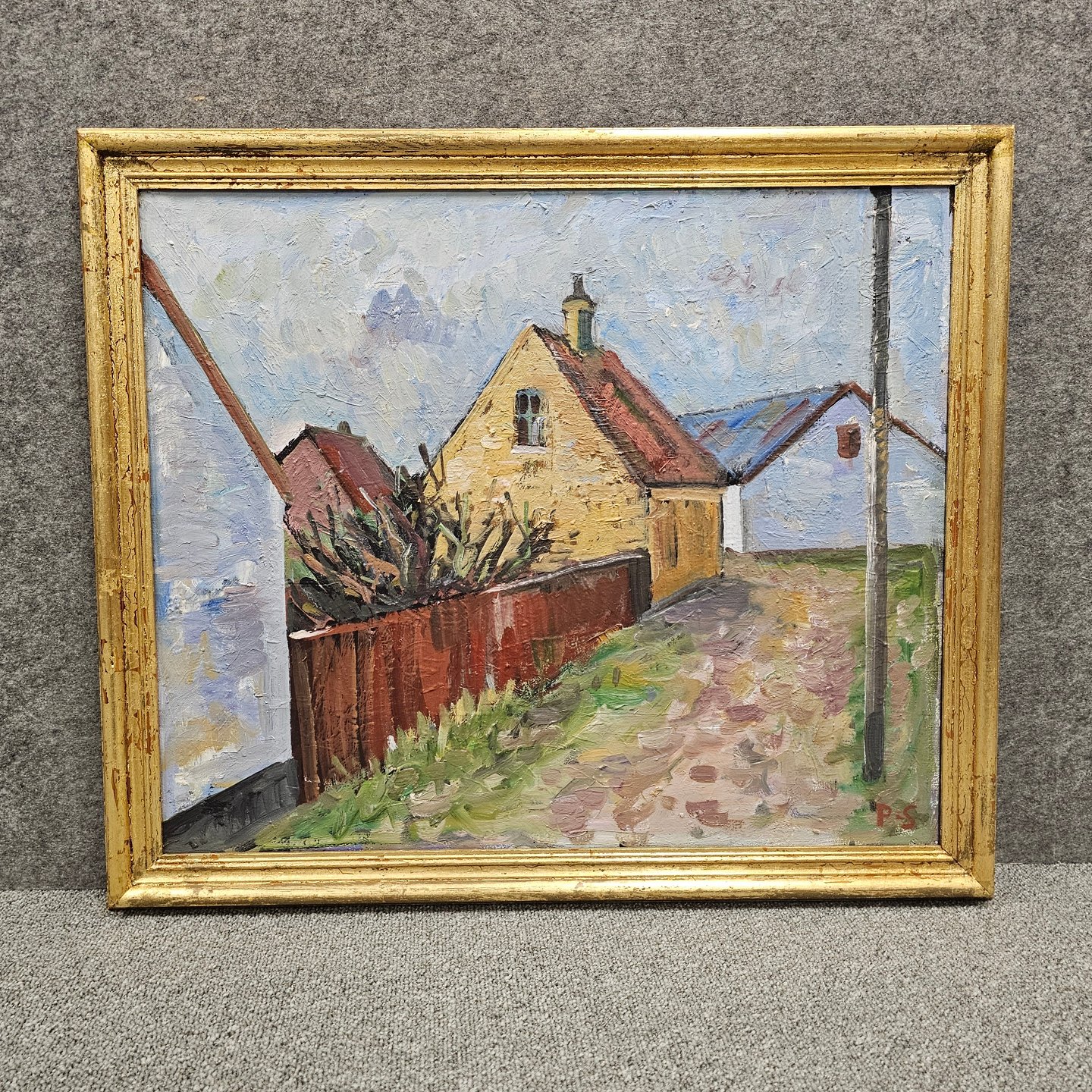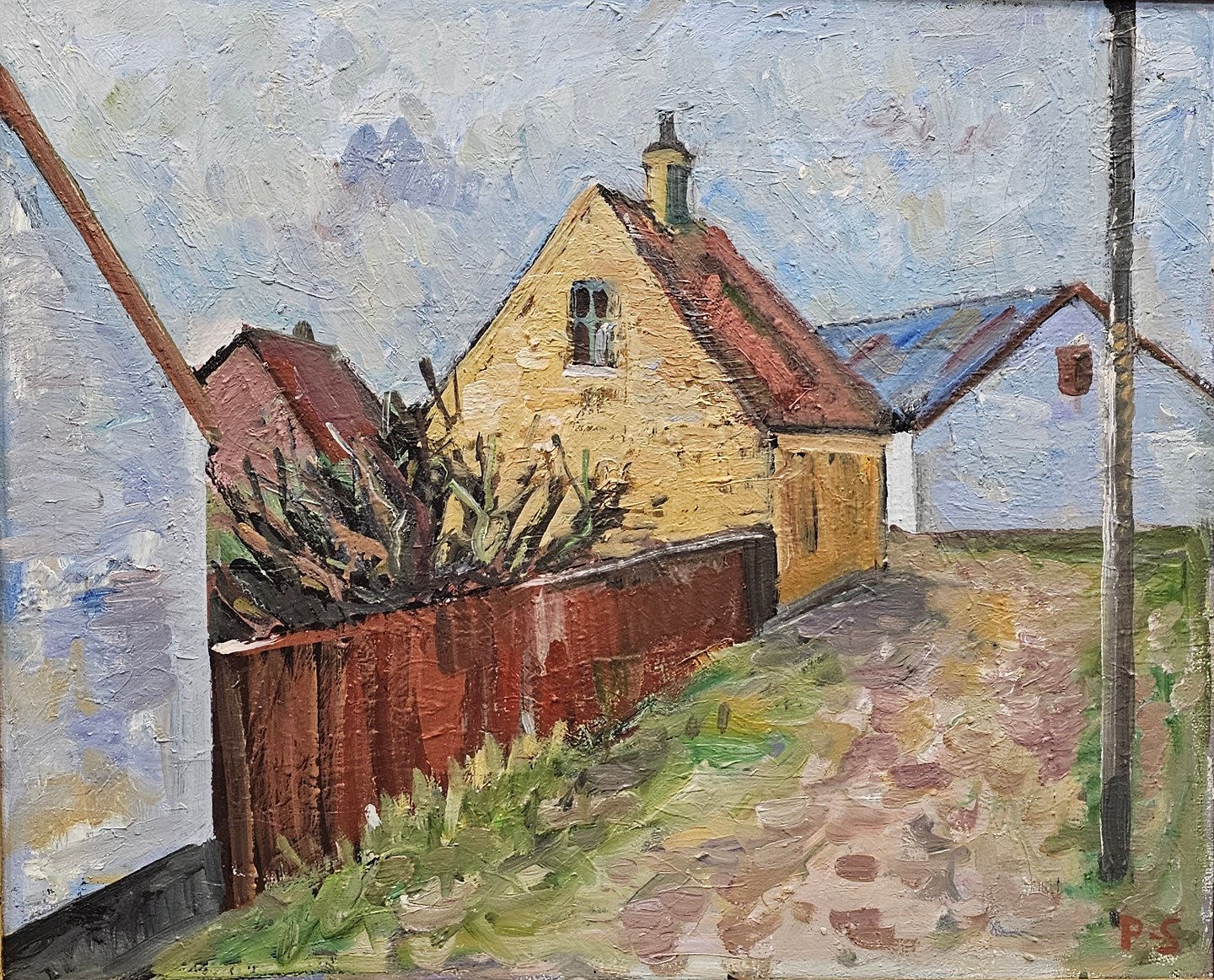 Maleri af olie på lærred. Motiv af hvide hus, gult hus og et rødt hegn
