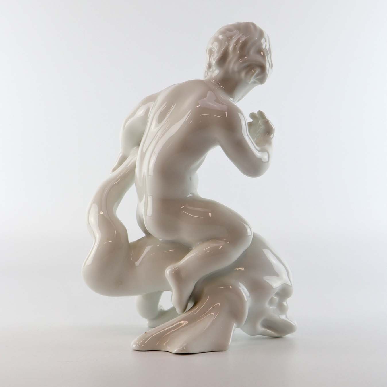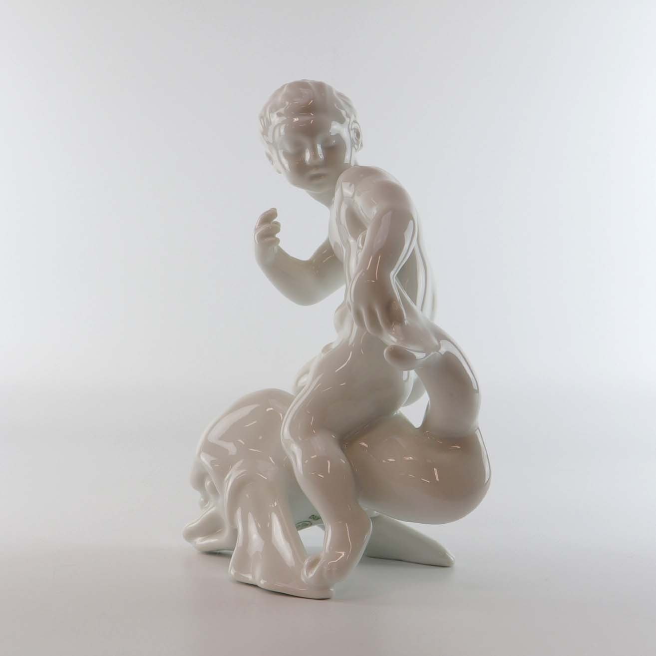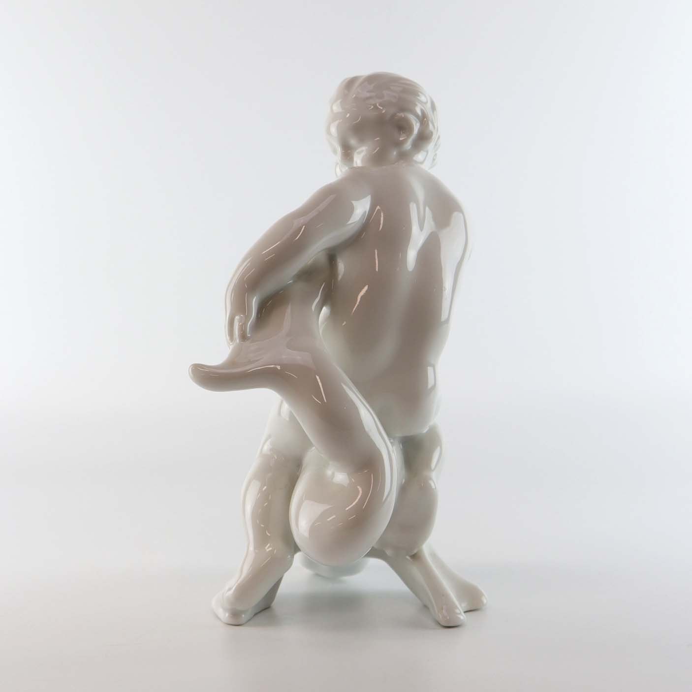 Blanc de chine figur i hvid porcelæn med motiv af dreng siddende på en delfin. Nr. 4060