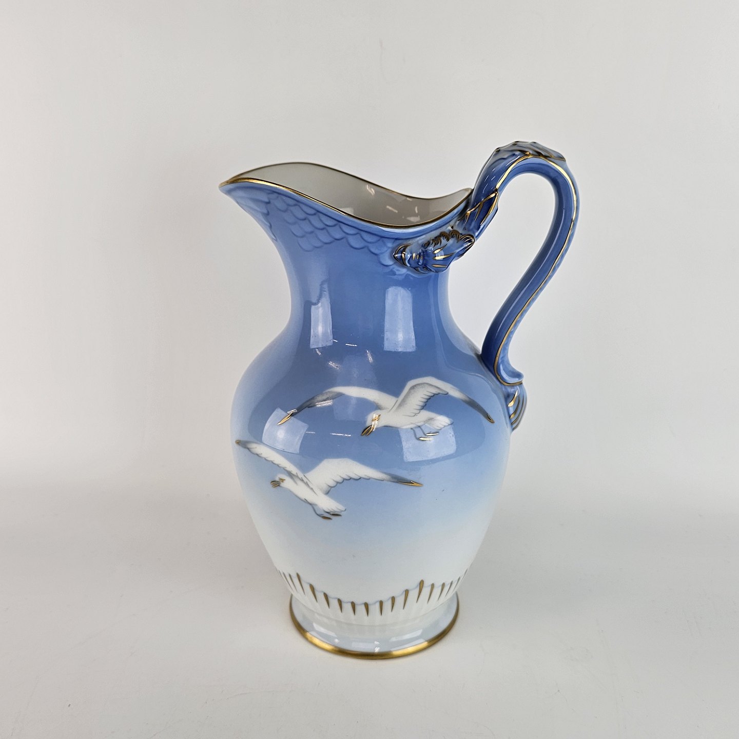 Krukke af porcelæn i blålige farver med motiv af måger og guldkant