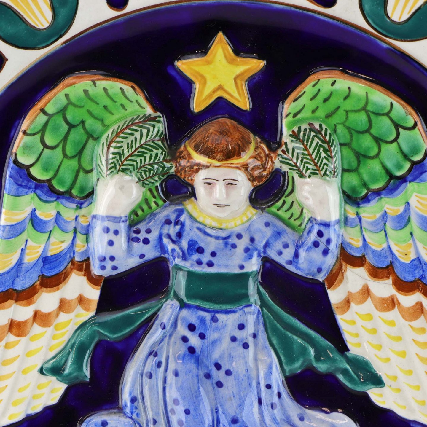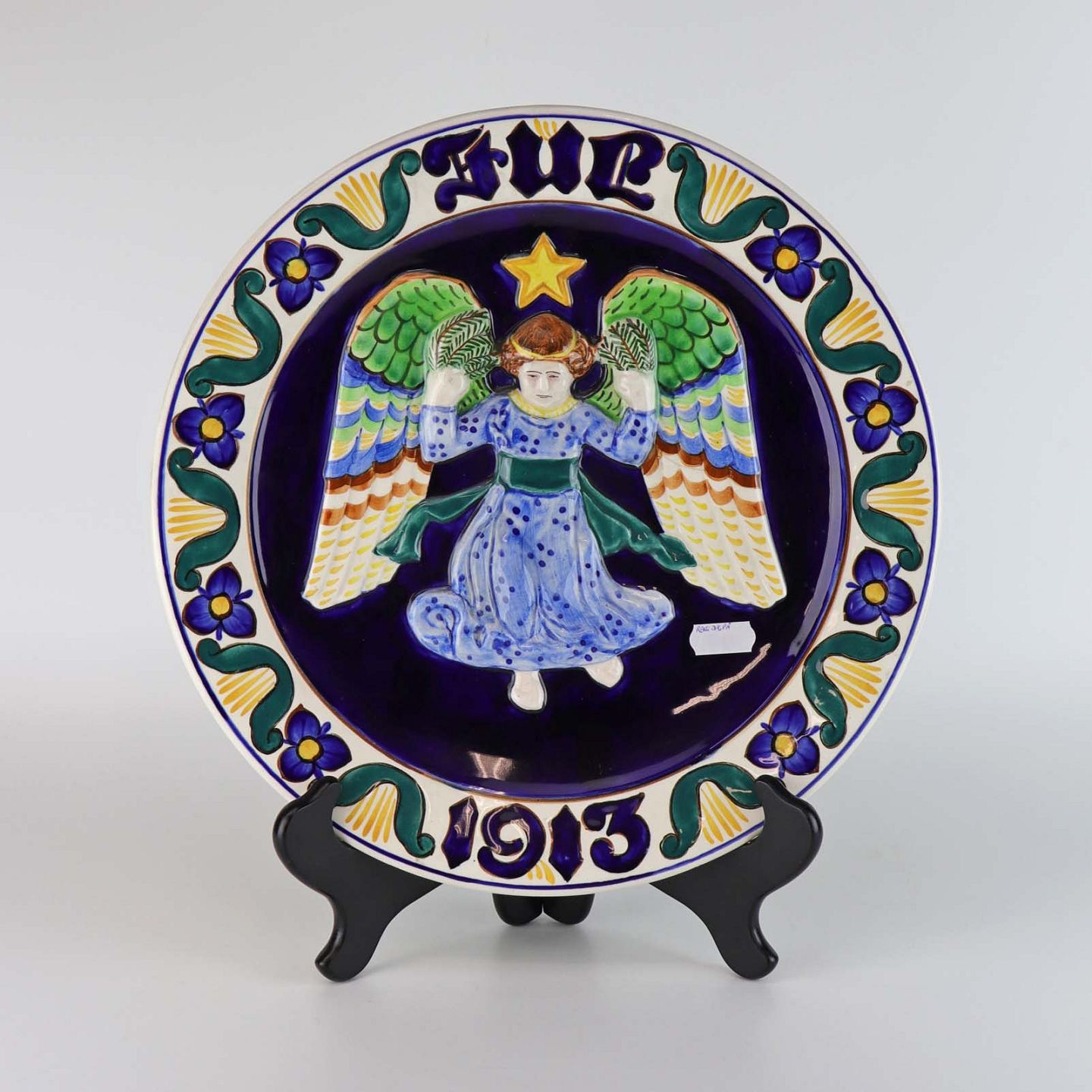 Stor juleplatte i fajance med motiv af en engel med grankviste i hænderne under en julestjerne. Fra år 1913. Nr. 974/792