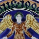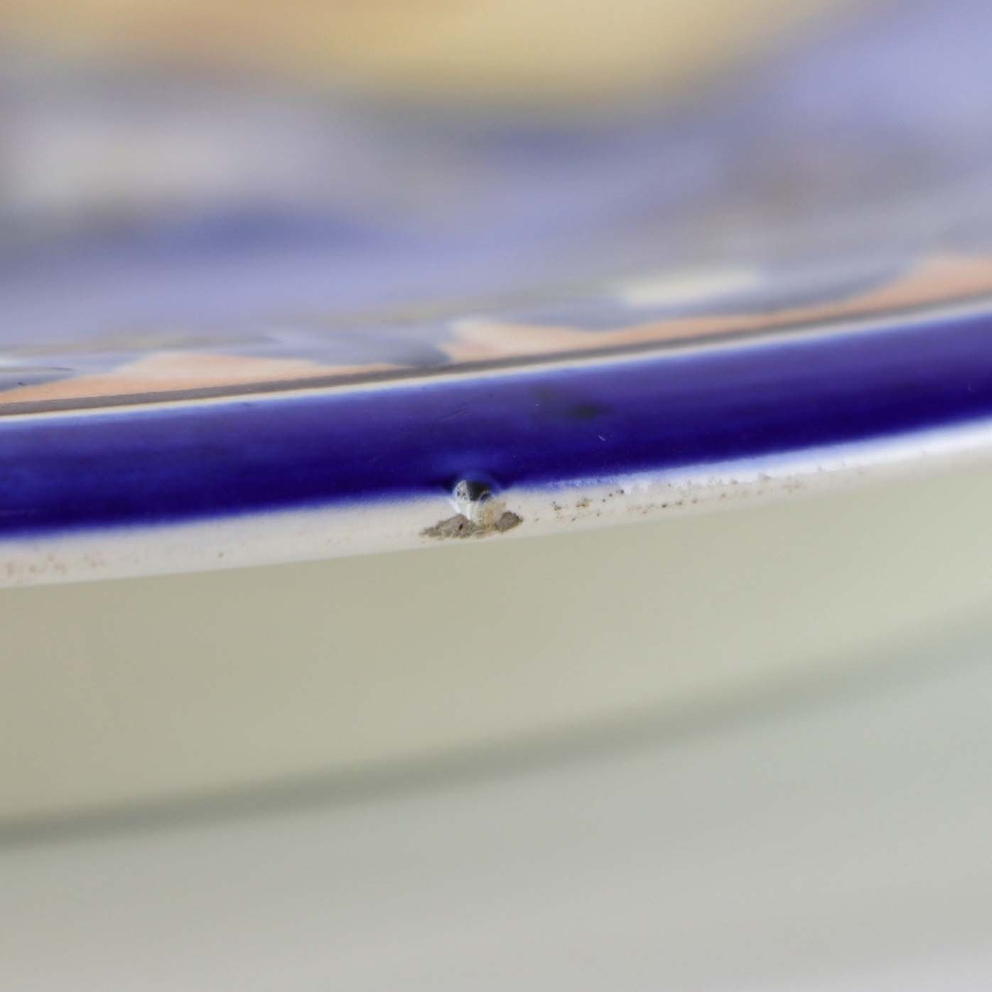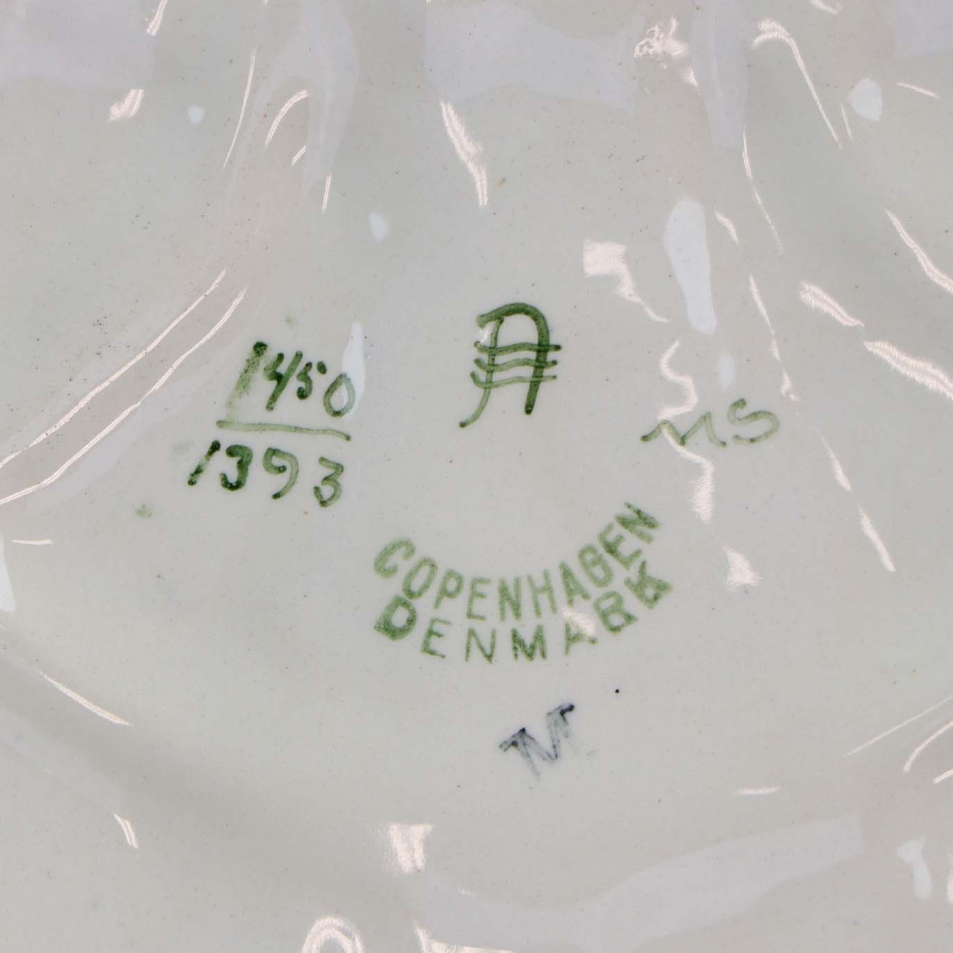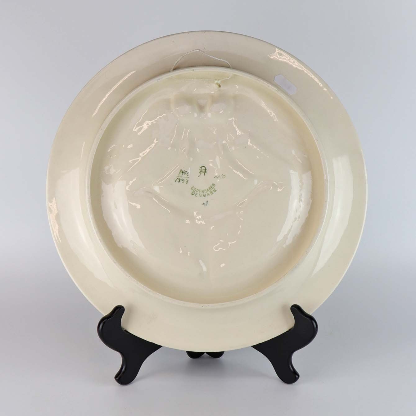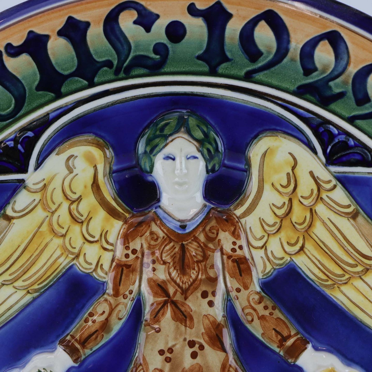 Stor juleplatte i fajance med motiv af en svævende engel med guirlande af gran i hænderne. Fra år 1929. Nr. 1450/1393