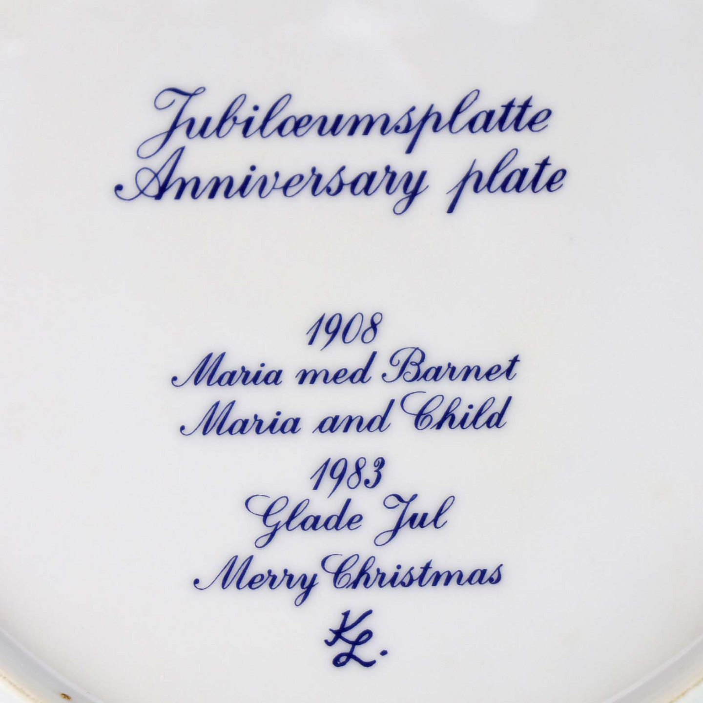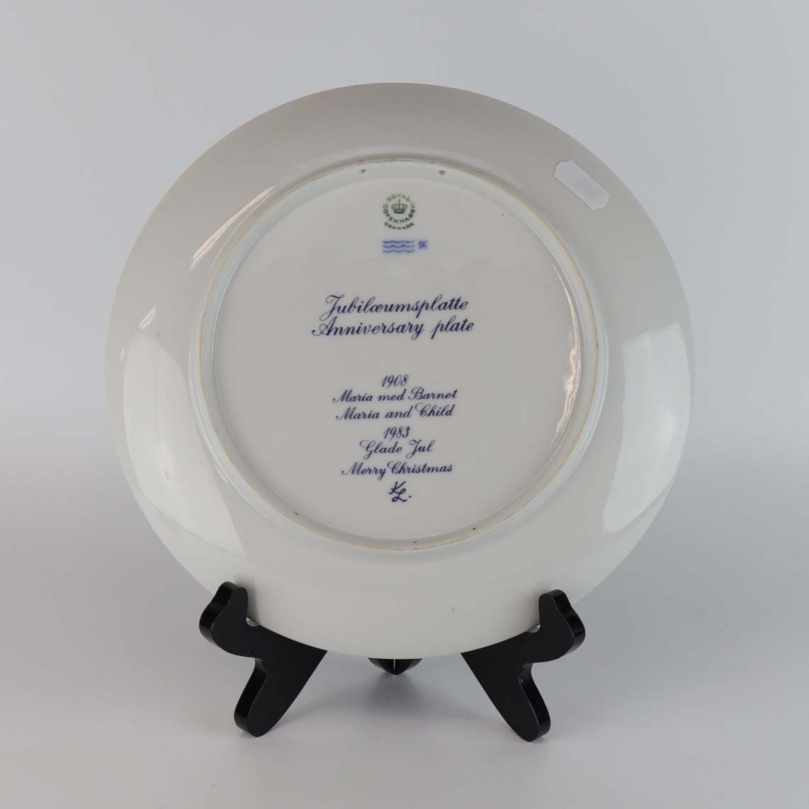 Kongelig platte i porcelæn med motiver af to juleplatter samlet i én. Juleplatte år 1908 med Jomfru Maria og barnet, samt julemotivet fra år 1983 glade jul