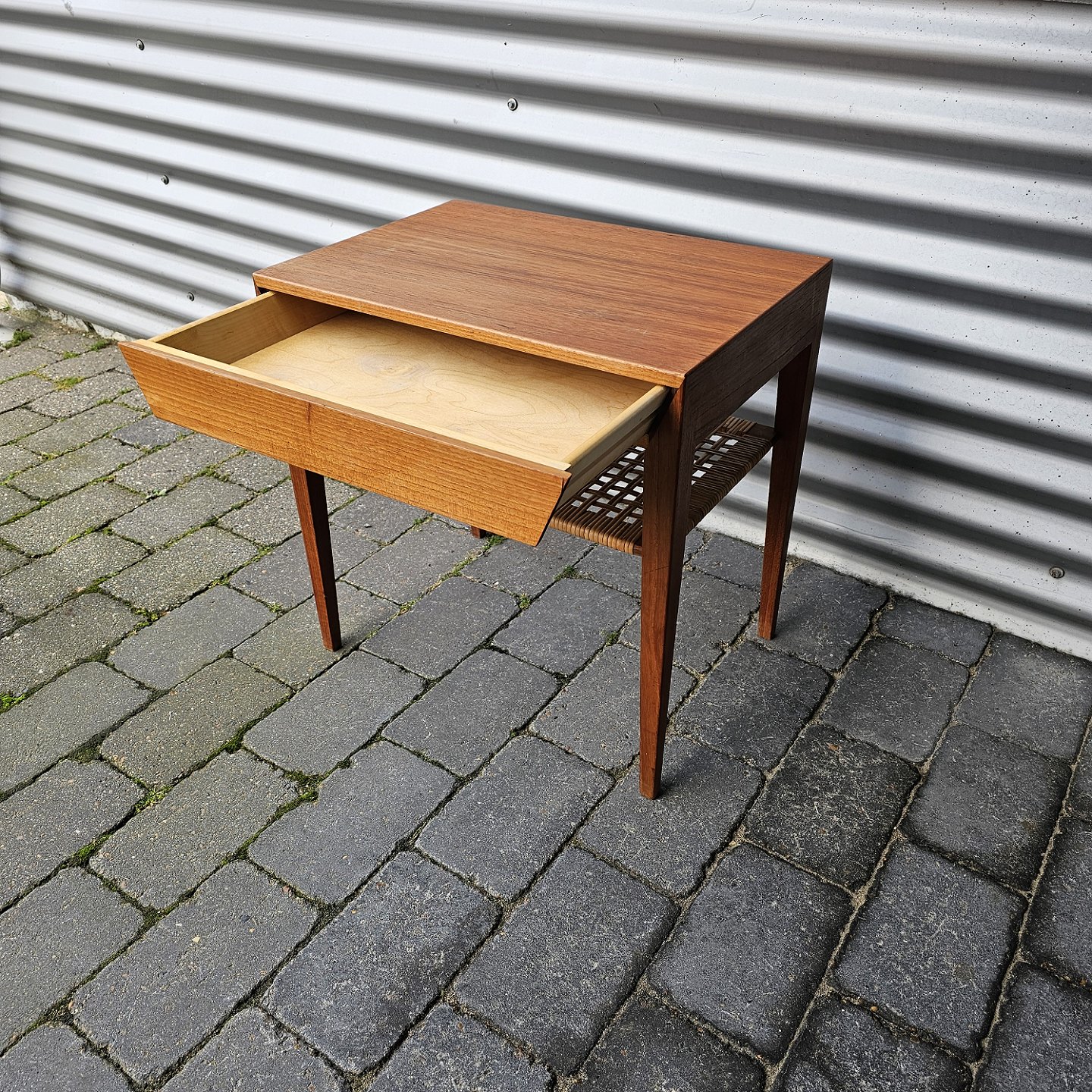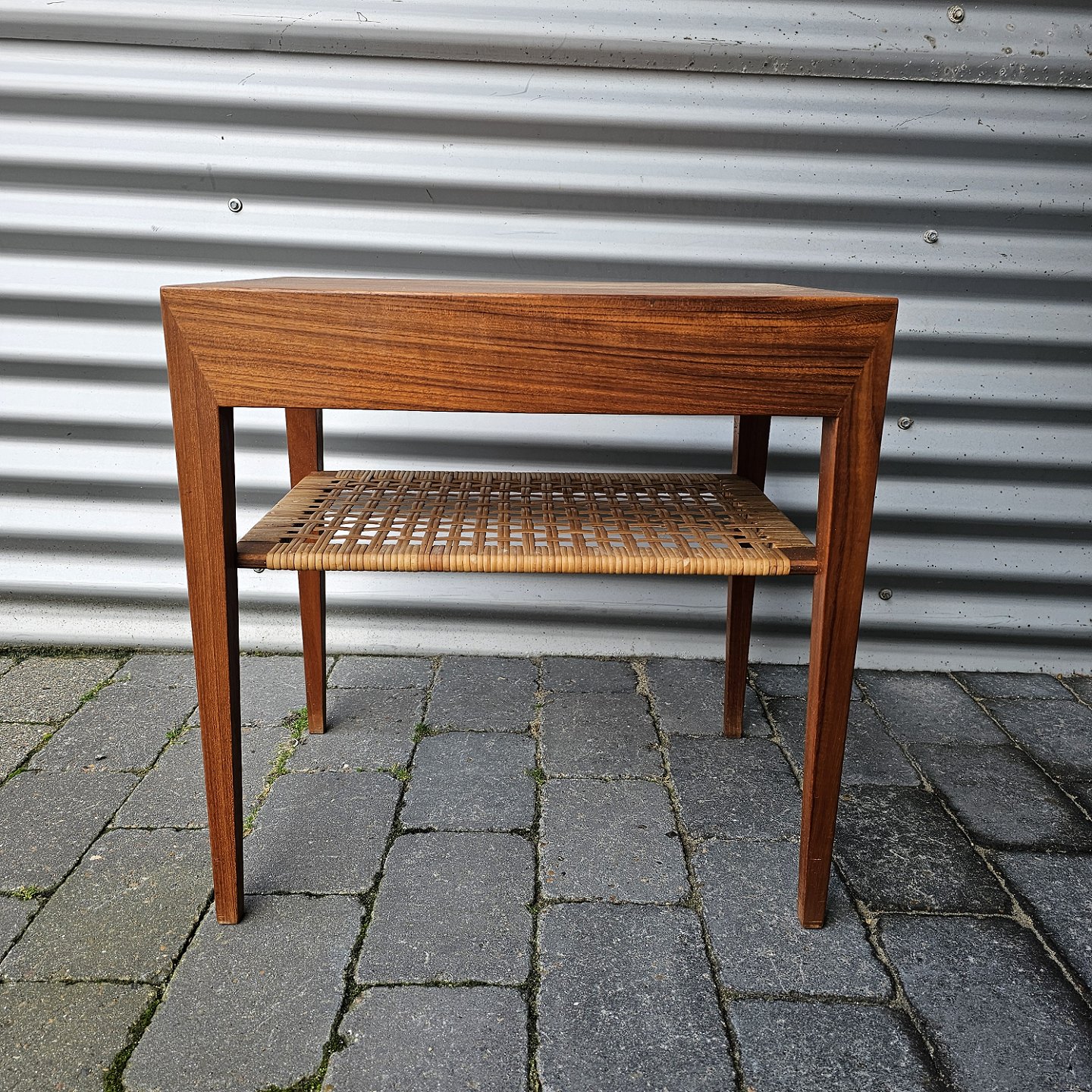 Sengebord i teak med hylde og skuffe.