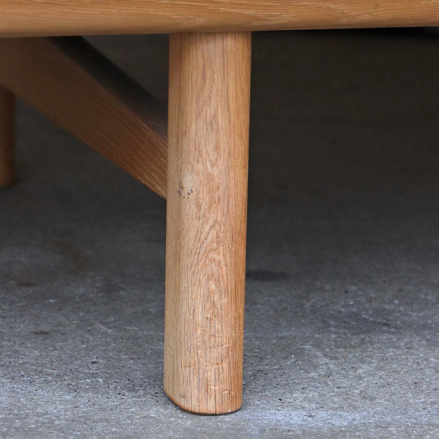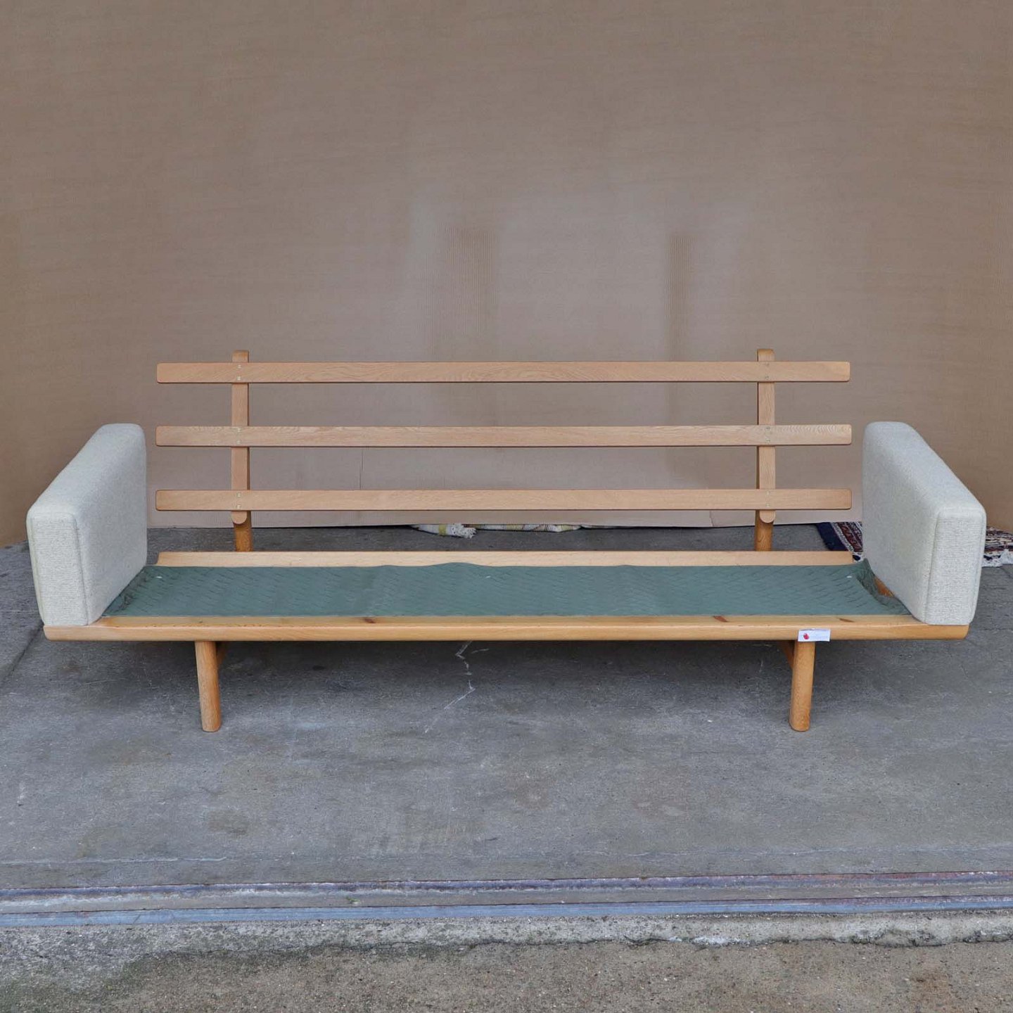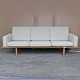 Tre personers sofa med stel i sæbebehandlet egetræ og hynder med springfjeder, som er betrukket med lyst uldstof. Model GE-236
