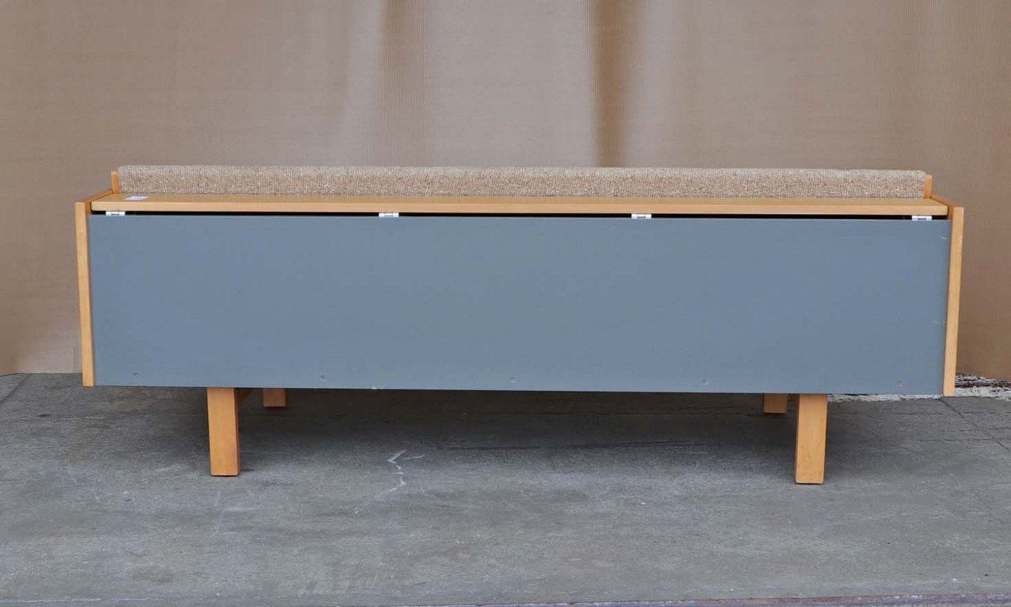 Tre personers sofa med stel i lakeret bøgetræ. Sæde og ryglæn er betrukket med meleret beige uldstof. Model GE-258