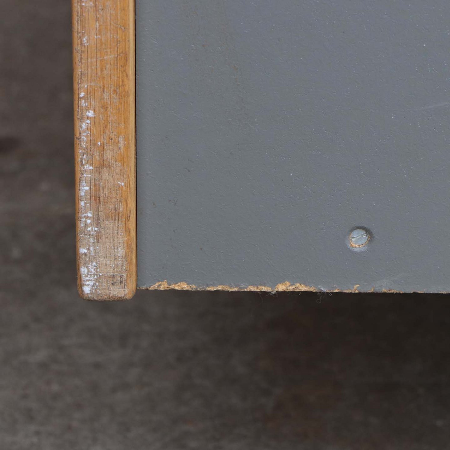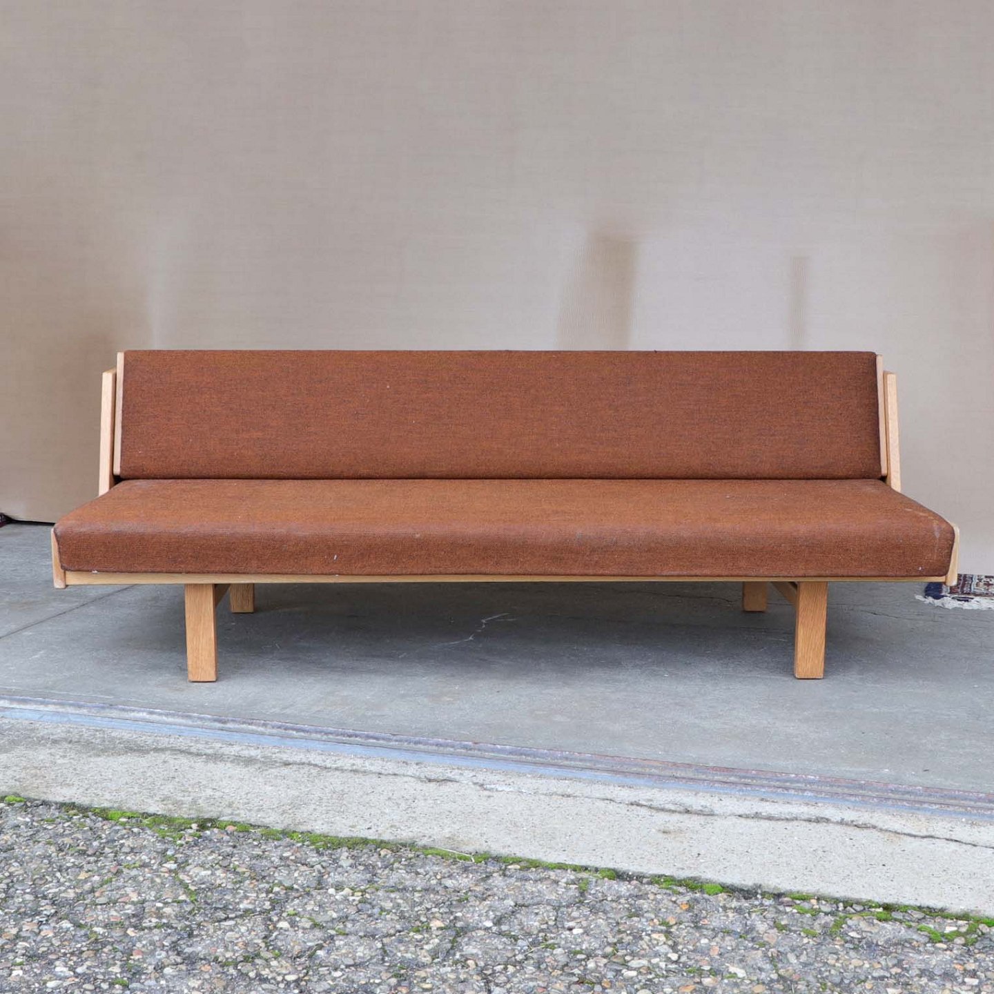 Tre personers sofa med stel i lakeret egetræ. Sæde og ryglæn er betrukket med meleret brunt uldstof. Model GE 258