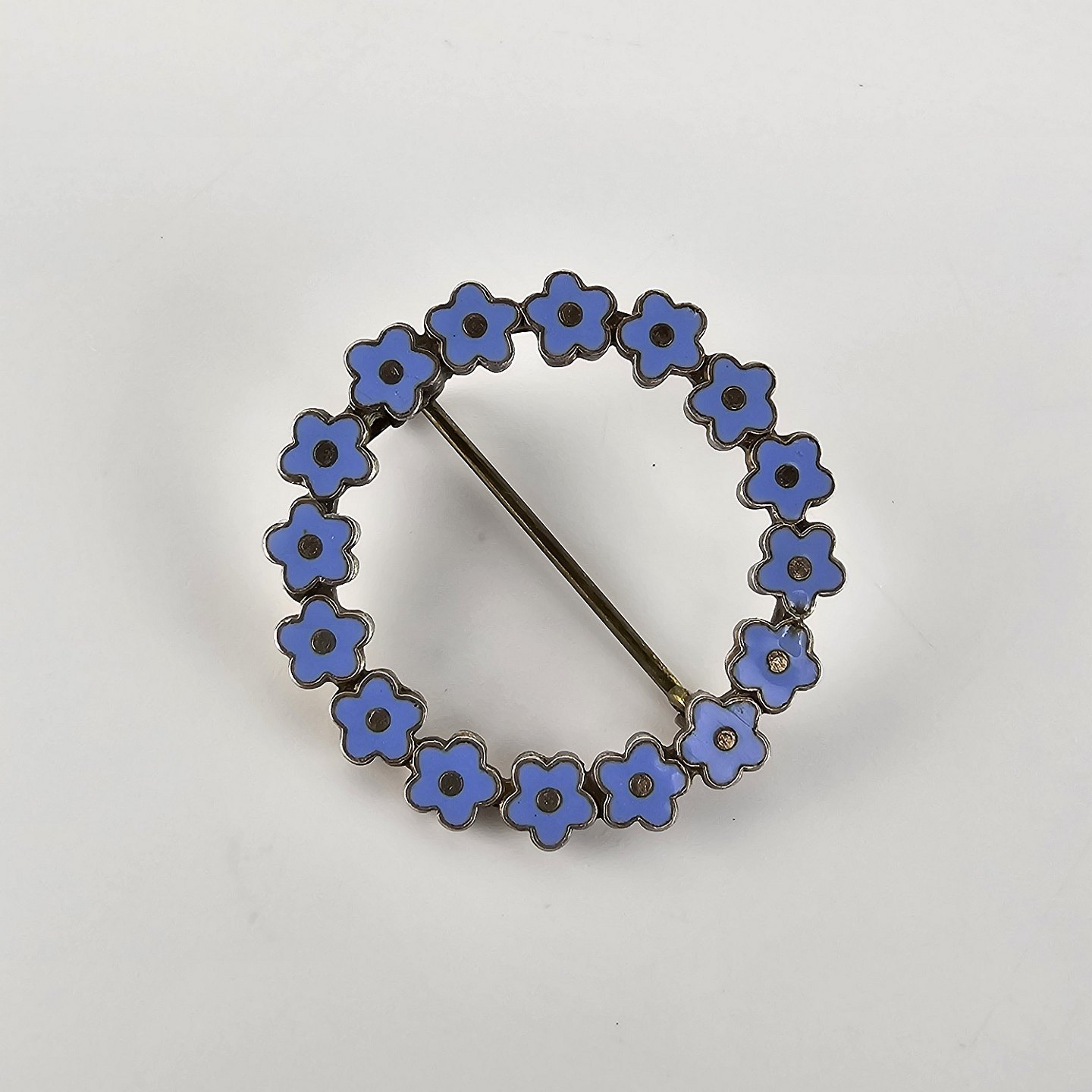 Rund forglem-mig-ej broche i forgyldt sterlingsølv og blåt emalje.