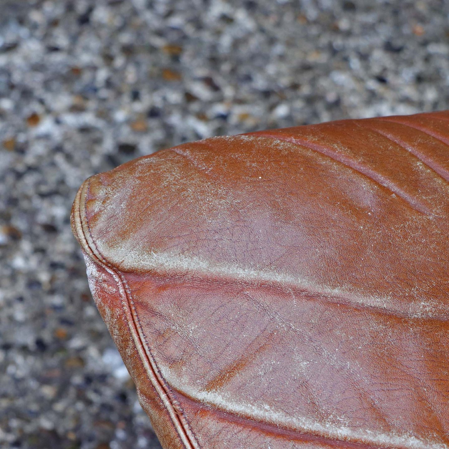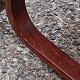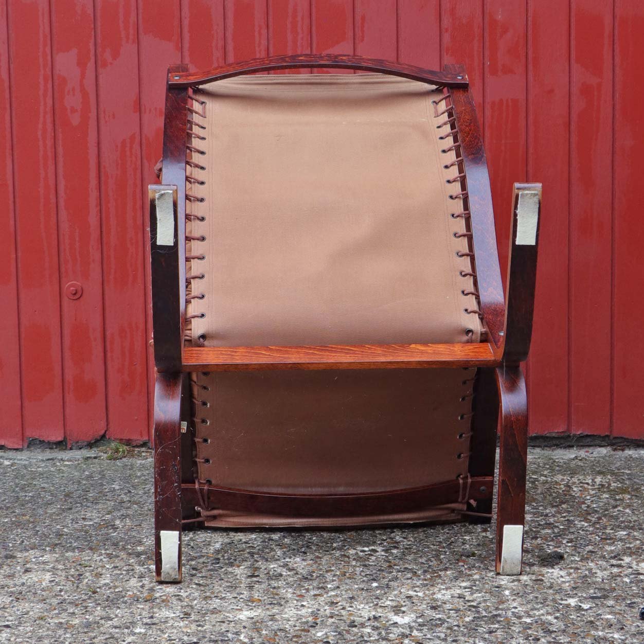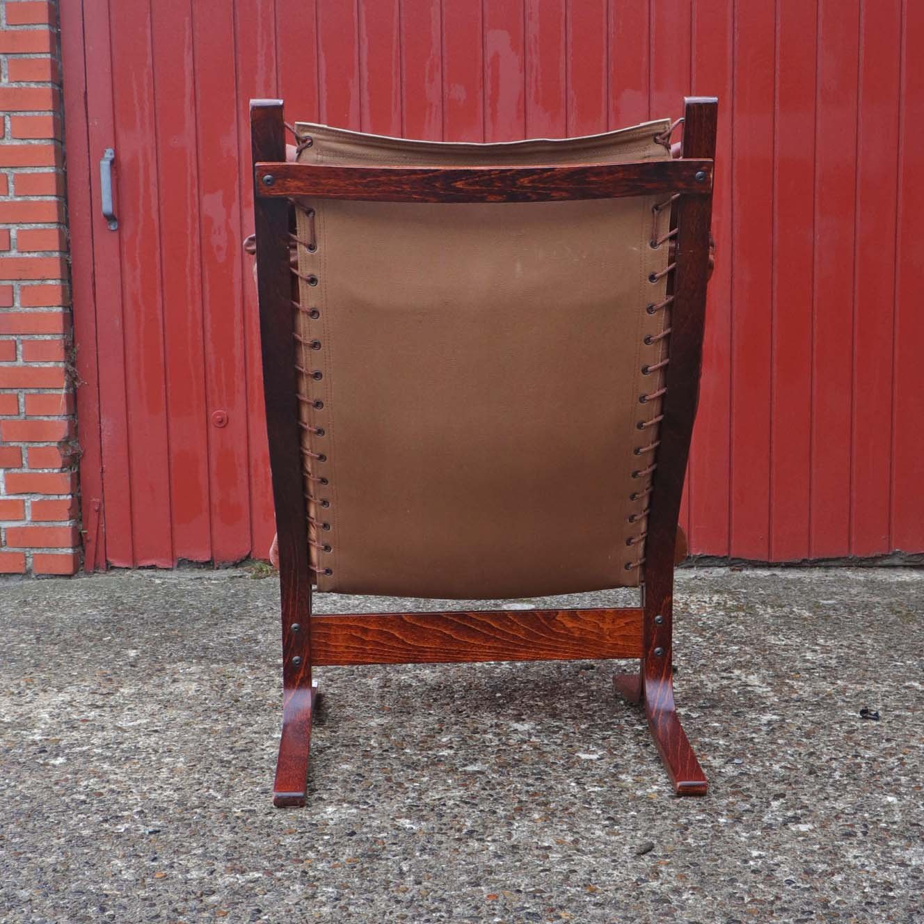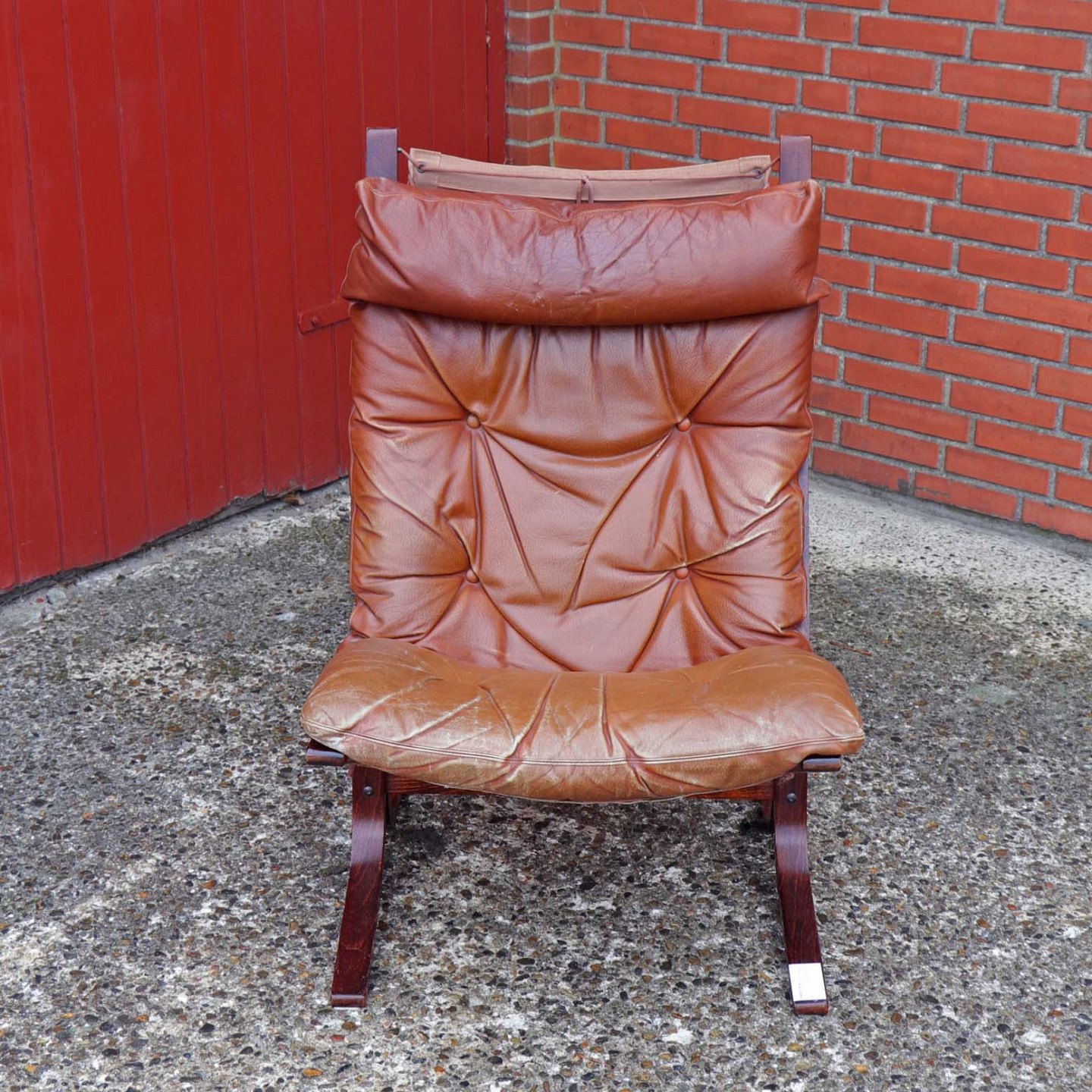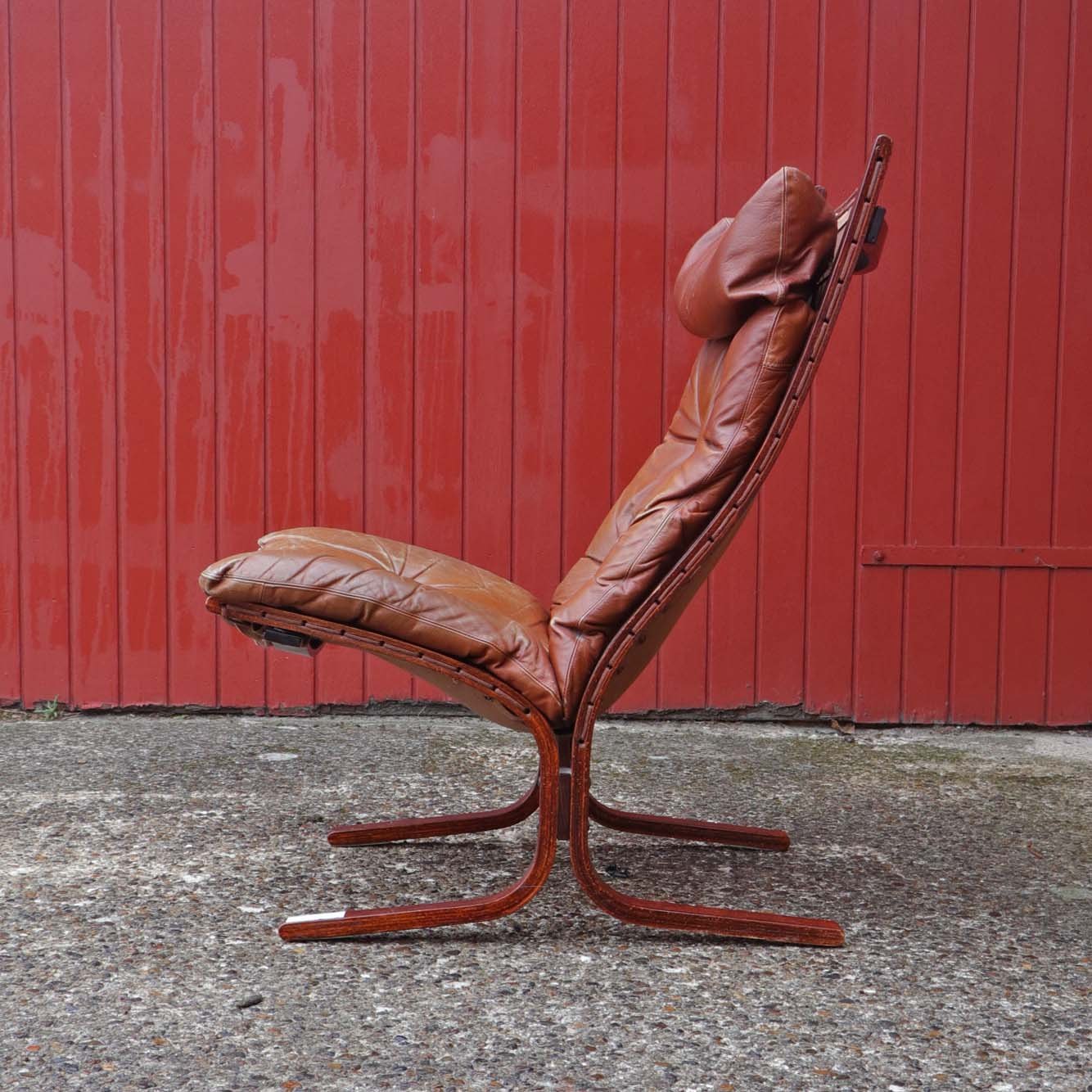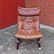 Lænestol med nakkepude og stel i formbøjet lakeret mørkt træ. Stol er betrukket med brunt læder. Model Siesta med høj ryg