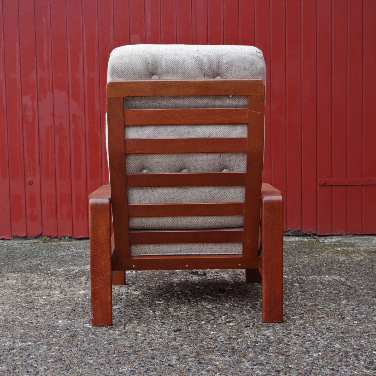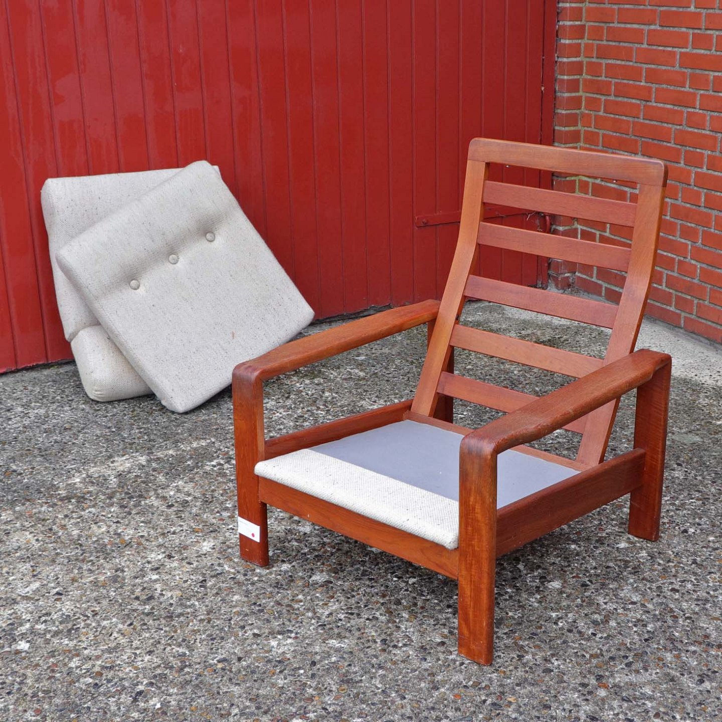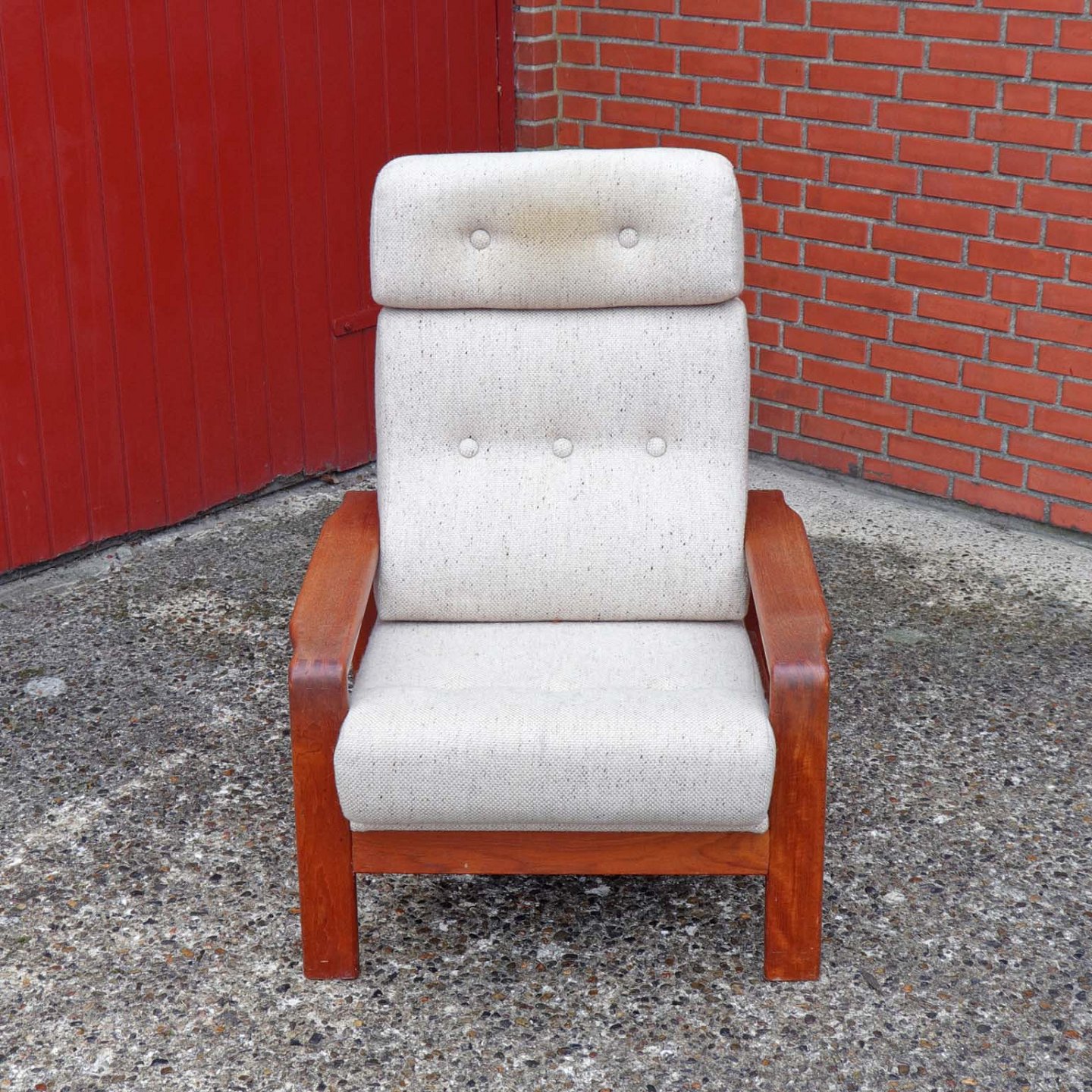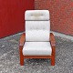 Højrygget lænestol med stel i lakeret teaktræ og hynder betrukket med lyst uldstof.