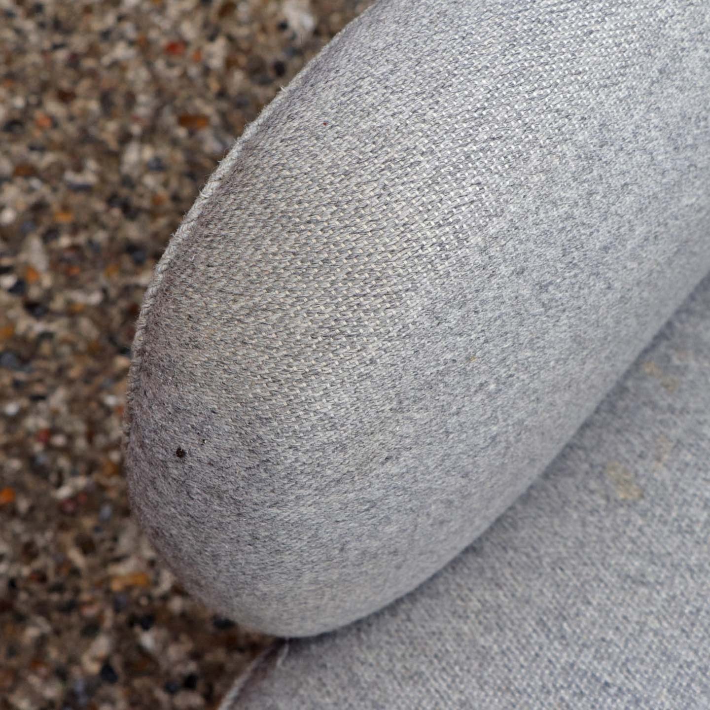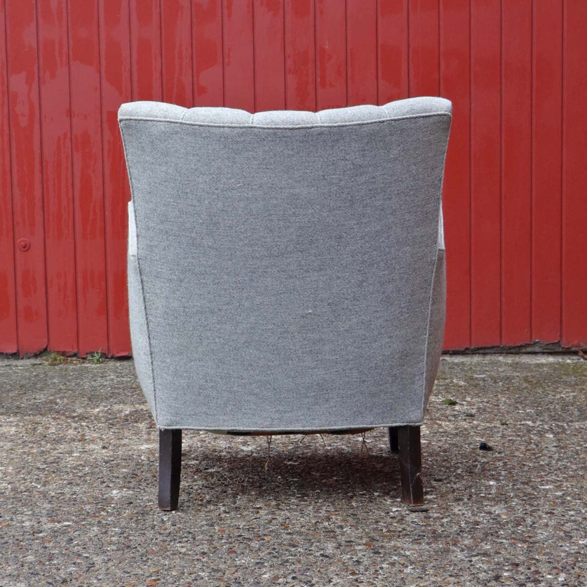 Lænestol med springfjeder sæde og ben i lakeret mørkt træ. Stolen er betrukket med lysegrå uldstof.