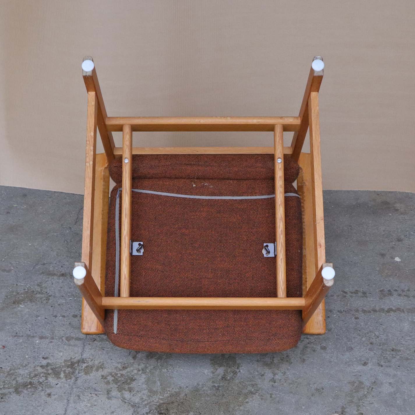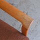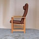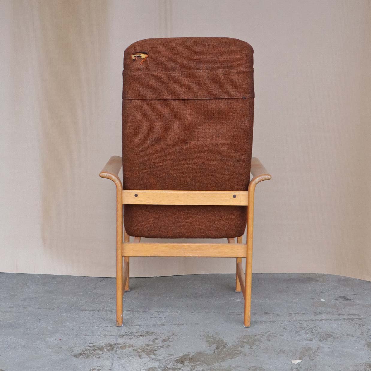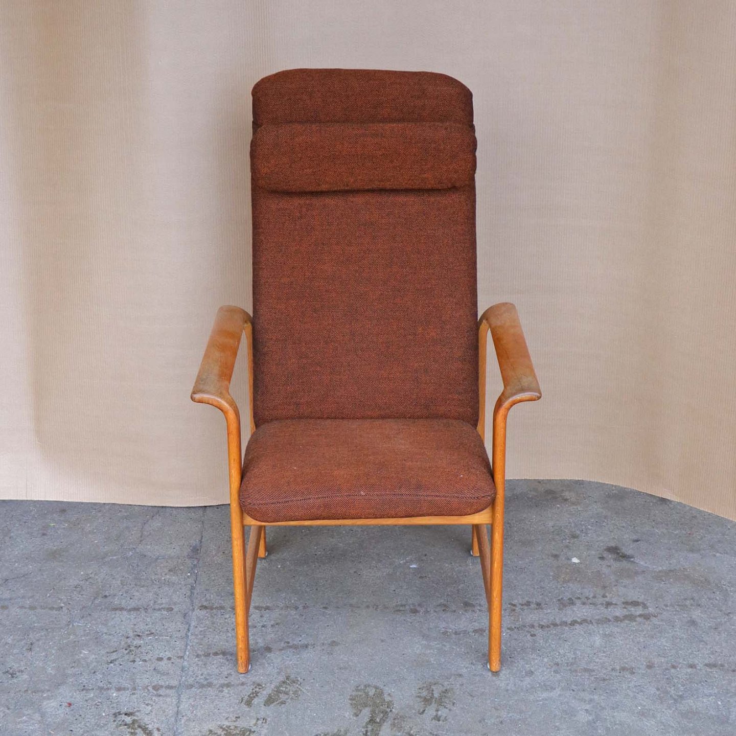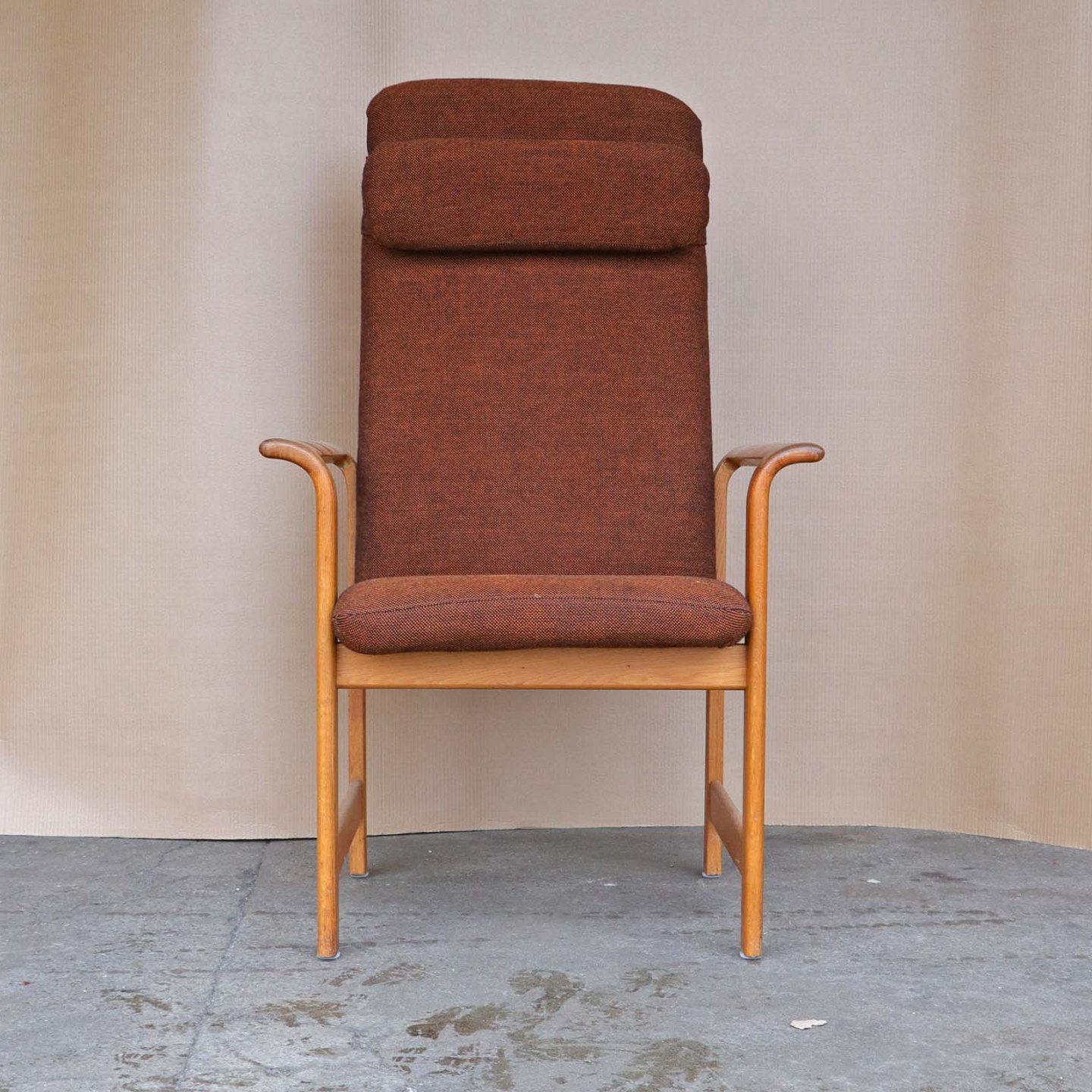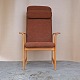 Højrygget armstol med polstret ryg og sæde samt nakkepude. Stolen er betrukket med brun meleret uldstof og stellet er i lakeret egetræ