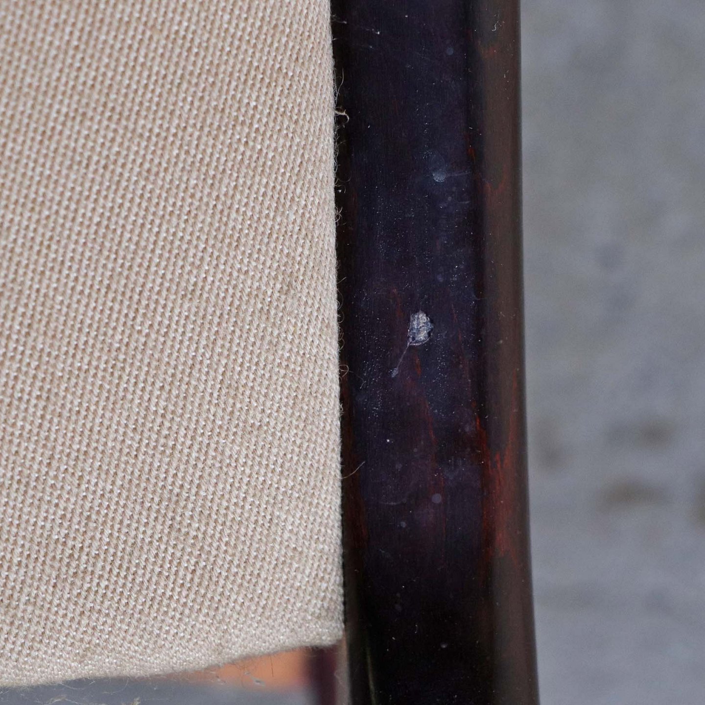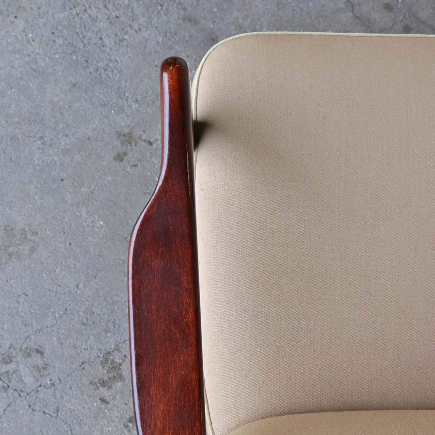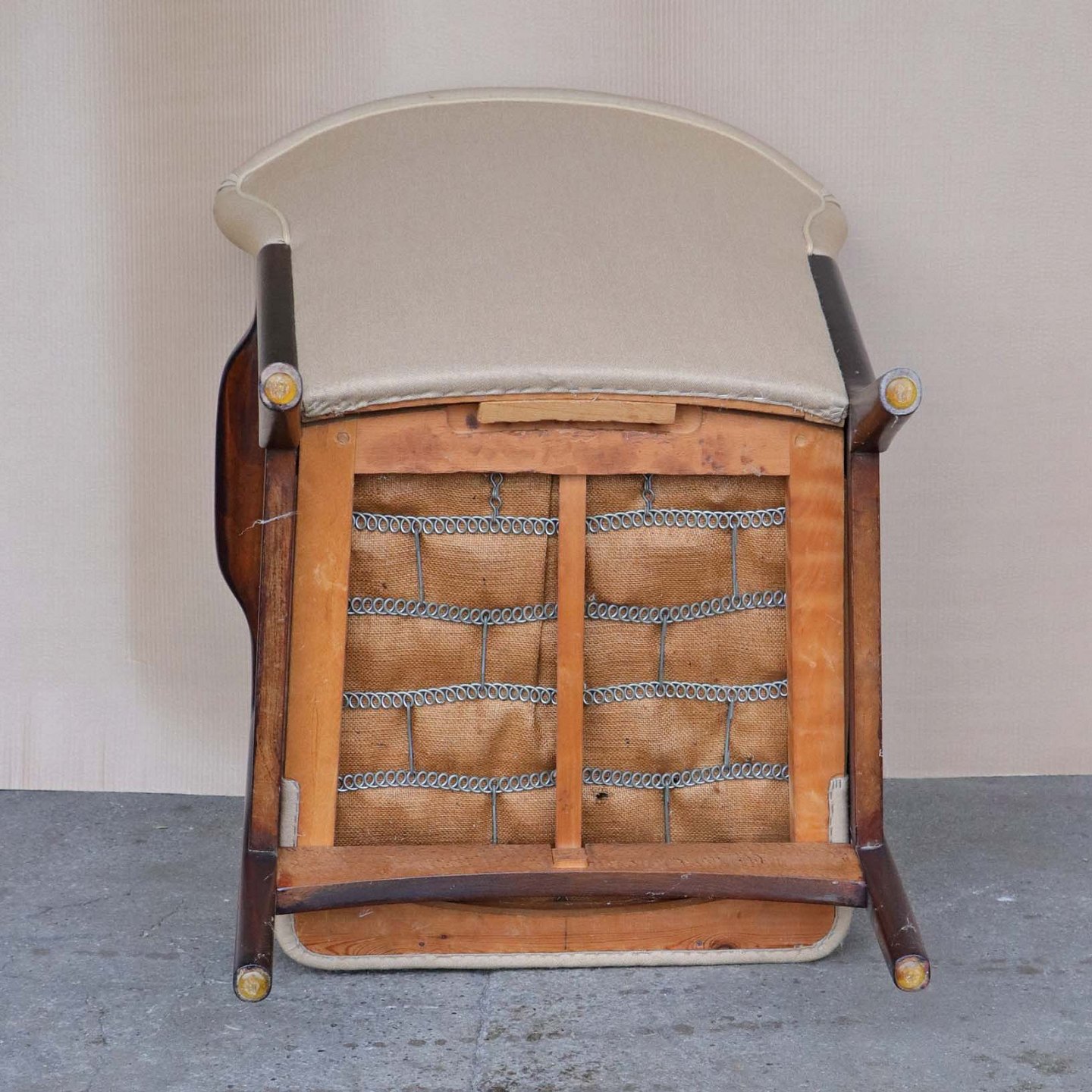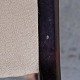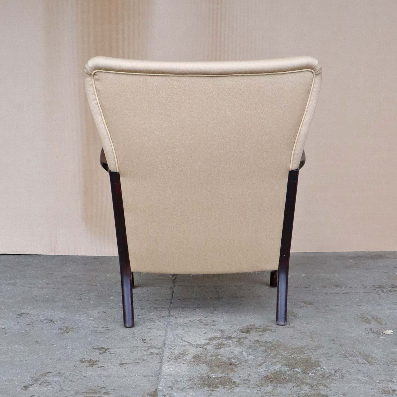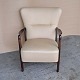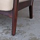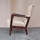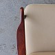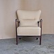 Lænestol med springfjeder sæde. Stolen er betrukket med lys beige uldstof og stellet er i lakeret bejdset bøg