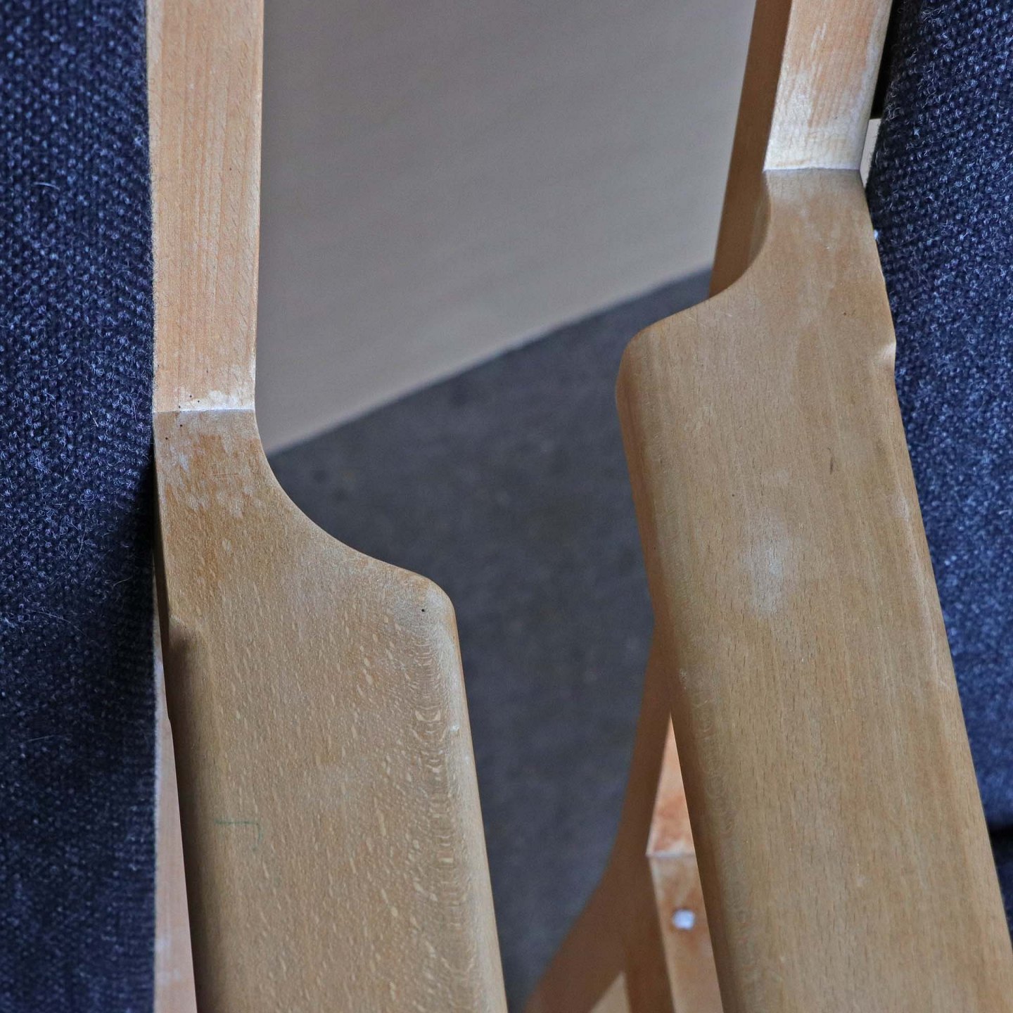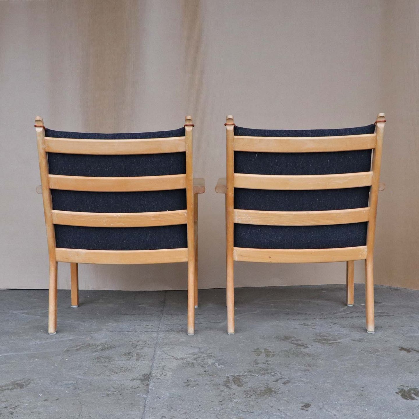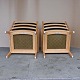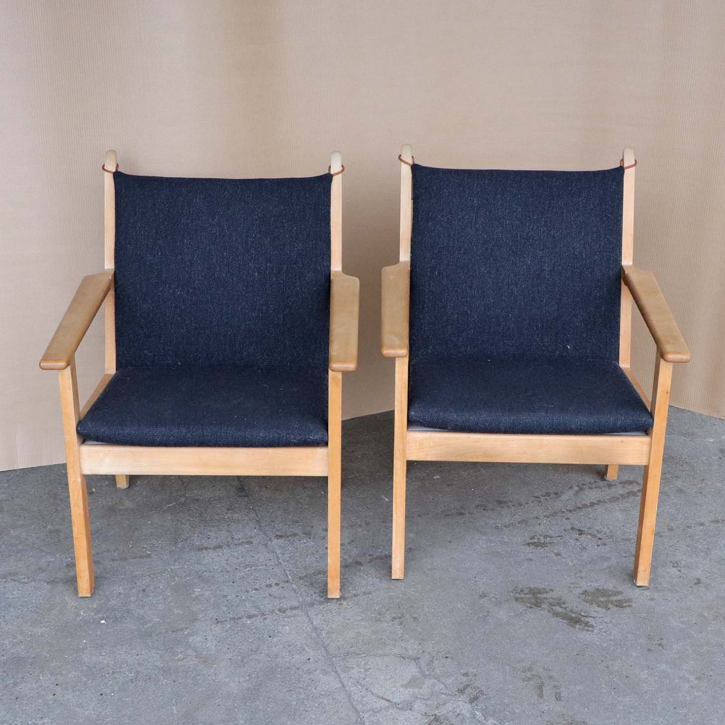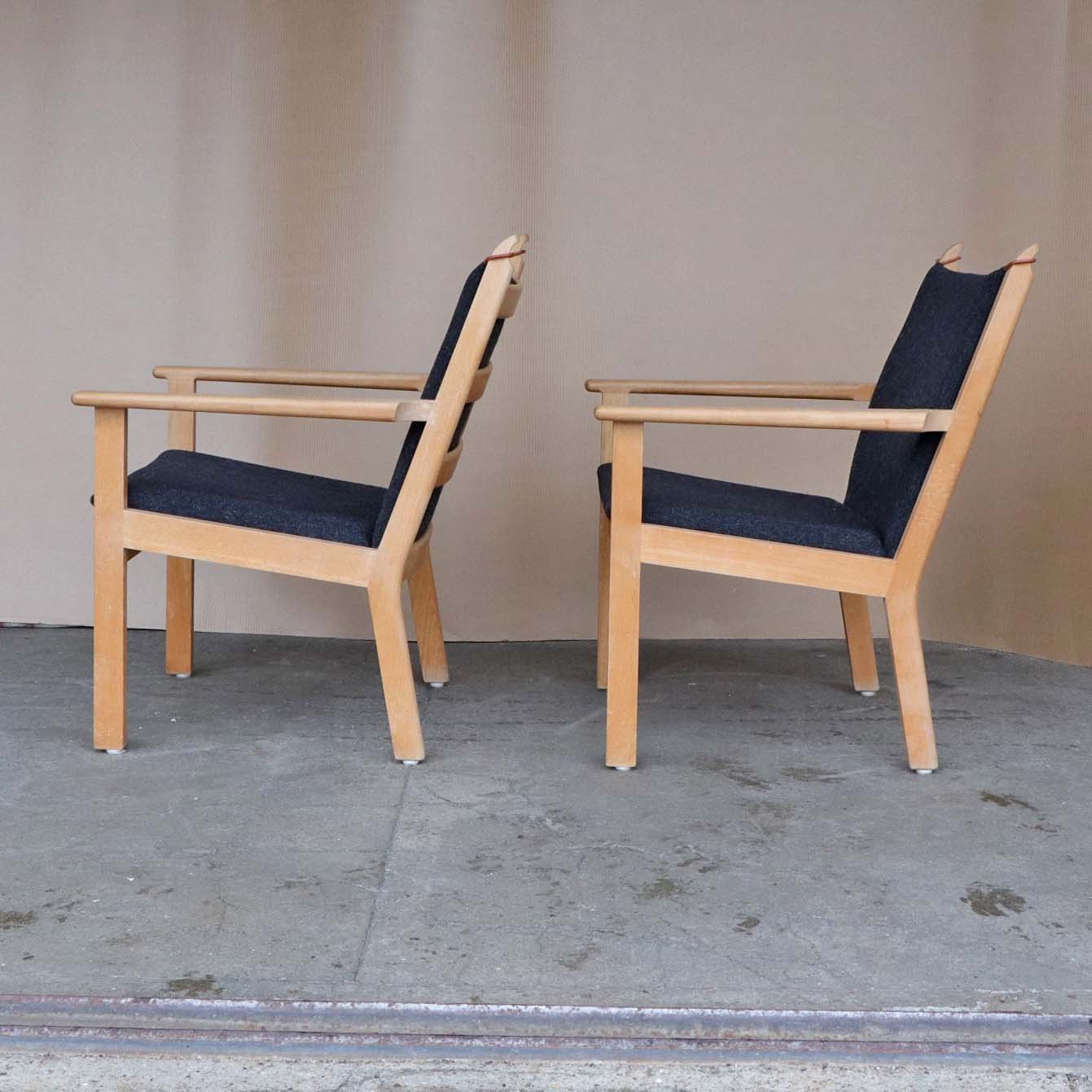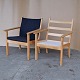 To armstole med stel i lakeret bøgetræ. Stolene har hynder betrukket med sortmeleret uldstof Hallingdal 180 med stropper i læder i pæn stand. Model GE-284
