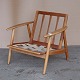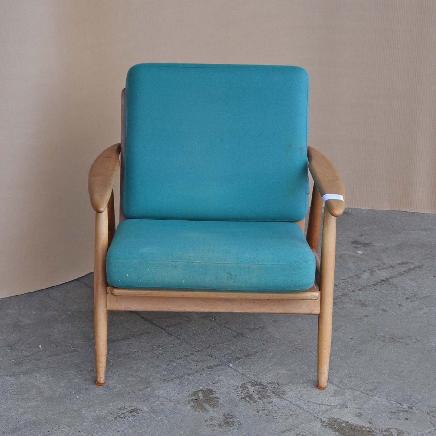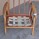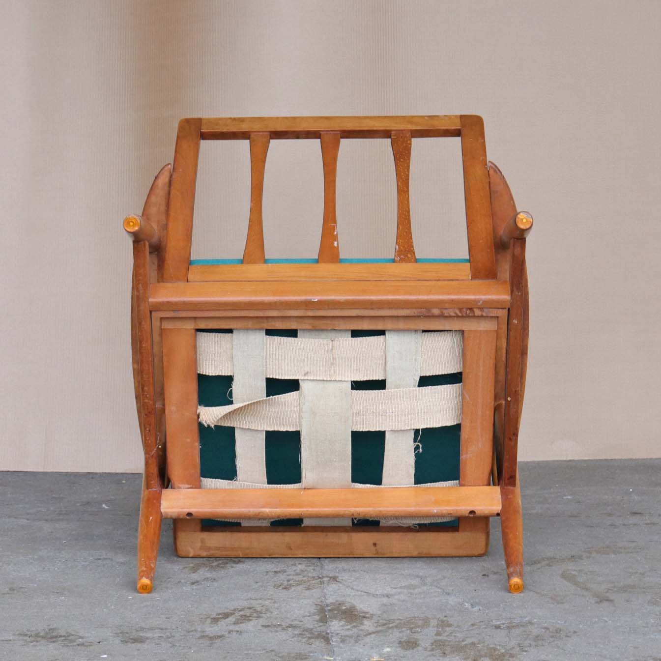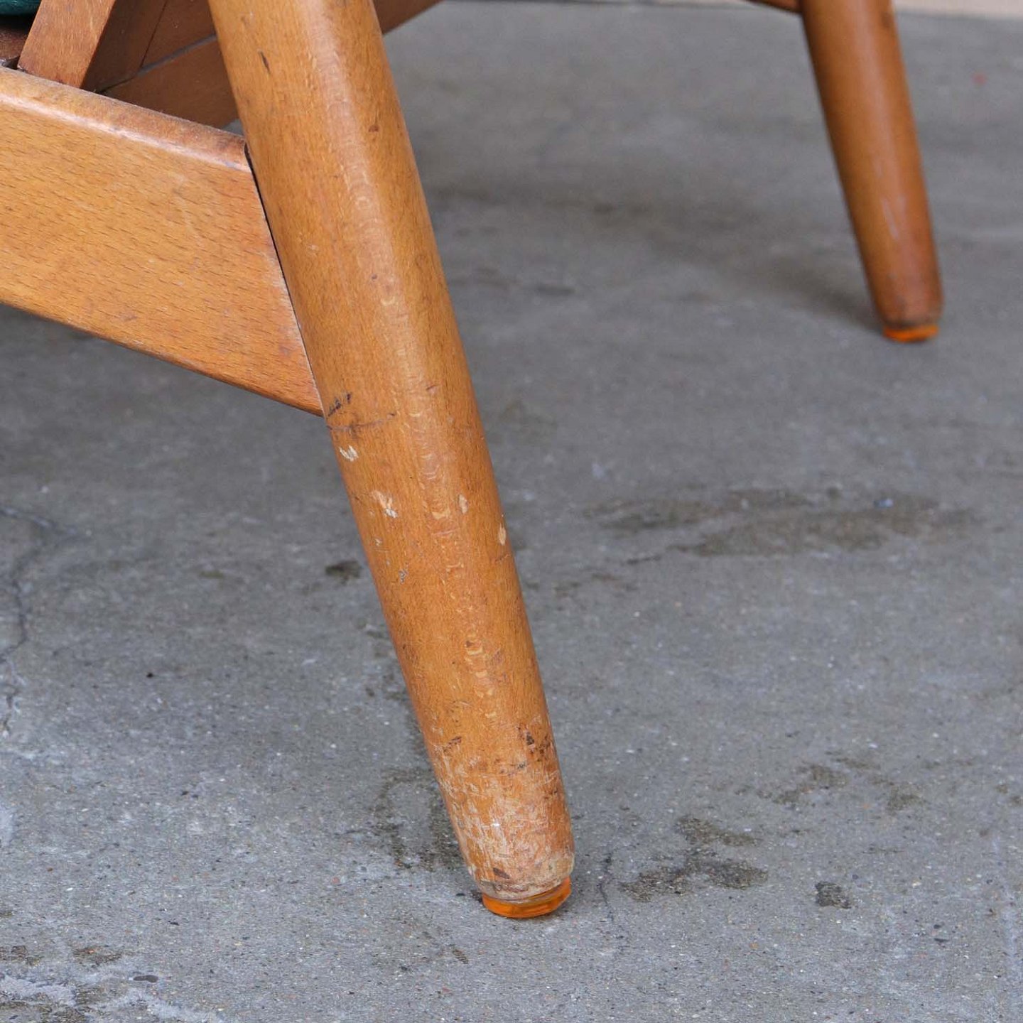 Lænestol med stel i lakeret bøgetræ og hynder betrukket med grøn uldstof.