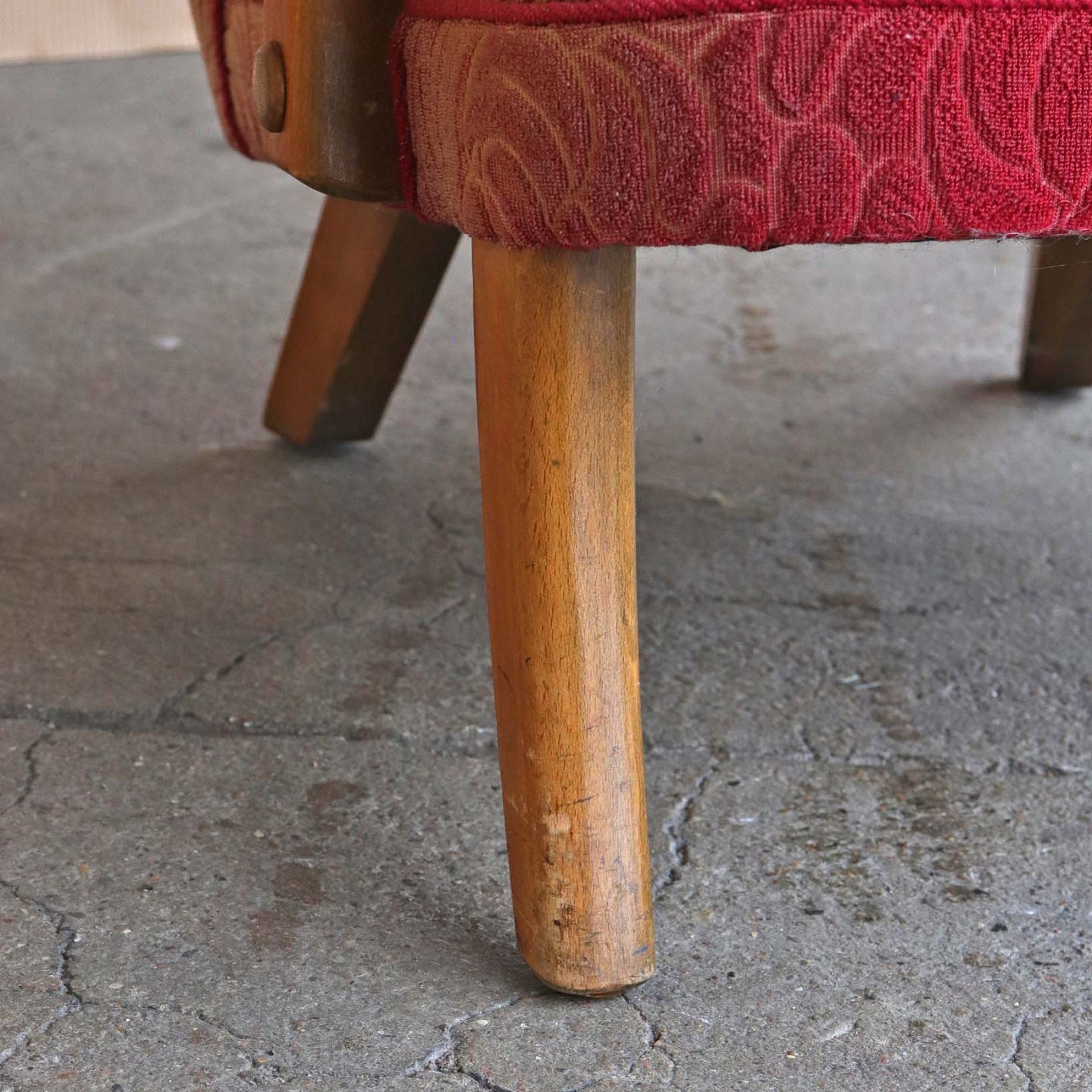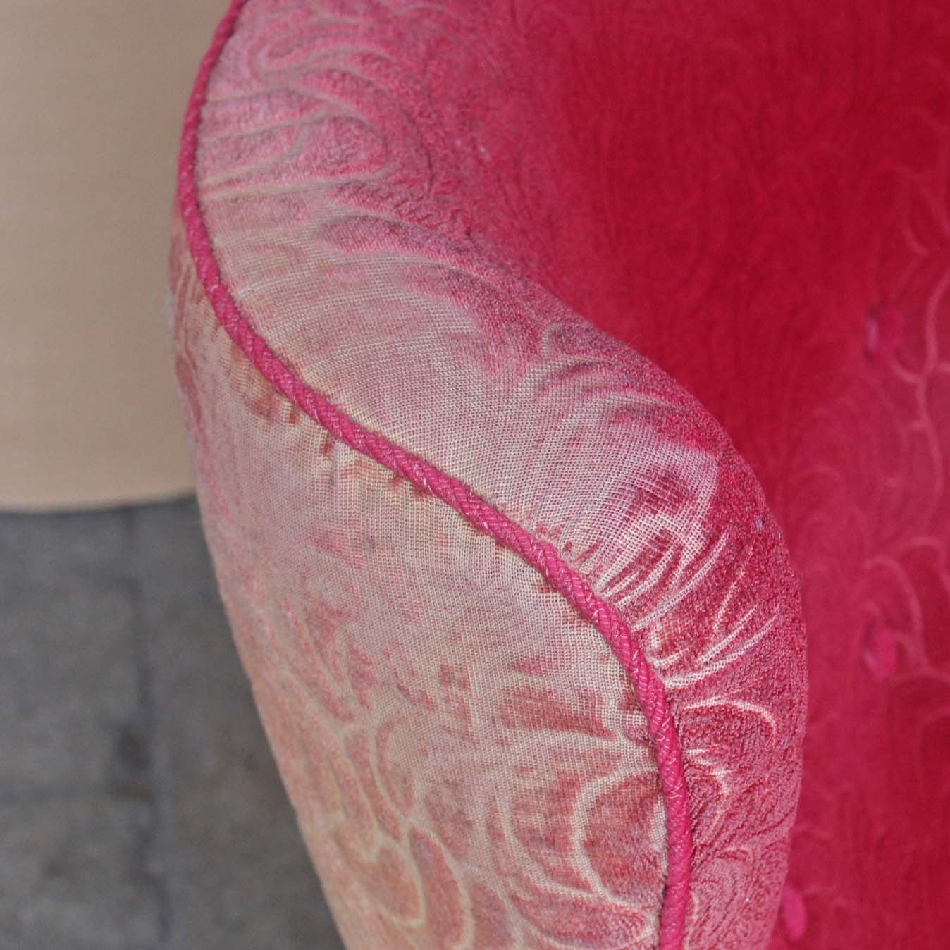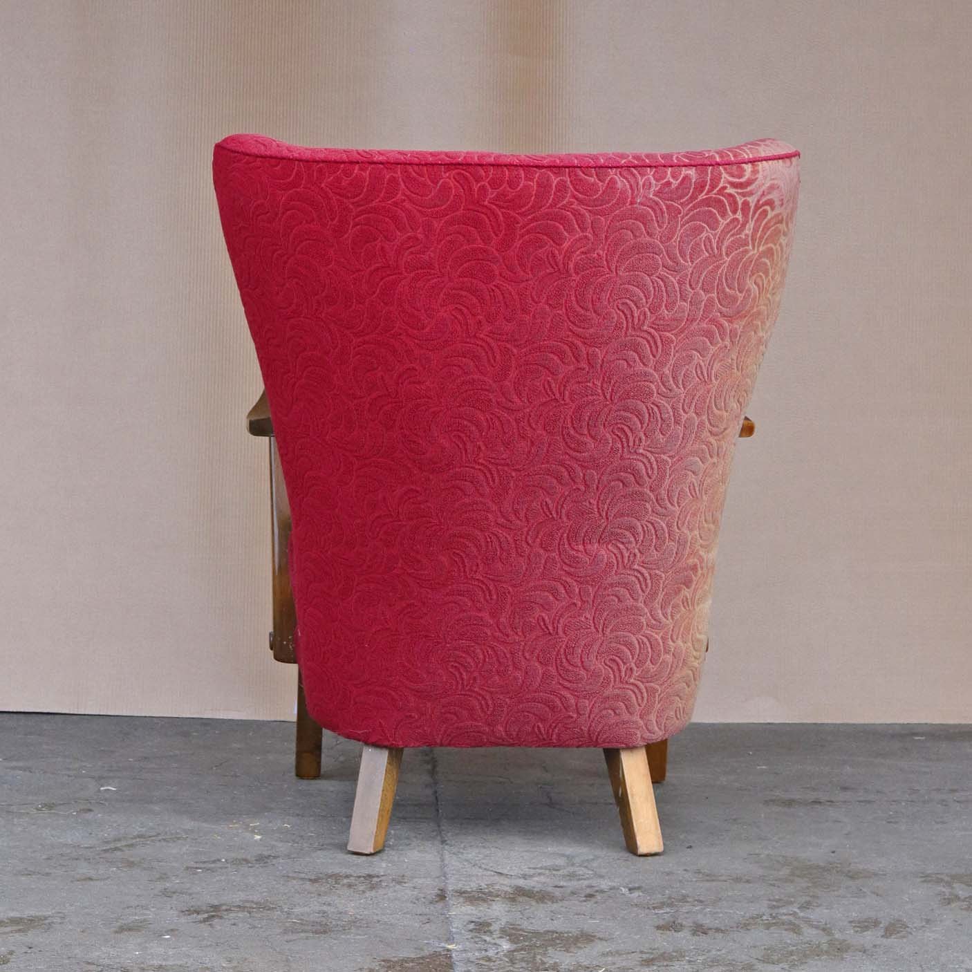 Ældre lænestol med stel i lakeret bøgetræ. Stolen har springfjeder sæde og er betrukket med struktureret rødt stof