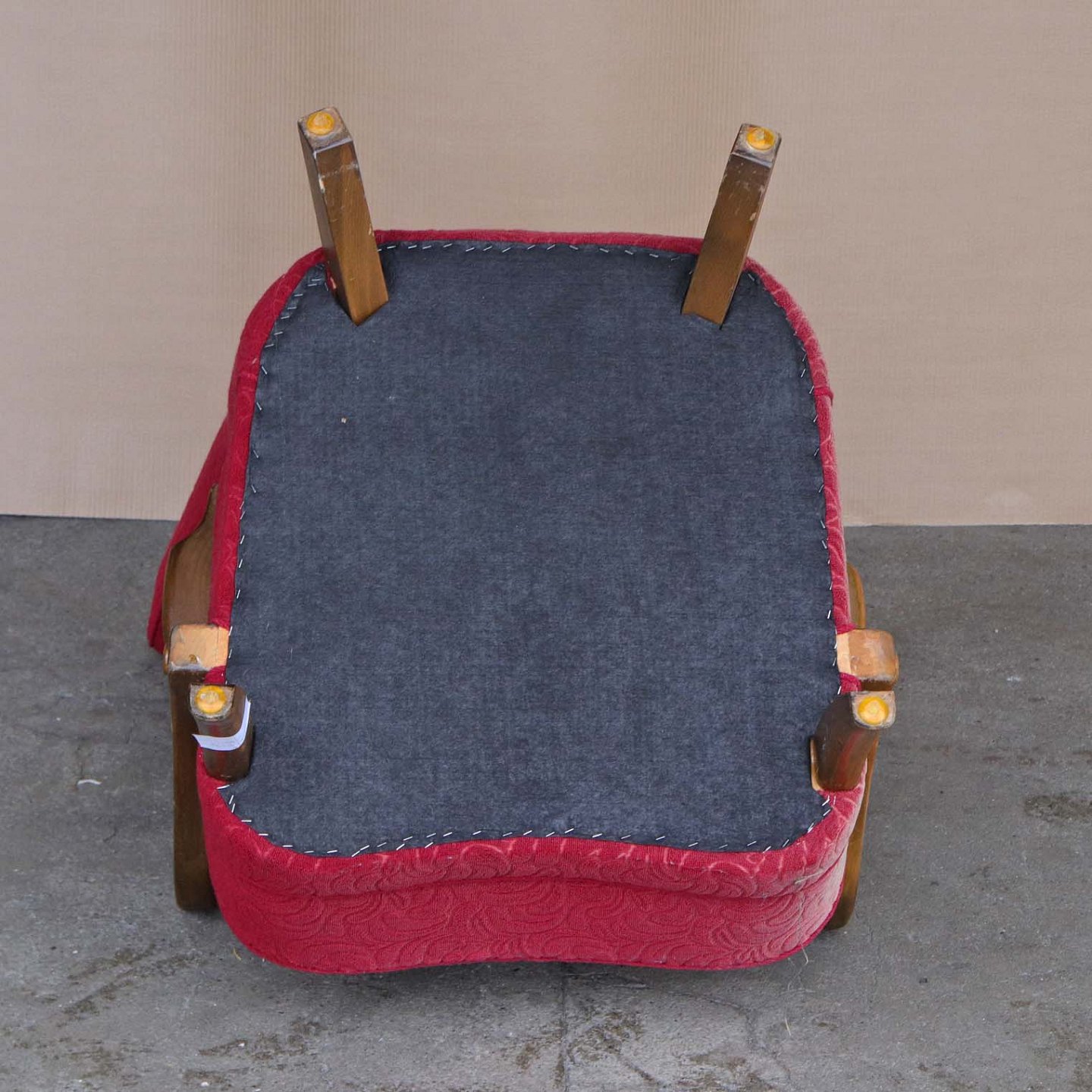 Fremstår med brugsspor på stel samt slidt og solfalmet stof. Trænger til ompolstring