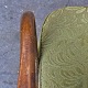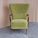 Ældre lænestol med stel i mørk lakeret træ. Stolen har springfjeder sæde og er betrukket med struktureret grønt stof, den lave model.