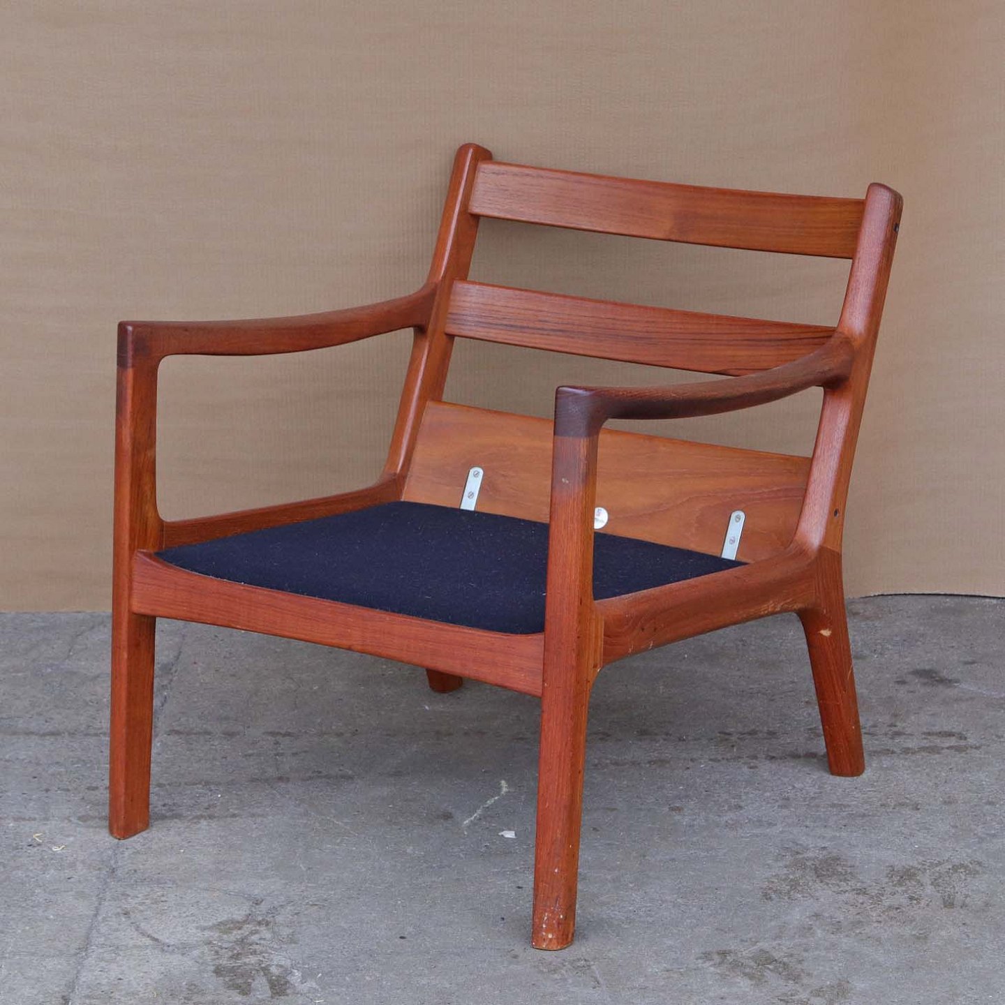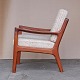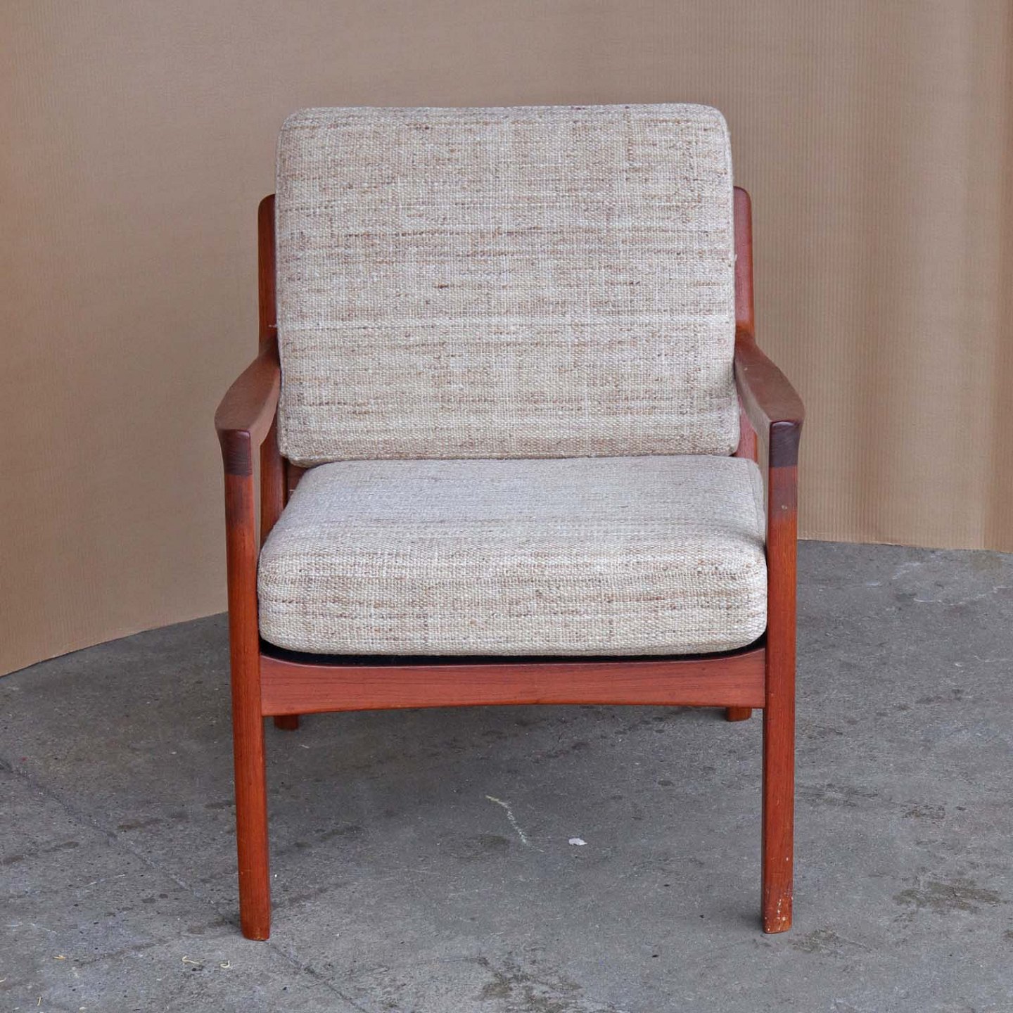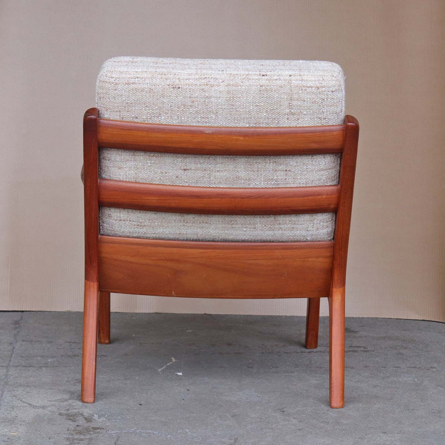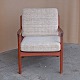 Lænestol med stel i lakeret teaktræ og springhynder betrukket med lys beige meleret uldstof. Model Senator
