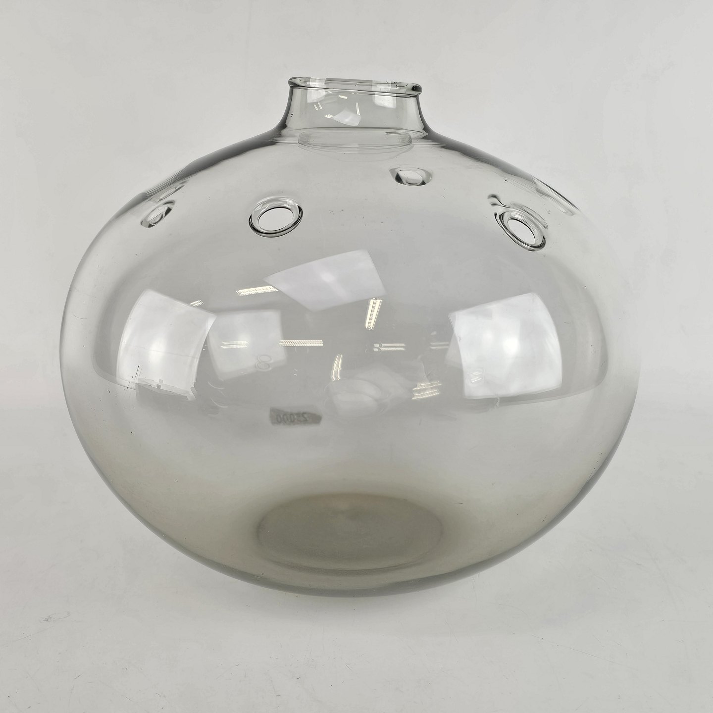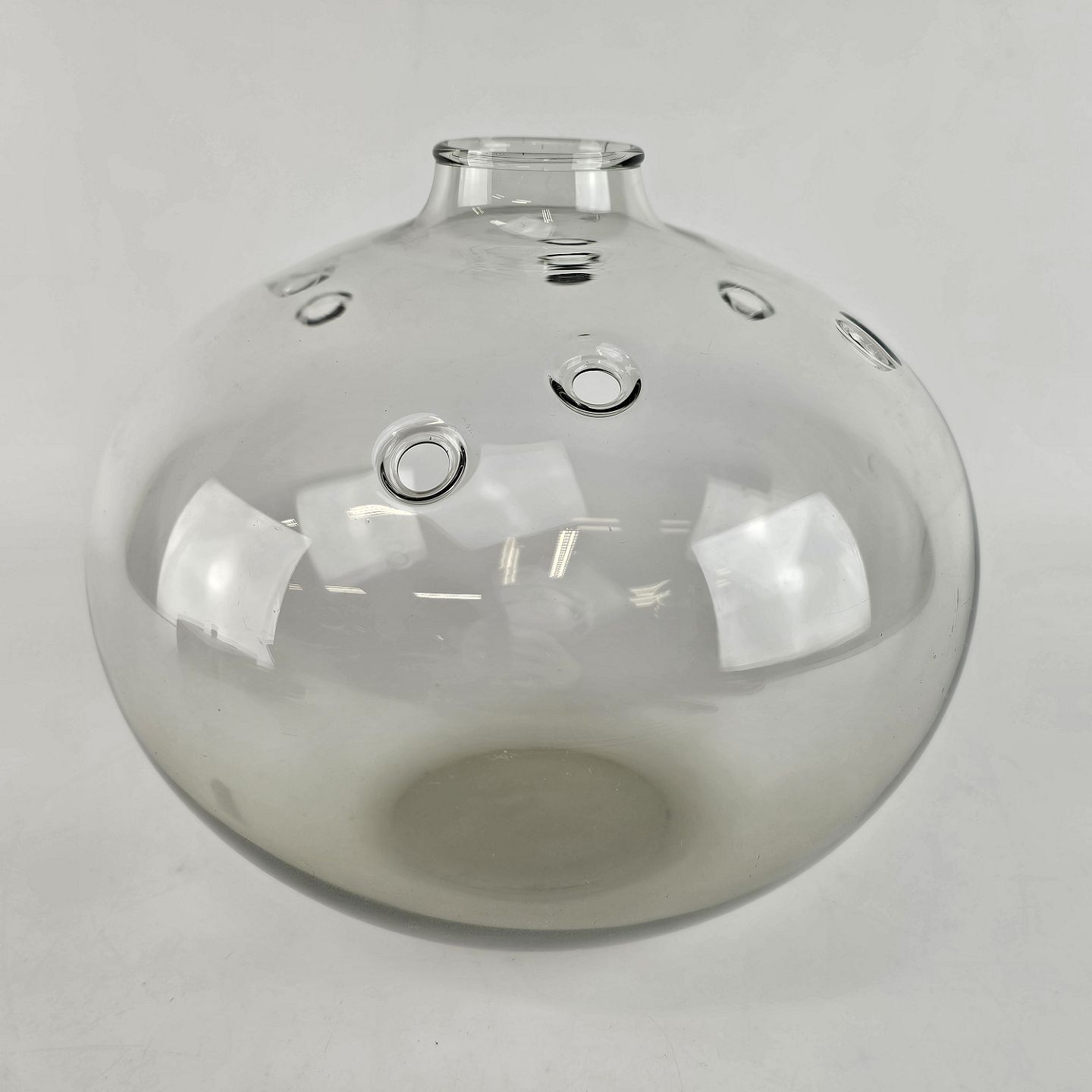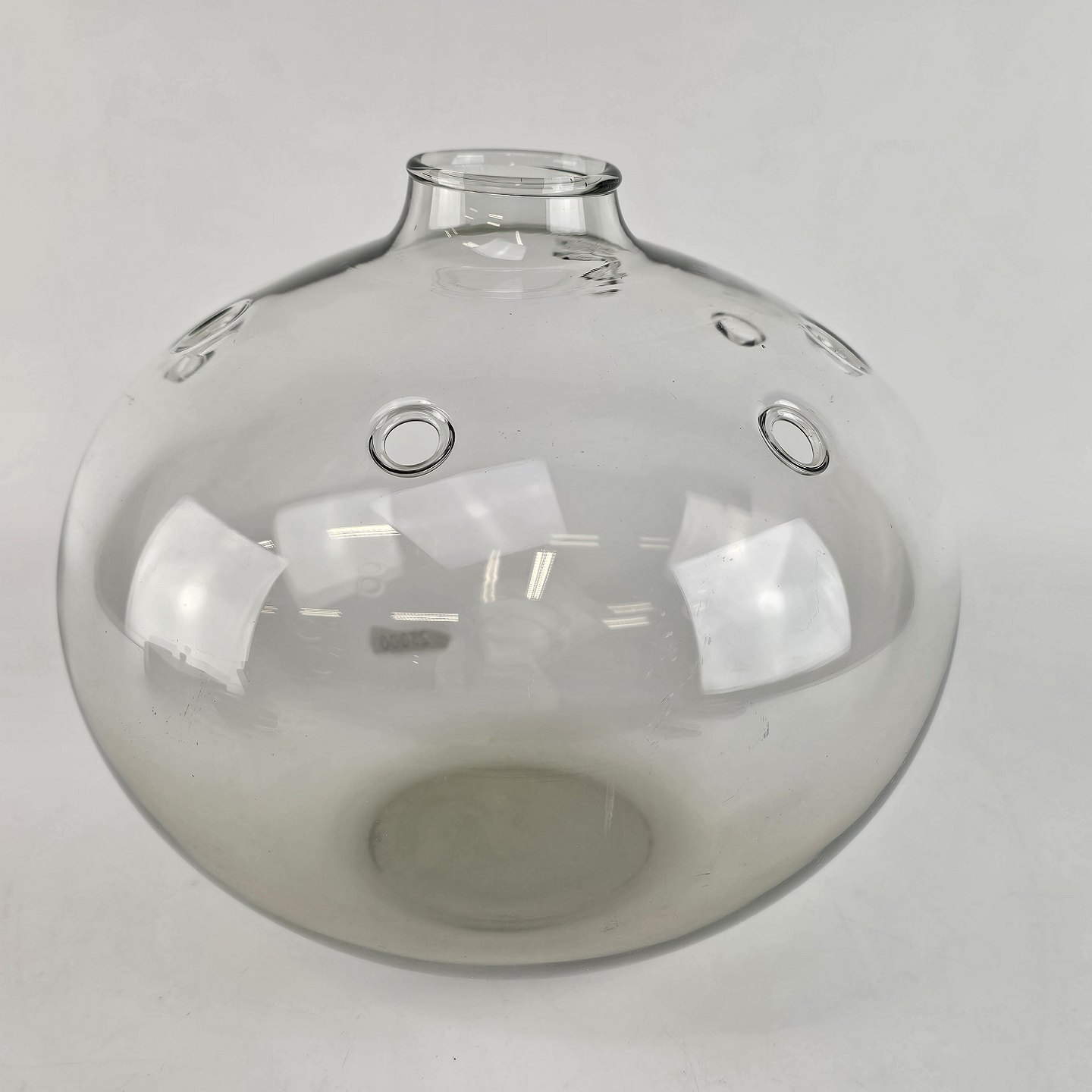 Kugleformet vase med lille åbning og syv huller.