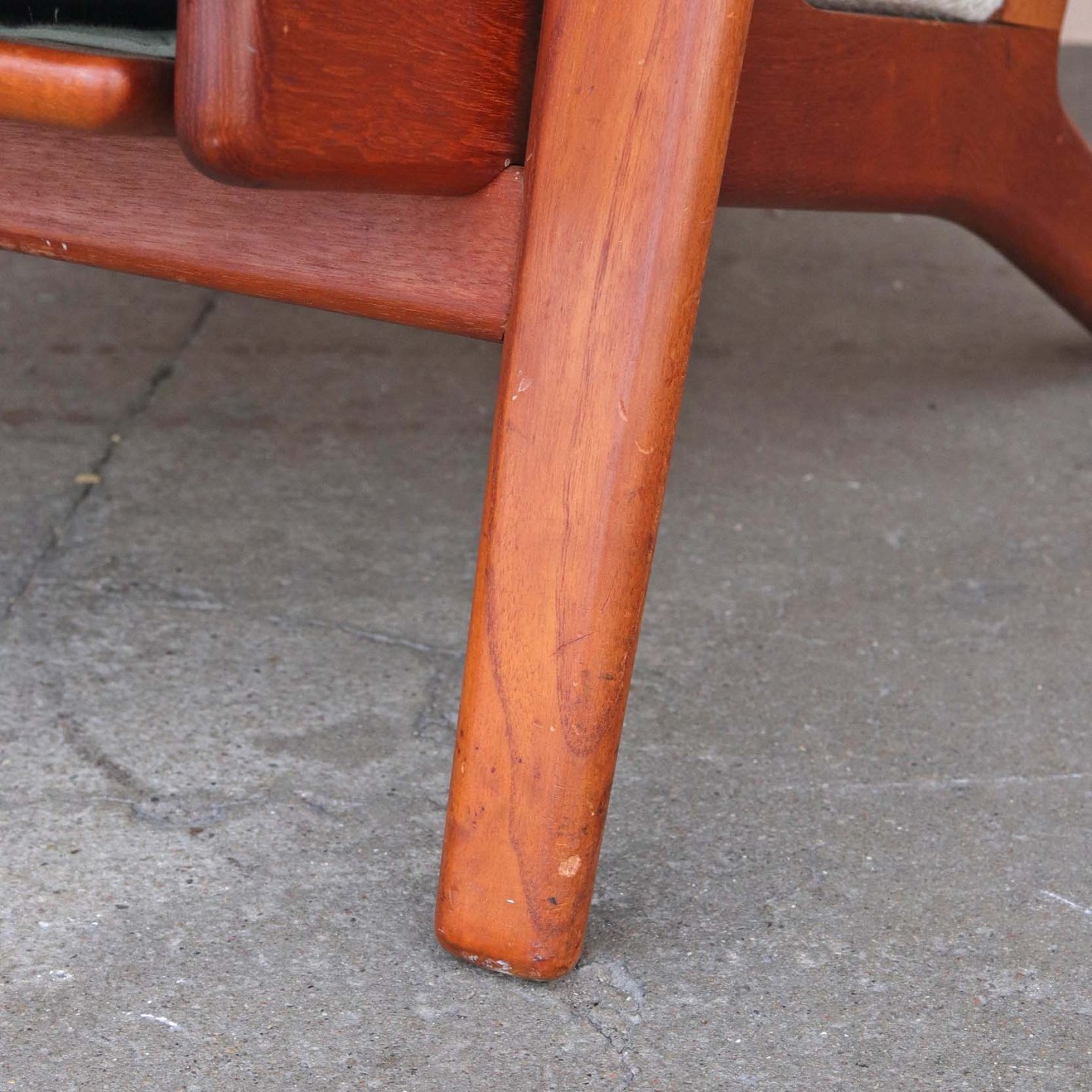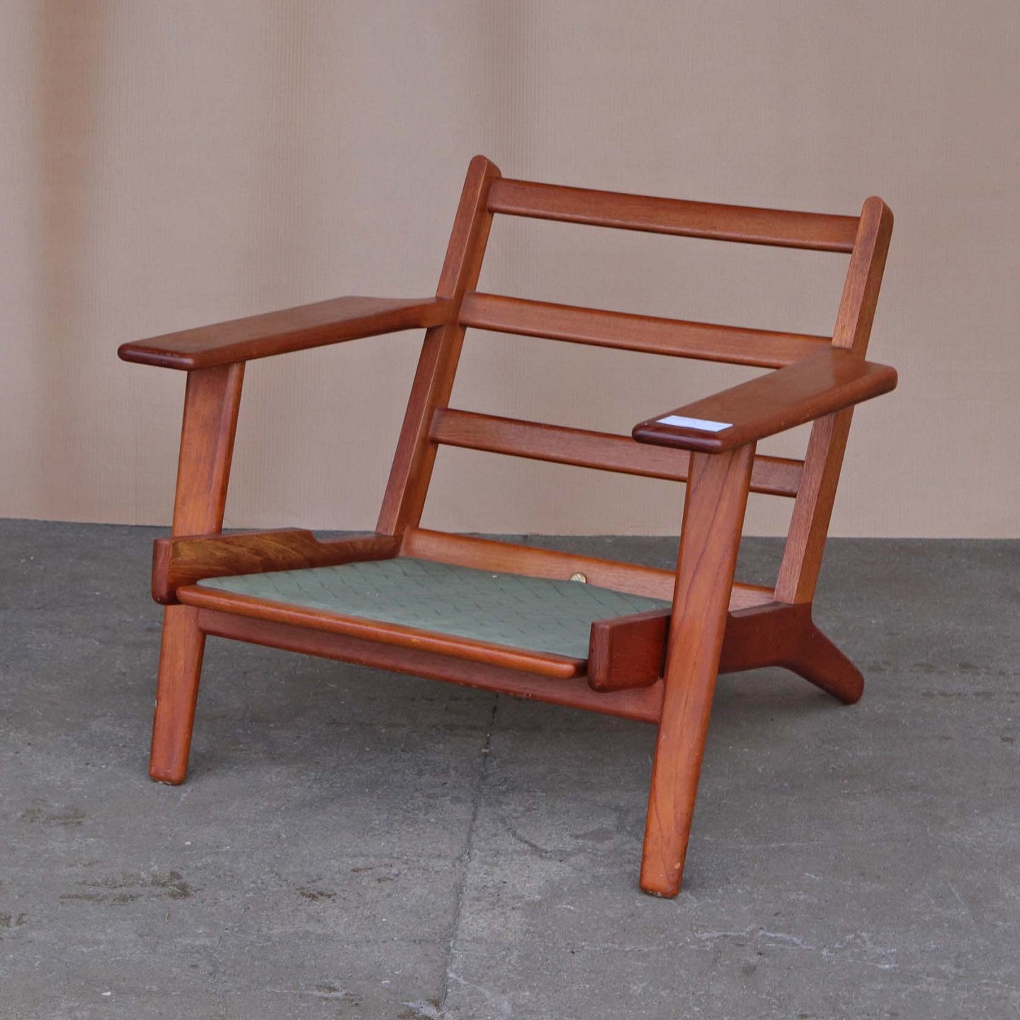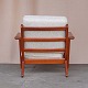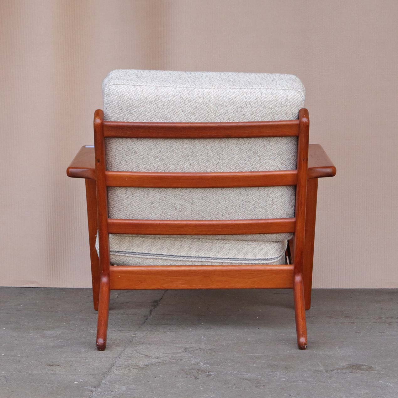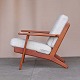Lænestol med stel i lakeret teaktræ og hynder med springfjeder. Hynderne er betrukket med meleret råhvidt uldstof. Model GE 290