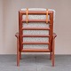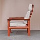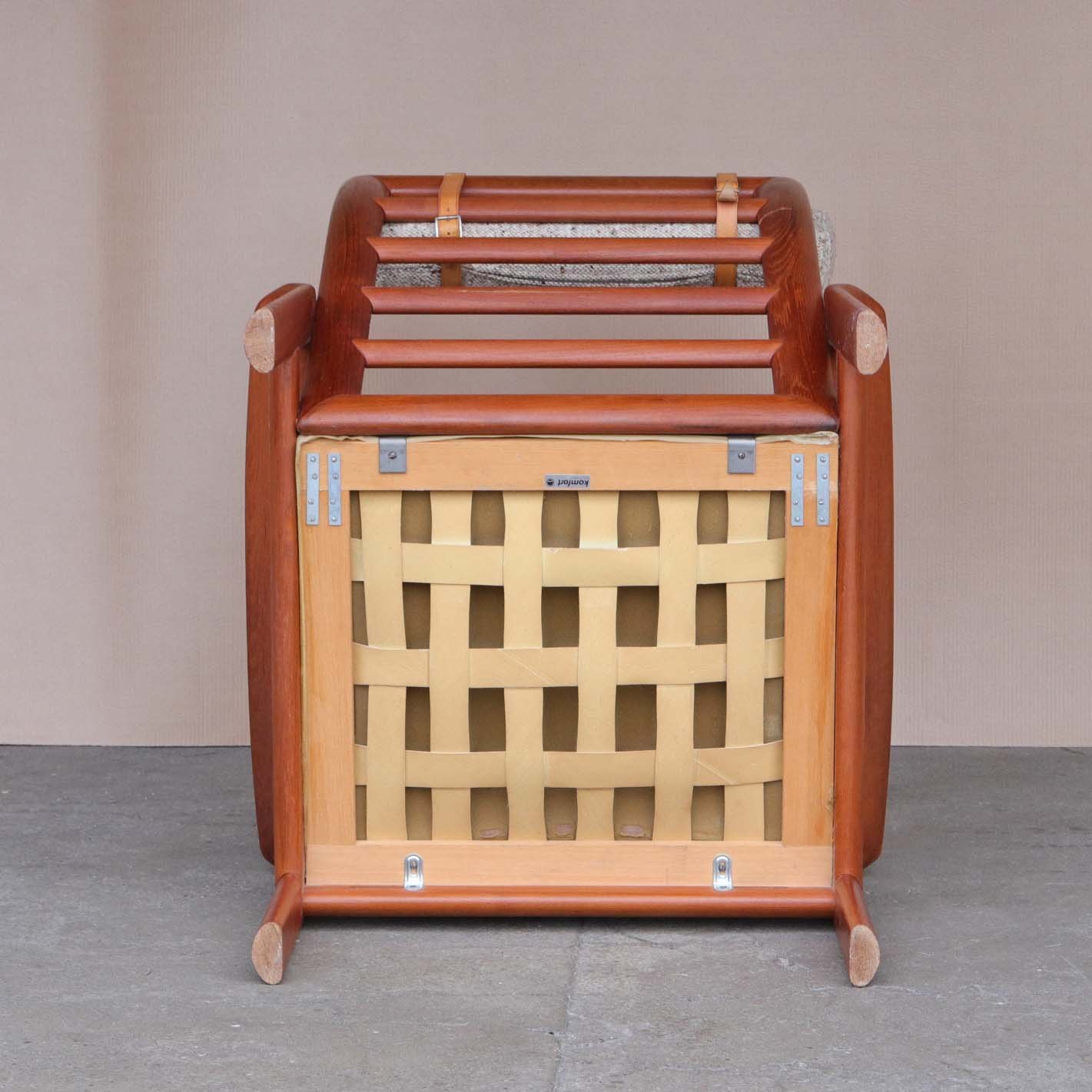 Højrygget lænestol fra 1970erne med stel i lakeret teaktræ og hynder med springfjeder. Hynderne er betrukket med lyst meleret uldstof og nakkepuden holdes på plads af remme i lyst kernelæder