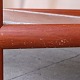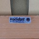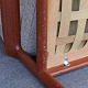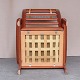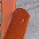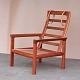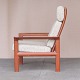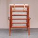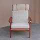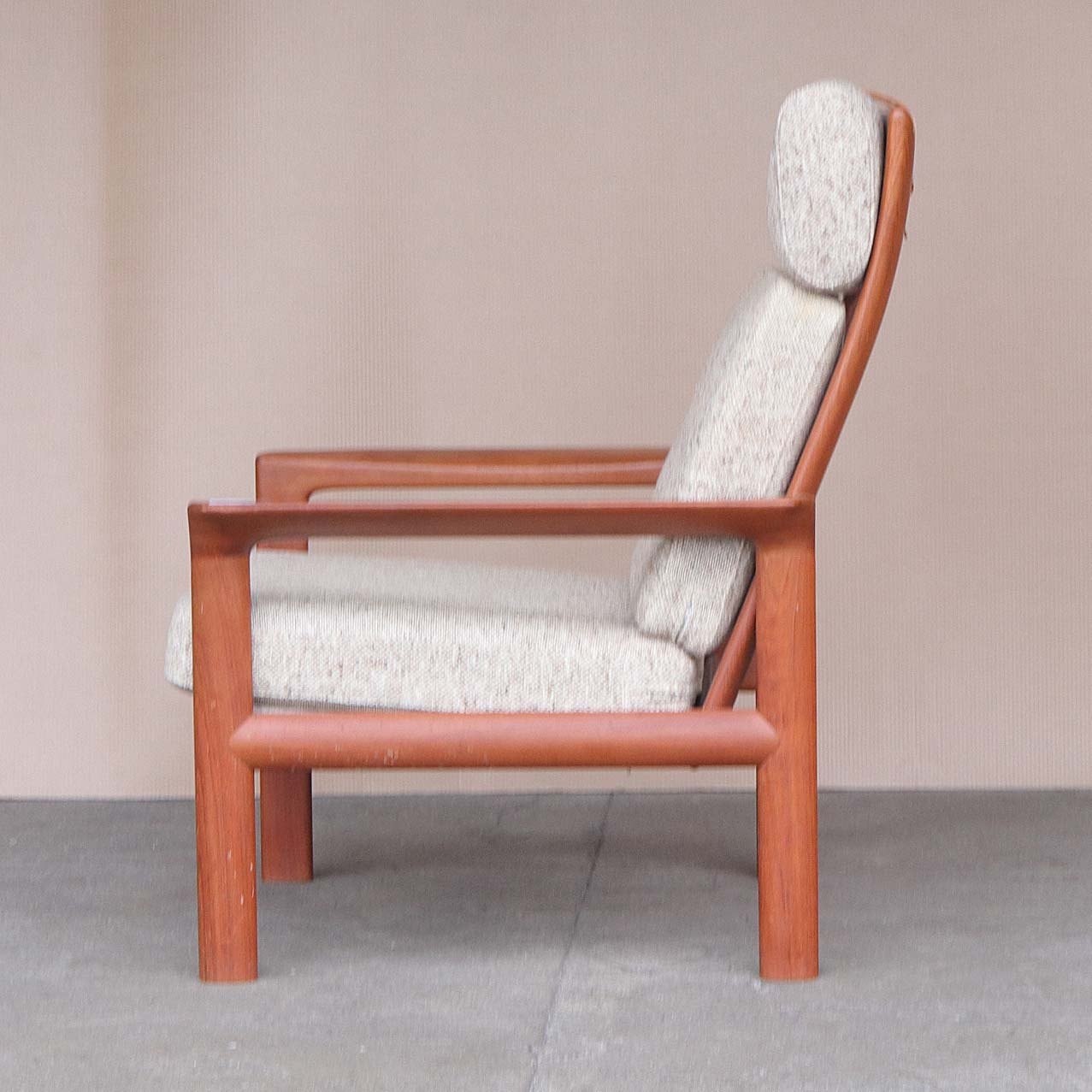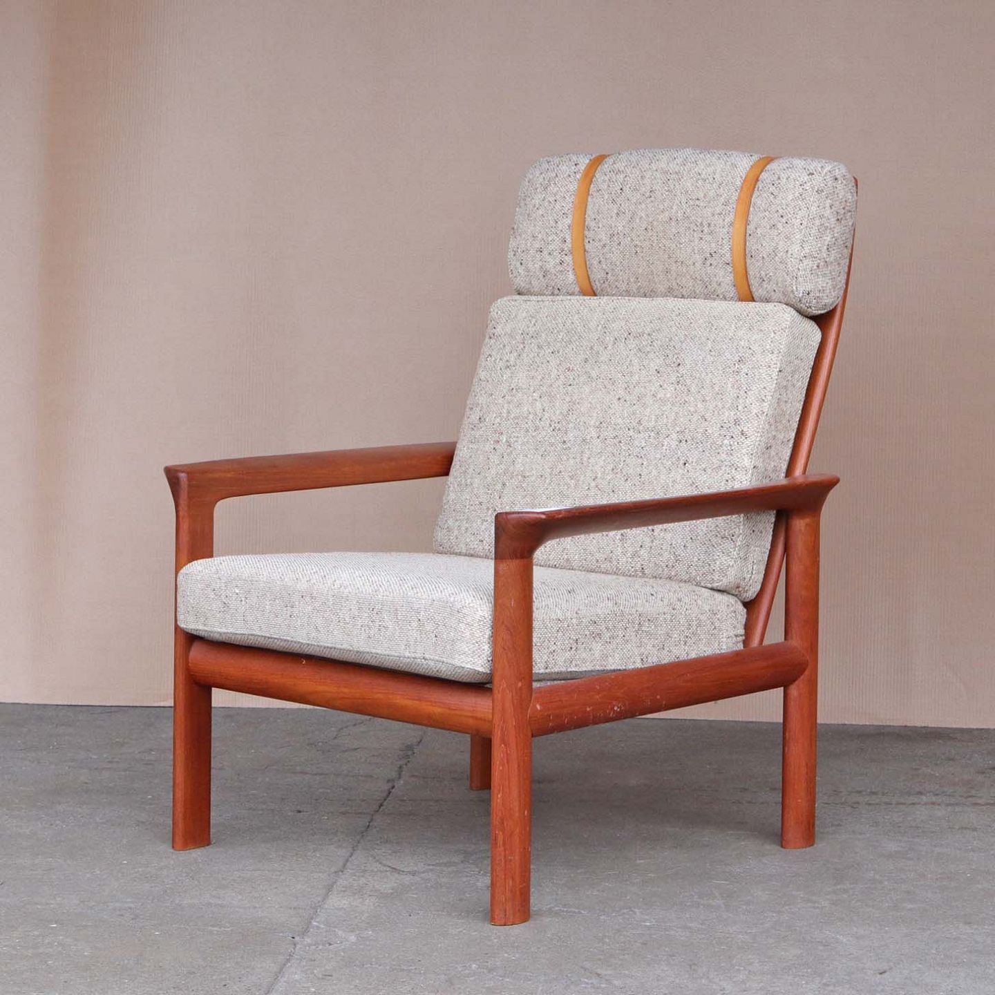 Højrygget lænestol fra 1970erne med stel i lakeret teaktræ og hynder med springfjeder. Hynderne er betrukket med lyst meleret uldstof og nakkepuden holdes på plads af remme i lyst kernelæder
