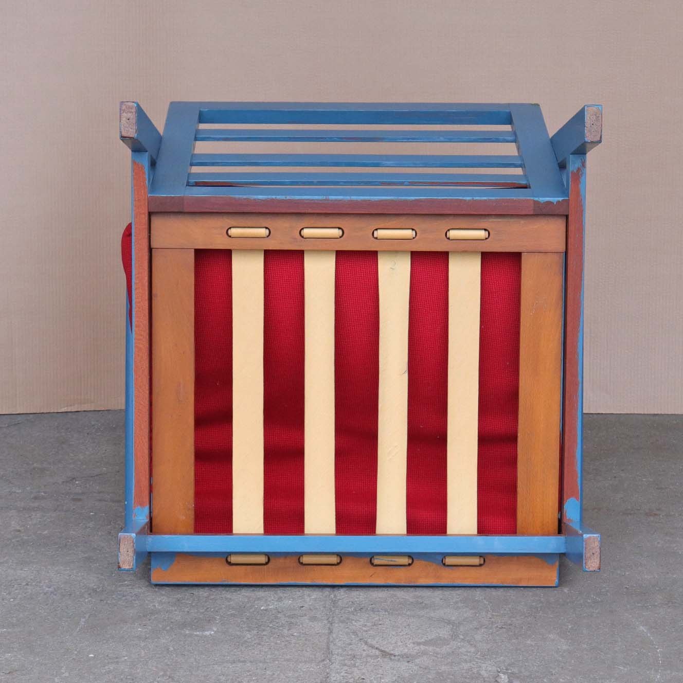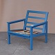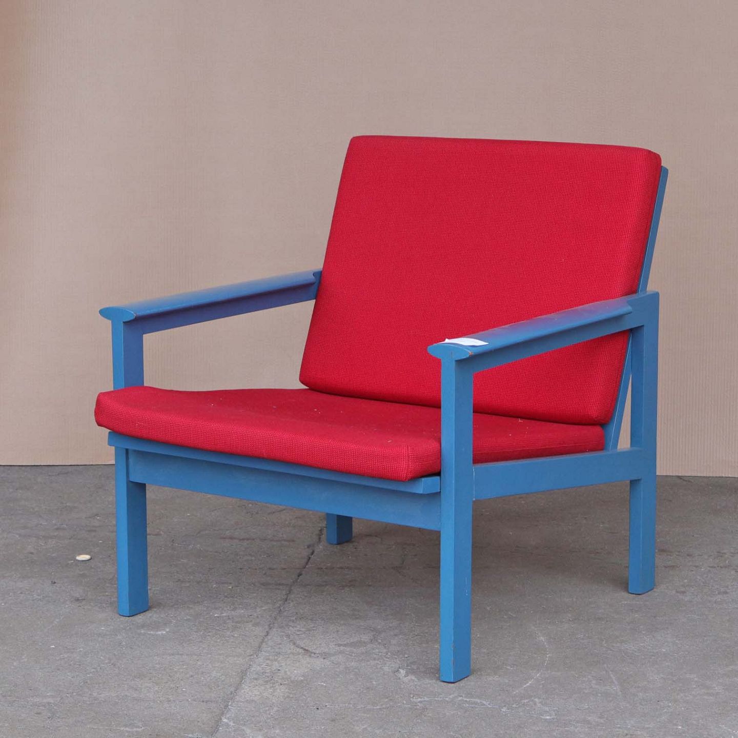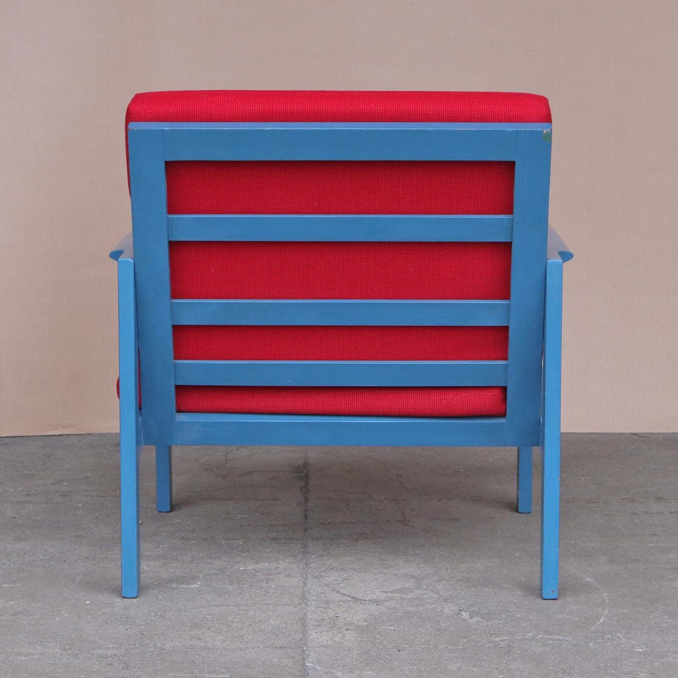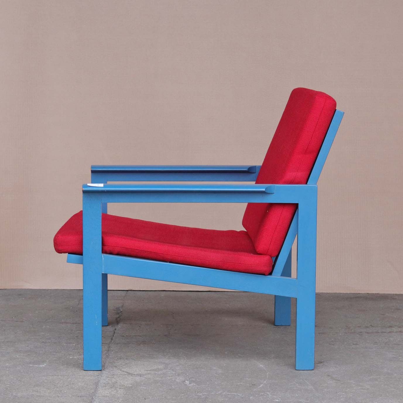 Lænestol med stel i blålakeret teaktræ og hynder betrukket med rødt uldstof, model Capella