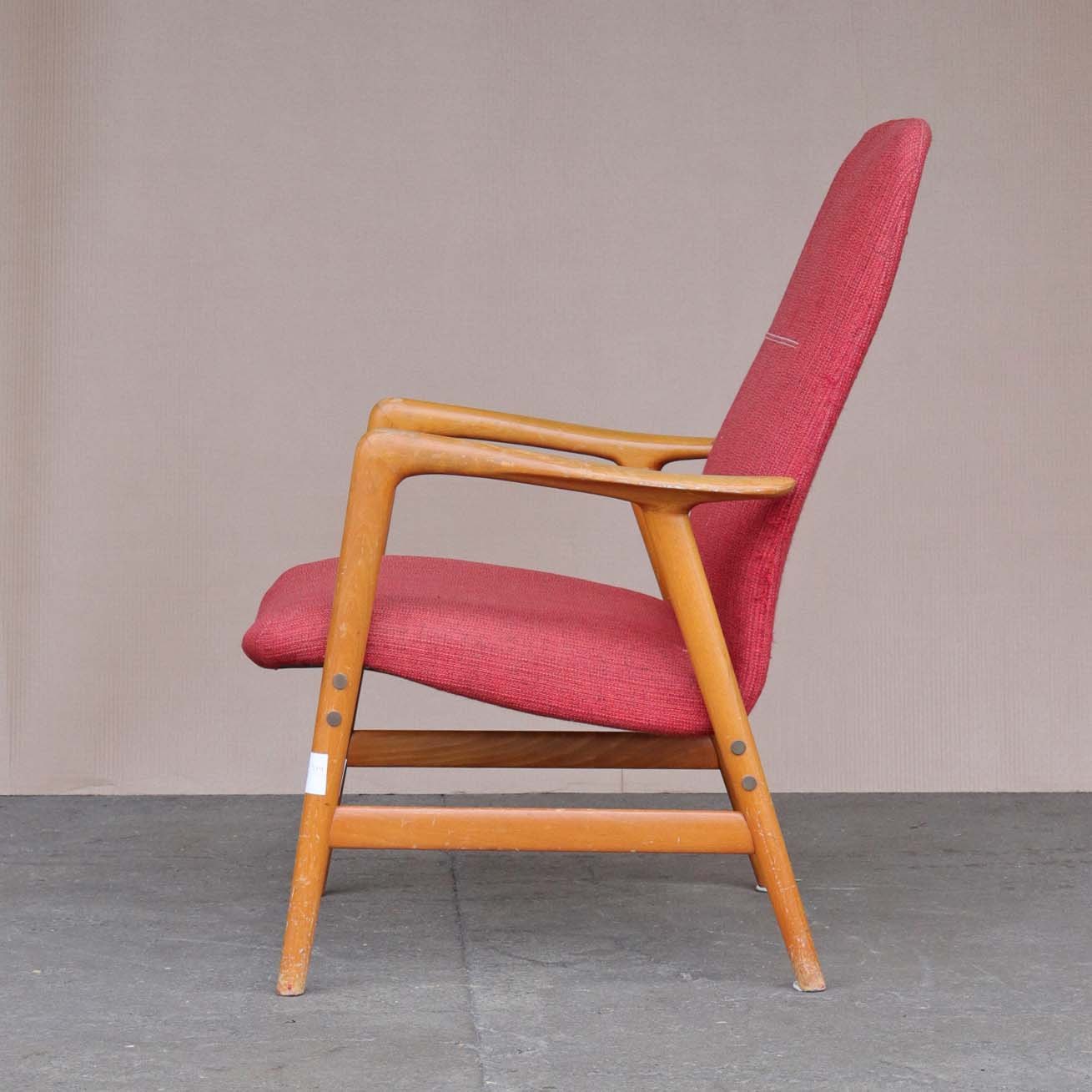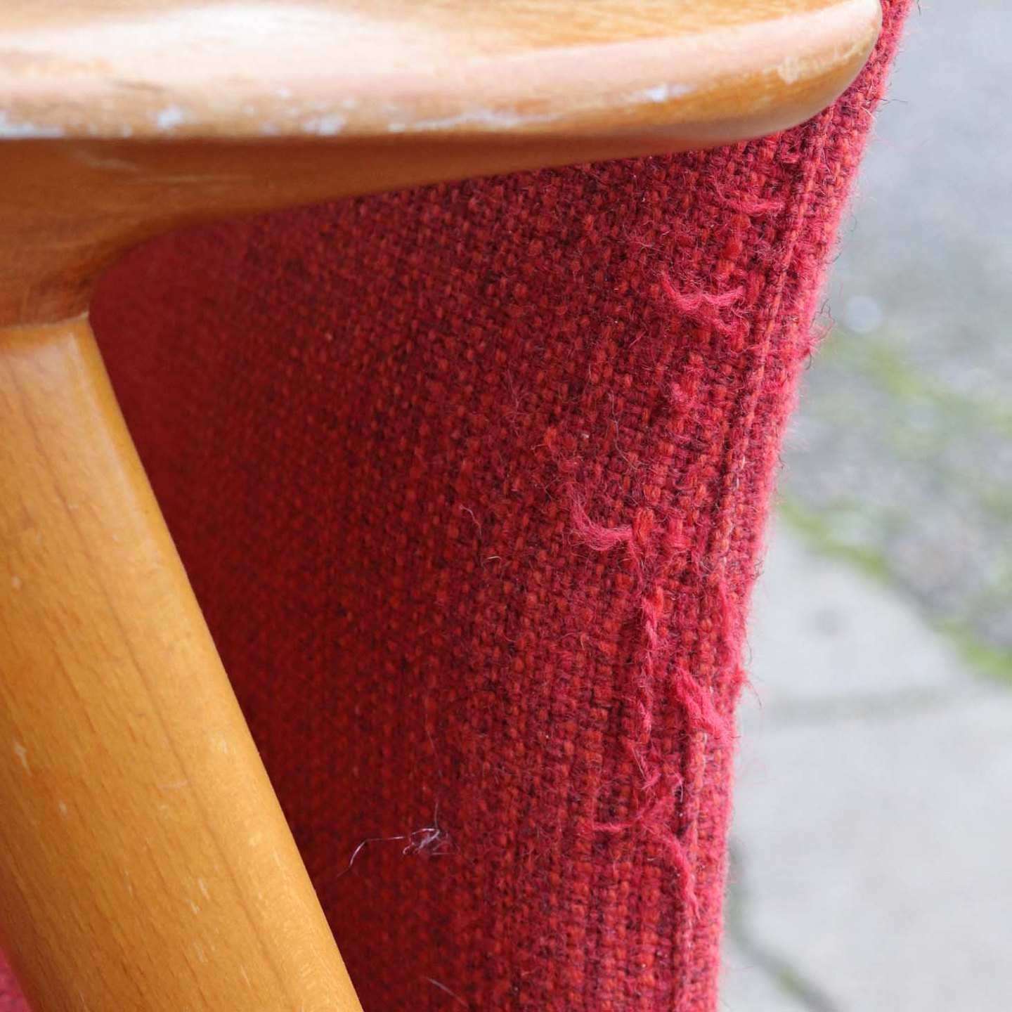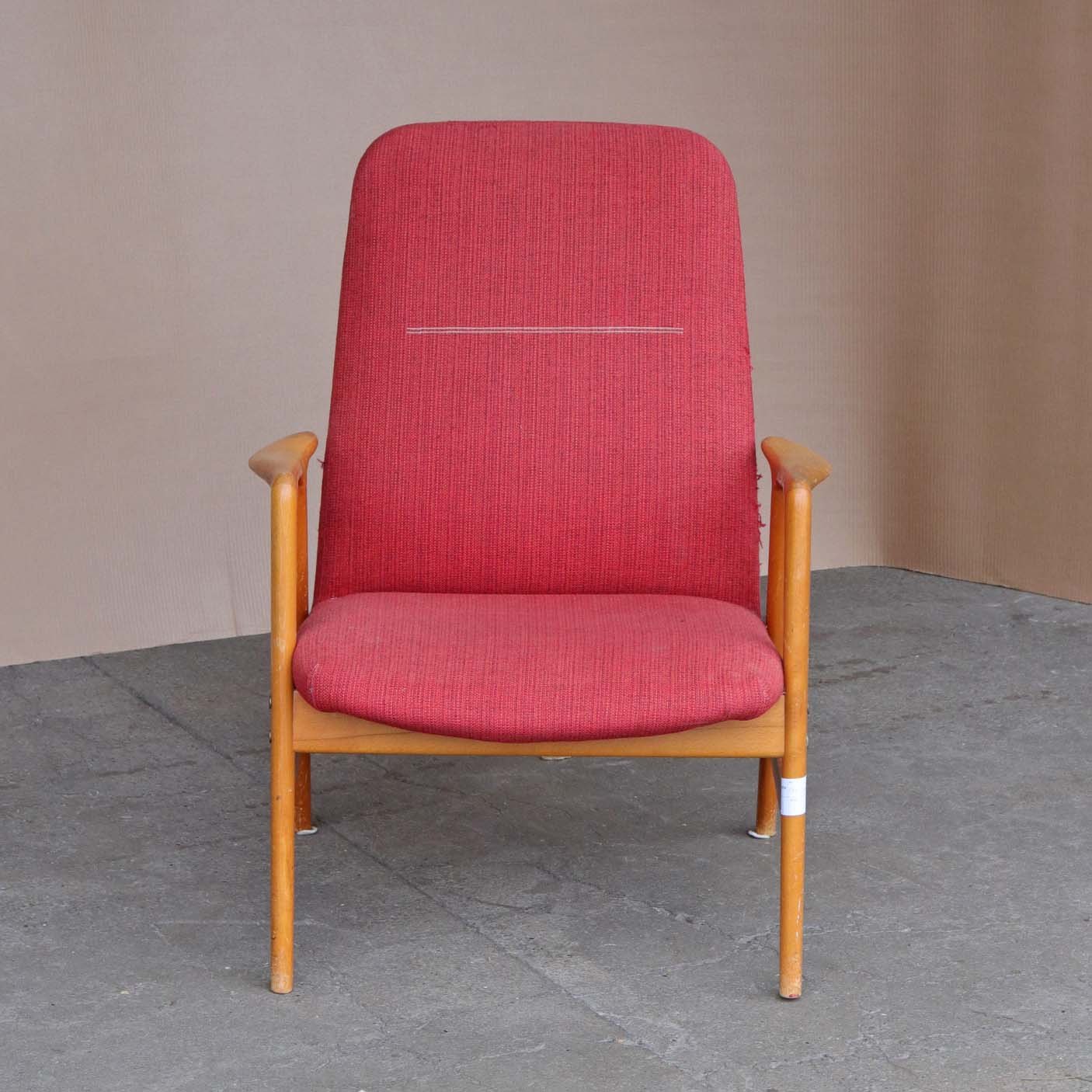 Lænestol med stel i lakeret bøge træ. Stolen betrukket med meleret rødt uldstof. Model Studio