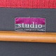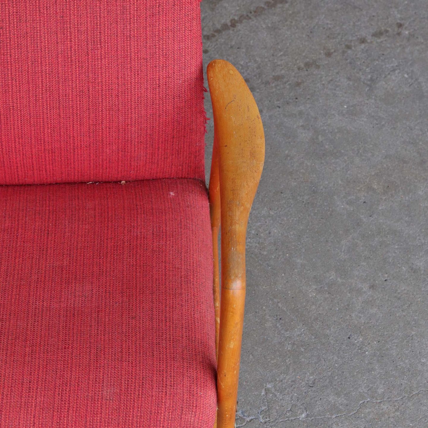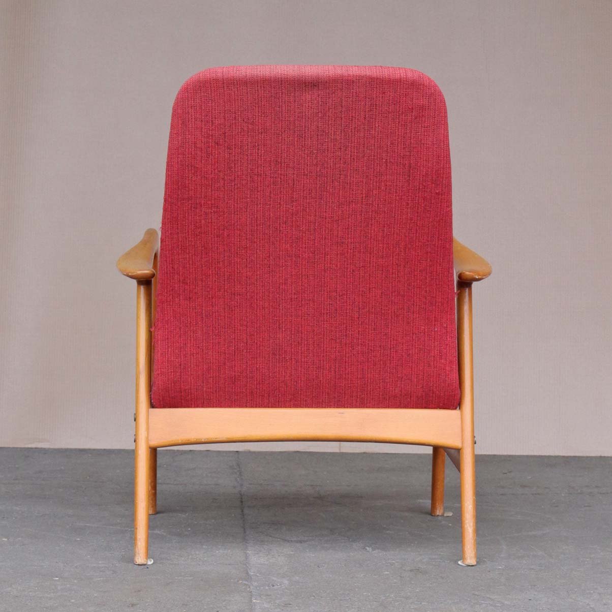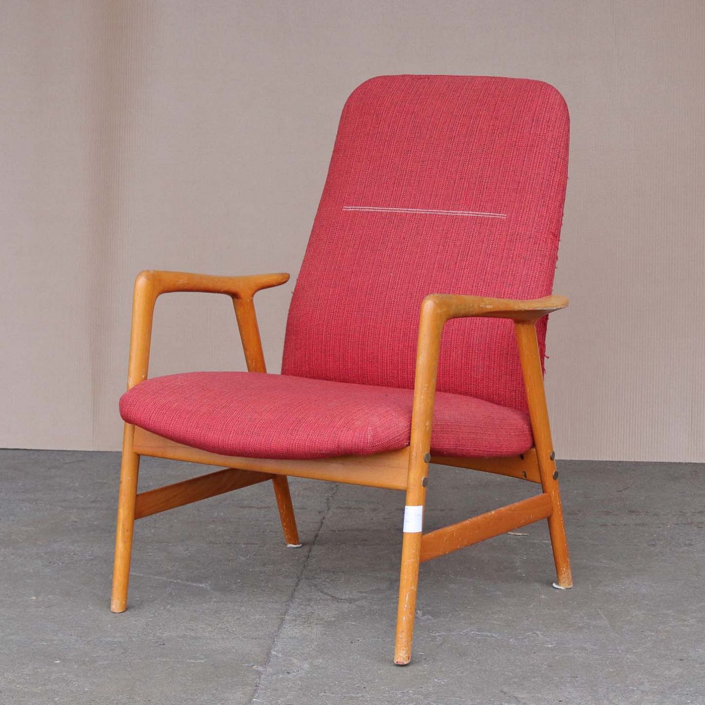 Lænestol med stel i lakeret bøge træ. Stolen betrukket med meleret rødt uldstof. Model Studio