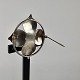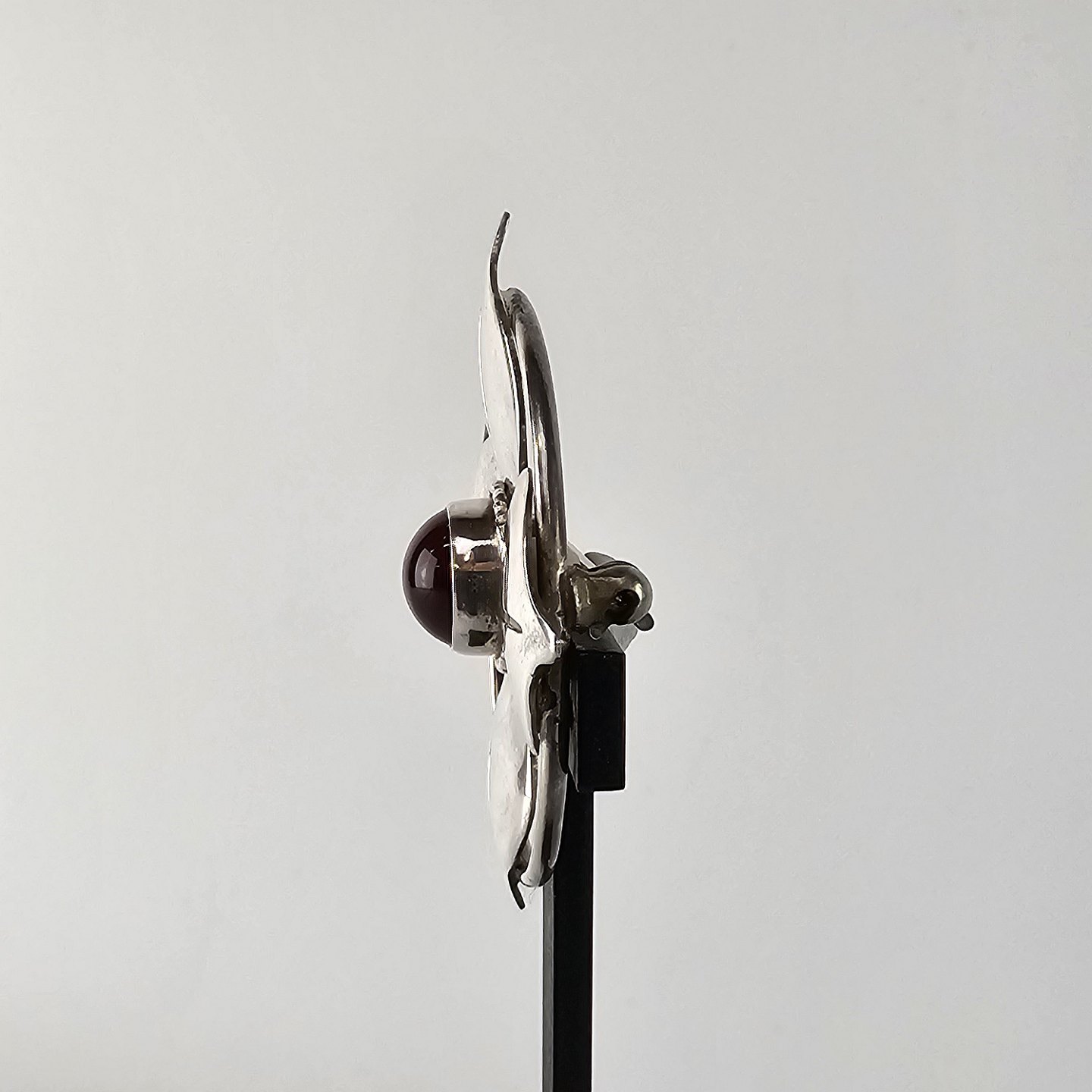 Broche i sølv udformet som en blomst med fire blade og rød sten i midten.