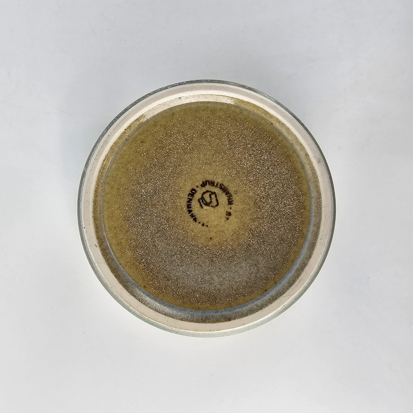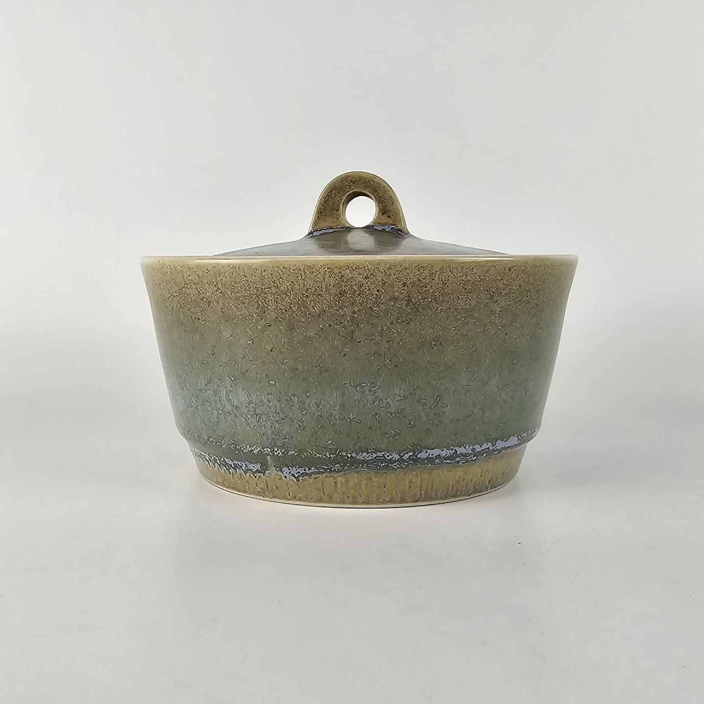 Skål med låg af stentøj og dekoreret med en grønlig nuance glasering.