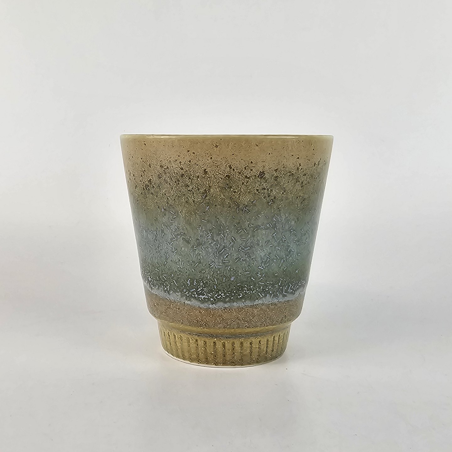 Kop af stentøj og dekoreret med en grønlig nuance glasering.