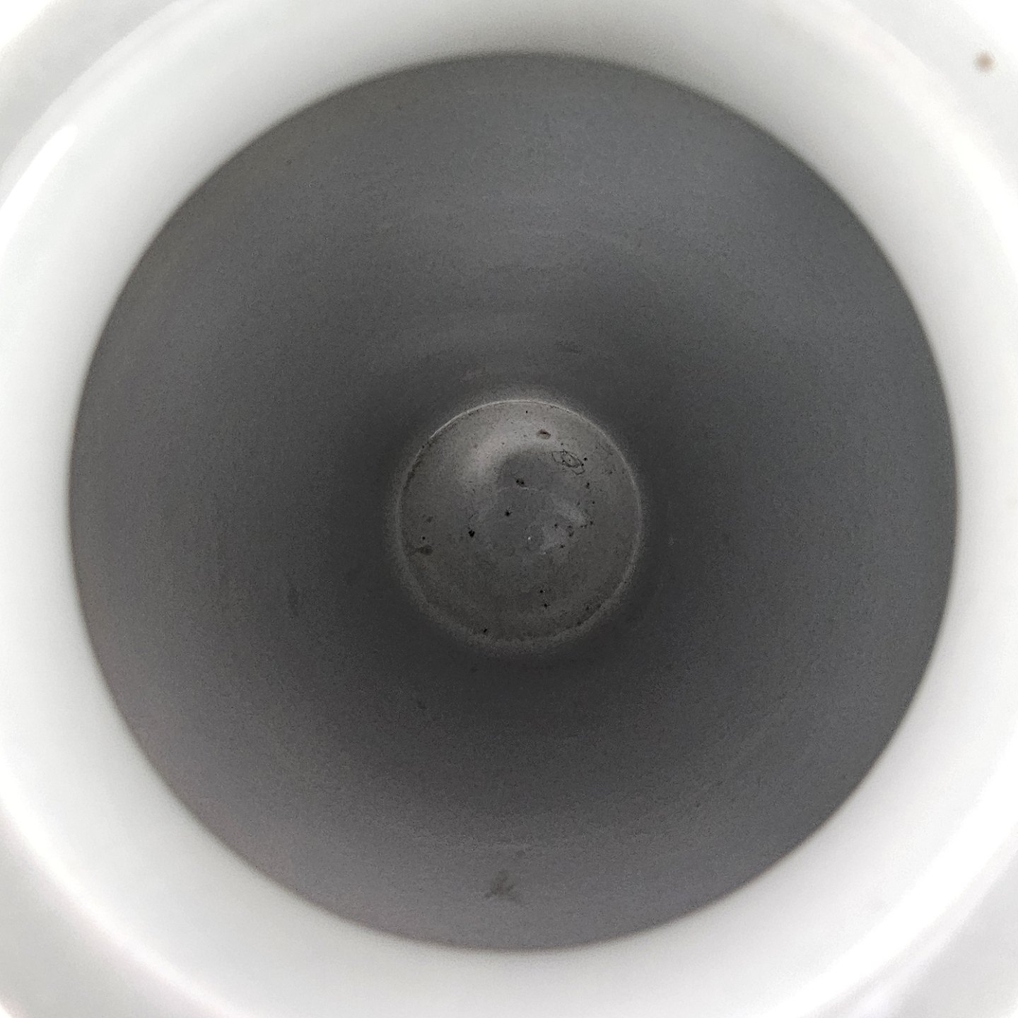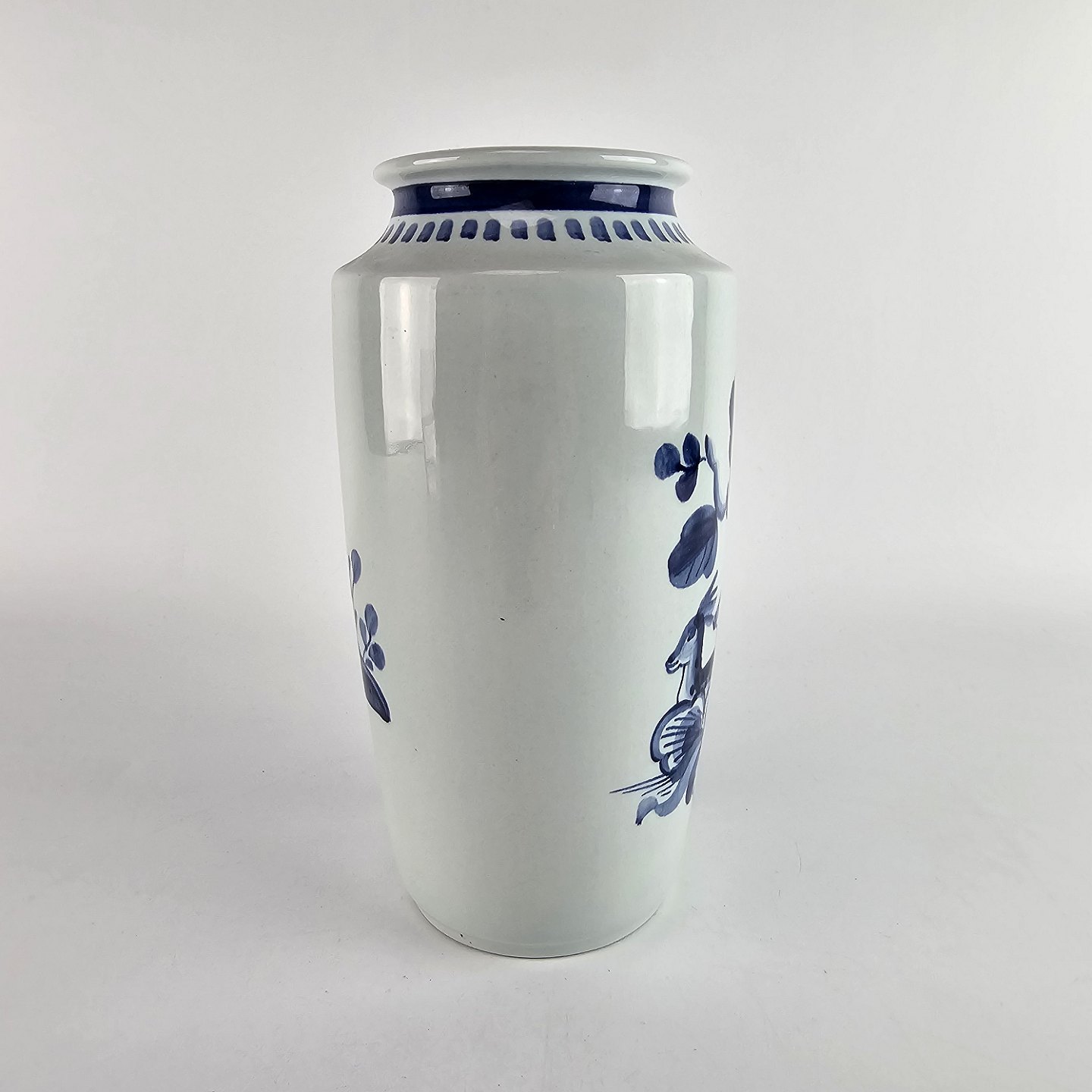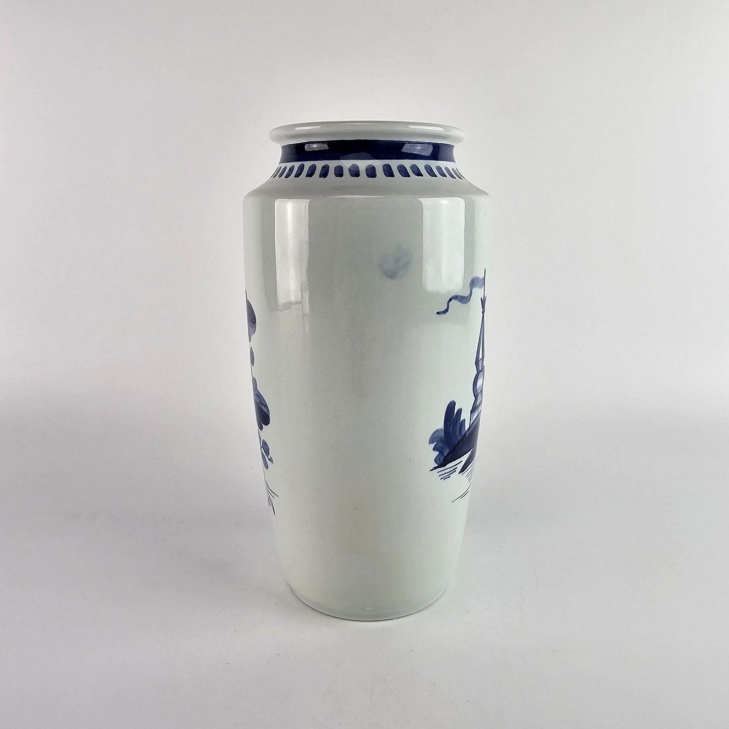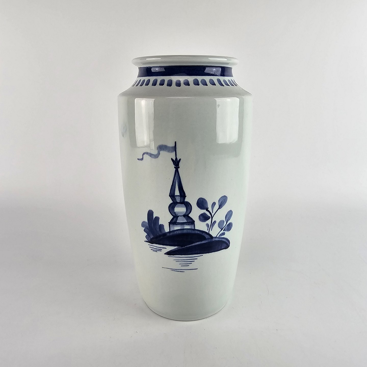 Cylinderformet tranquebar vase af fajance, dekoreret med naturmotiv med to dådyr og tårn bagpå. 4016/1156