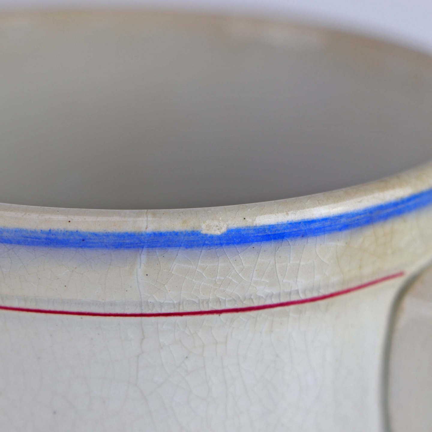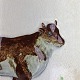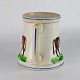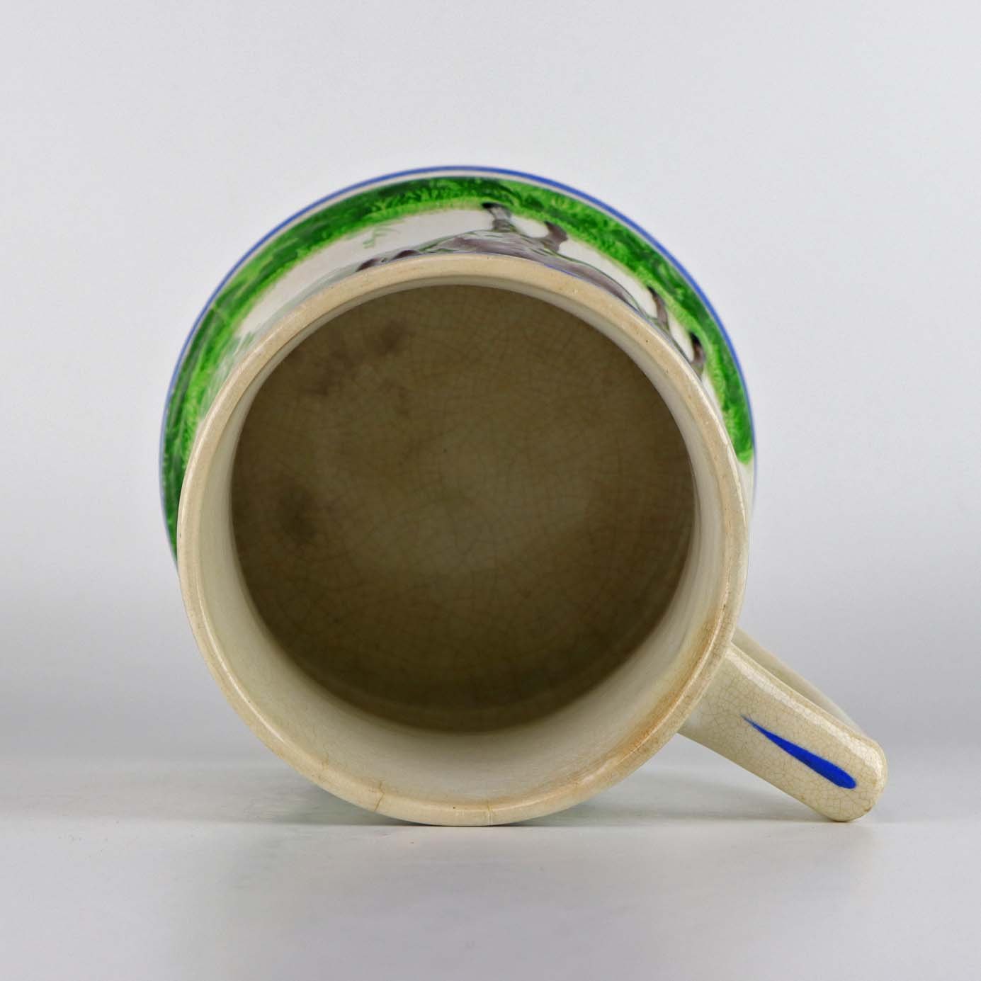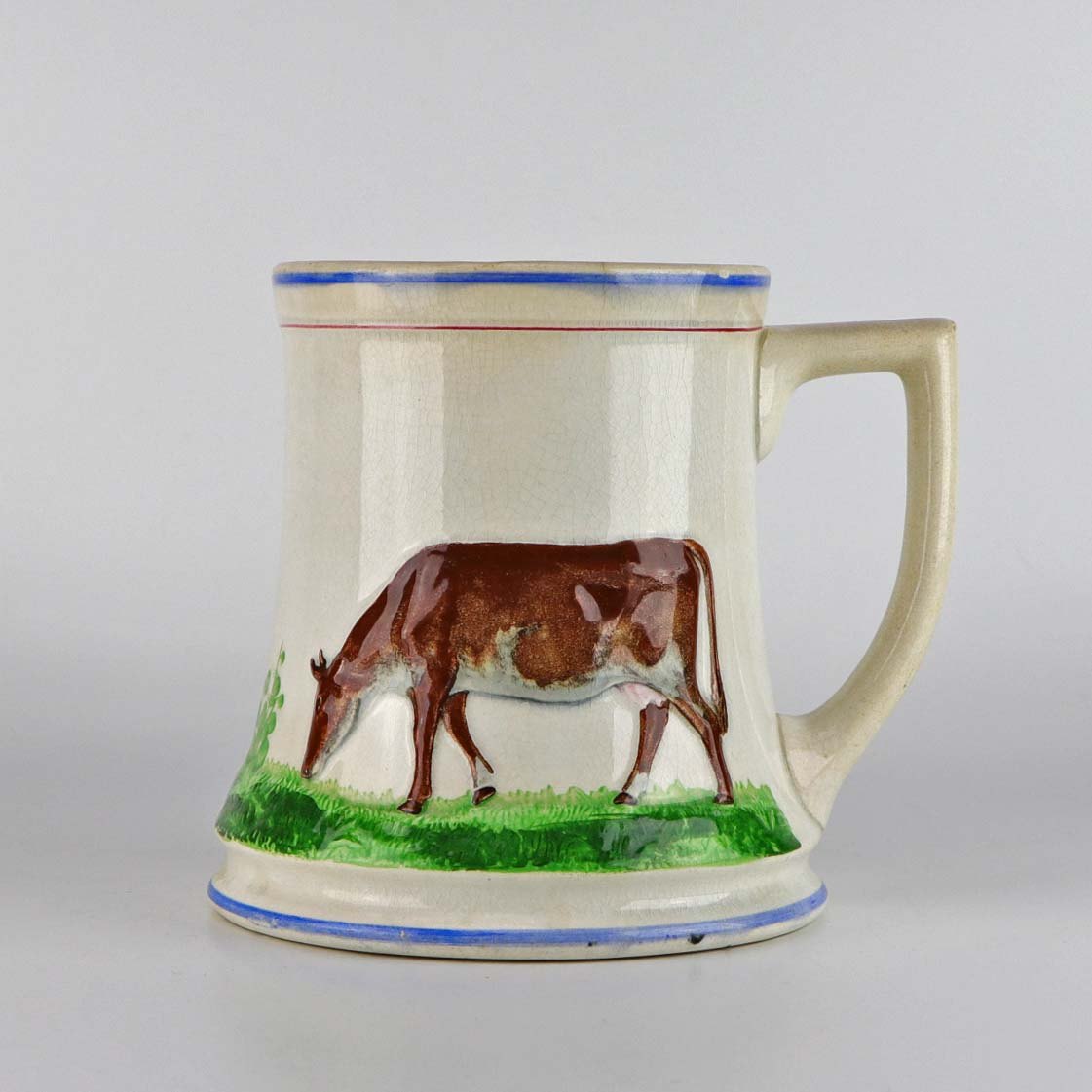 Antik ølkrus i fajance, som også er kendt under navnet Portlands krus. Dette krus er fremstillet i perioden år 1885-1905 og er dekoreret med motiv af en tyr og en ko