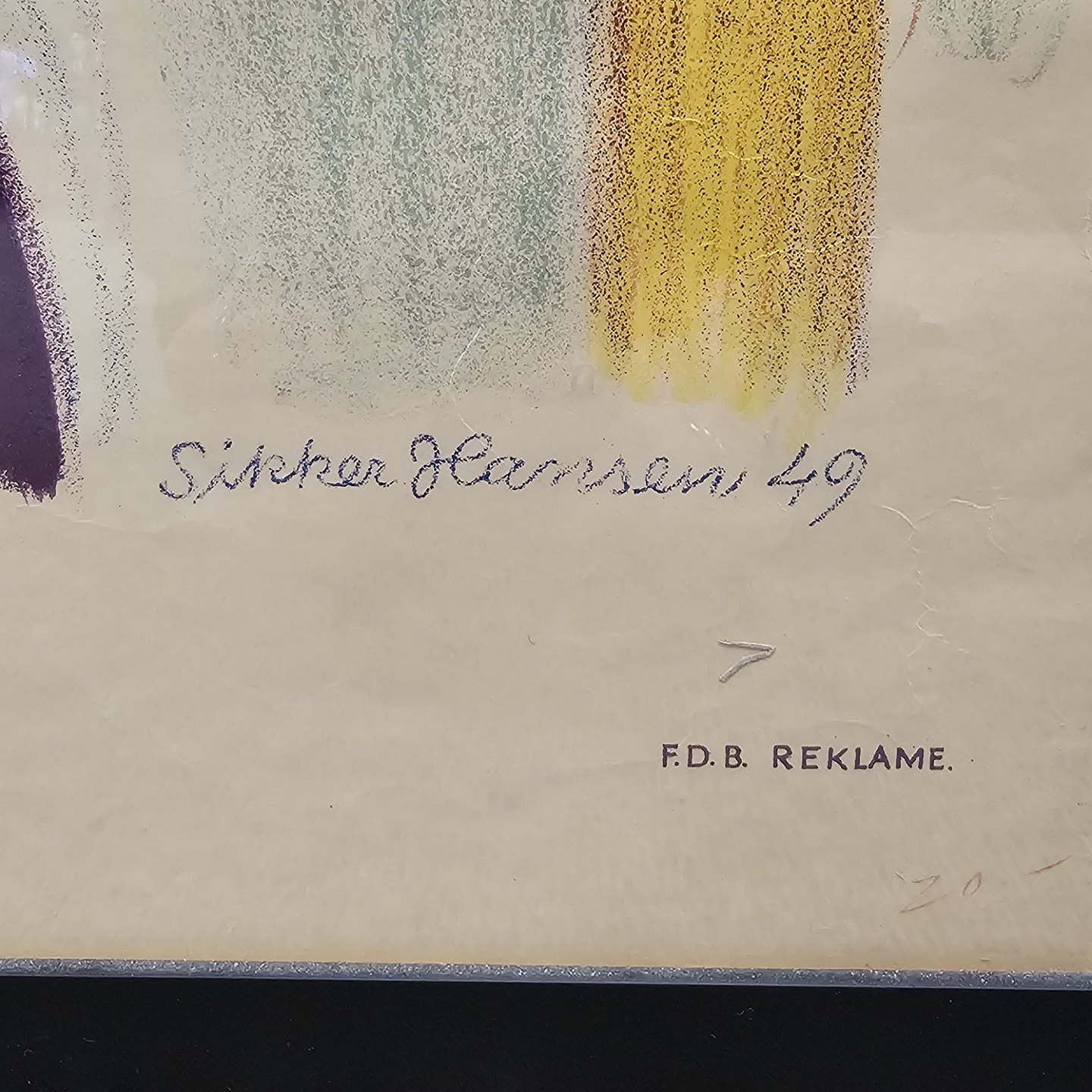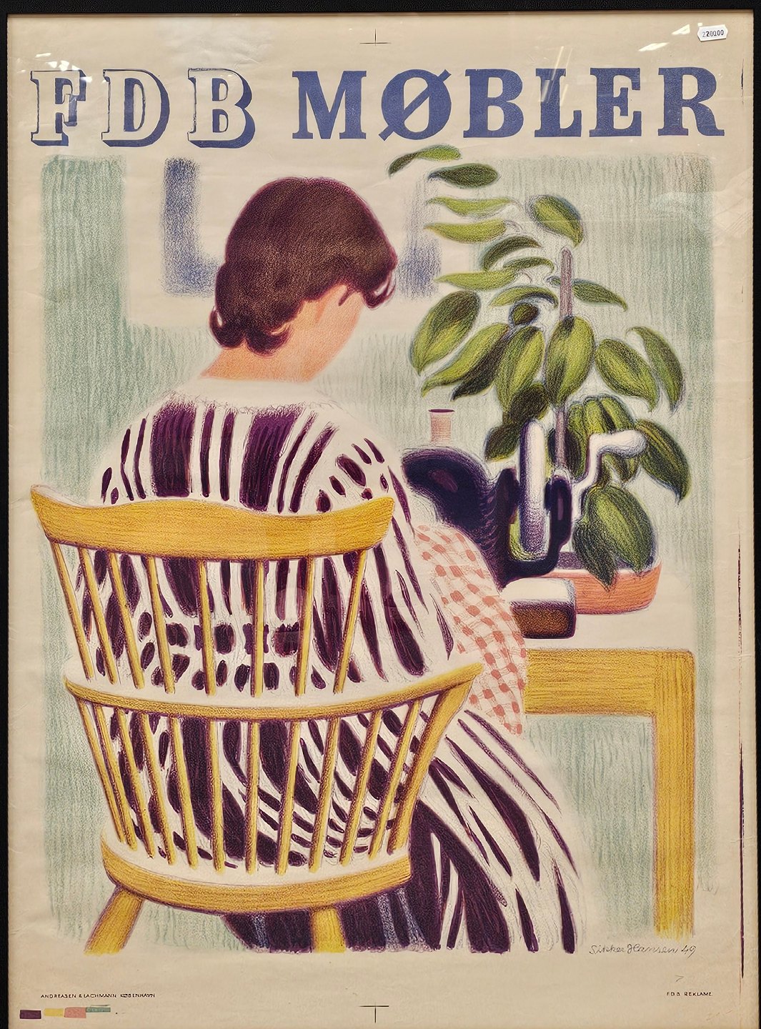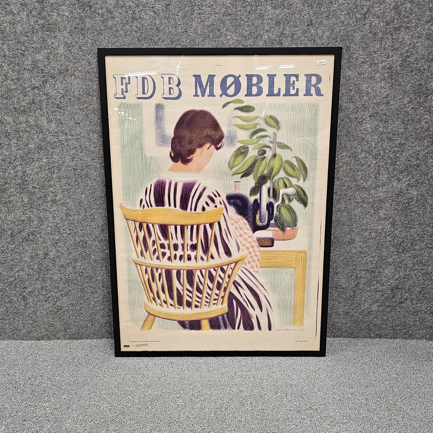 Original reklameplakat fra 1941, for FDB Møbler, i nyere sort ramme med glas. Med motiv af dame som sidder ved symaskine, set bagfra.