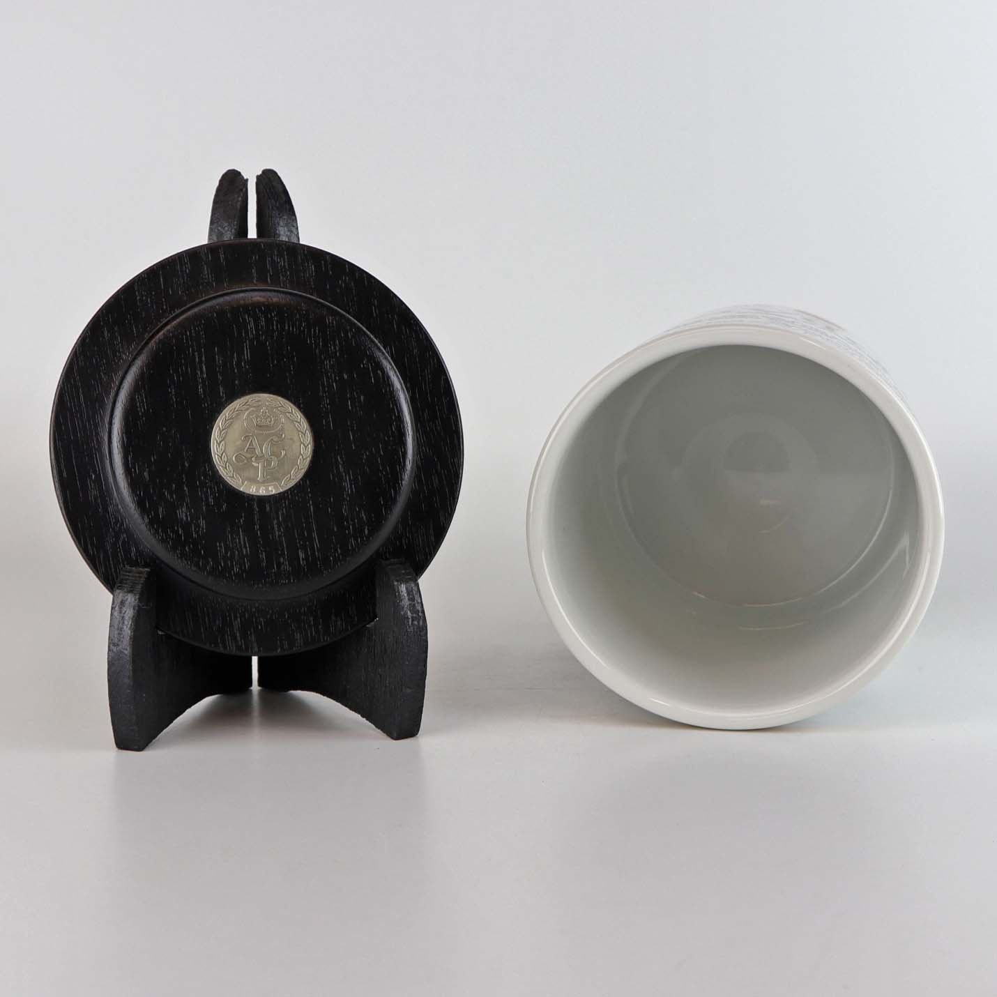 Krukke i porcelæn med låg af mørkt træ til opbevaring af pibetobak. Tobaksdåsen har motiv og tekst fra den tidligere tobaksfabrik i Horsens Alfred og Christian Petersen Ltd. Nr. 6053/7057