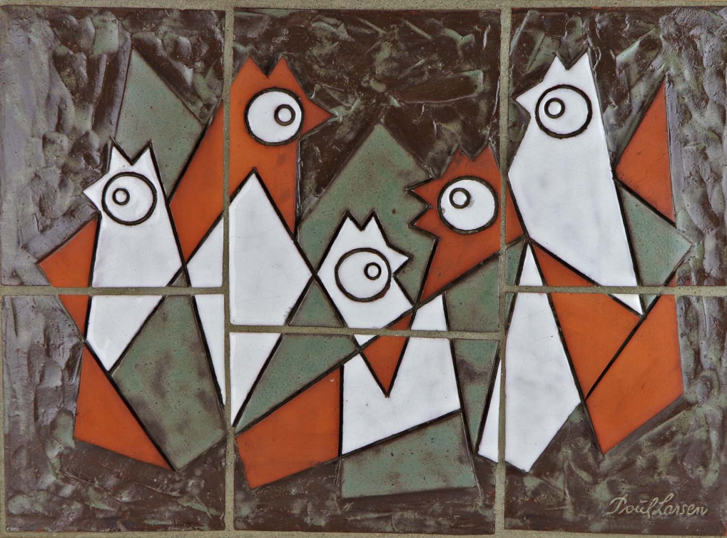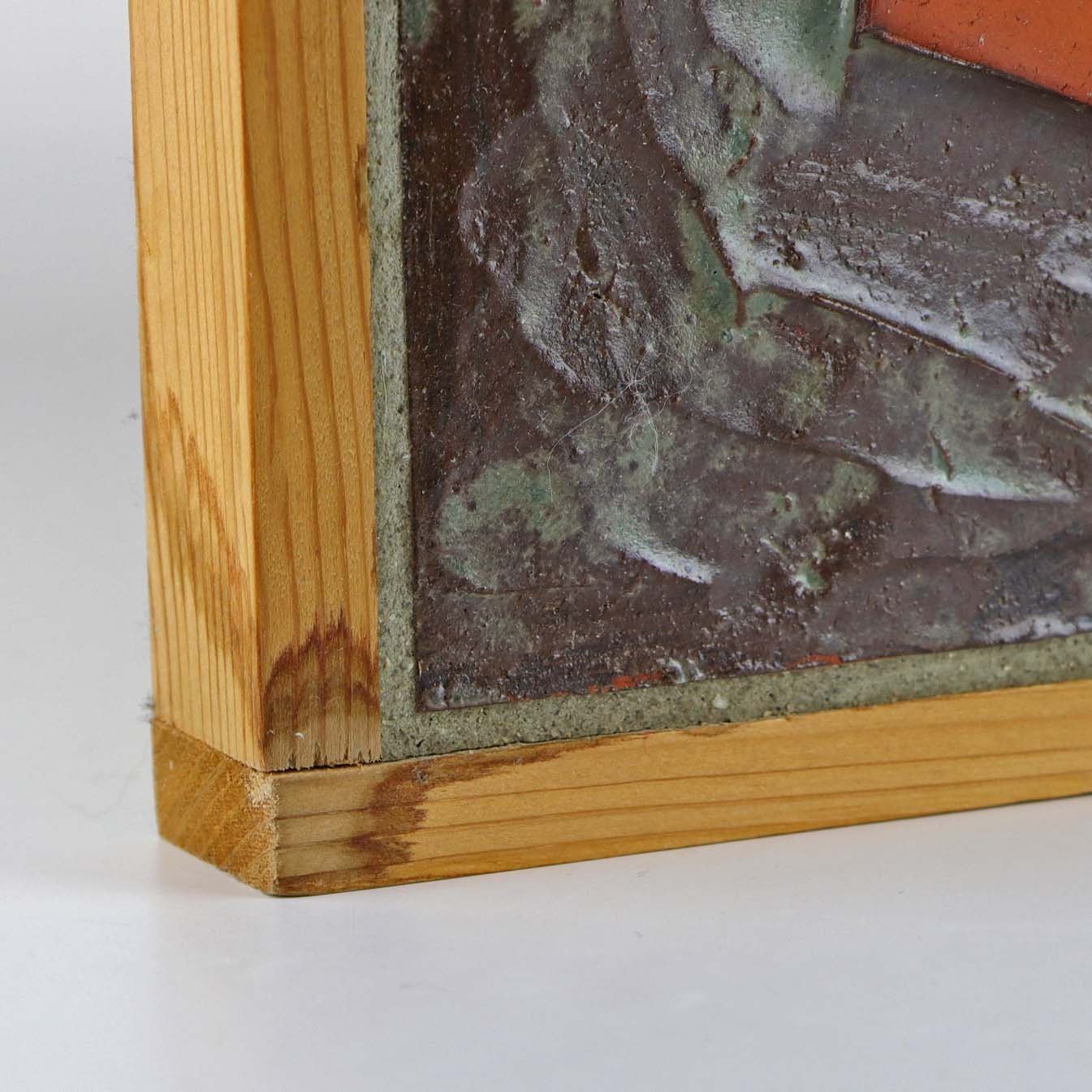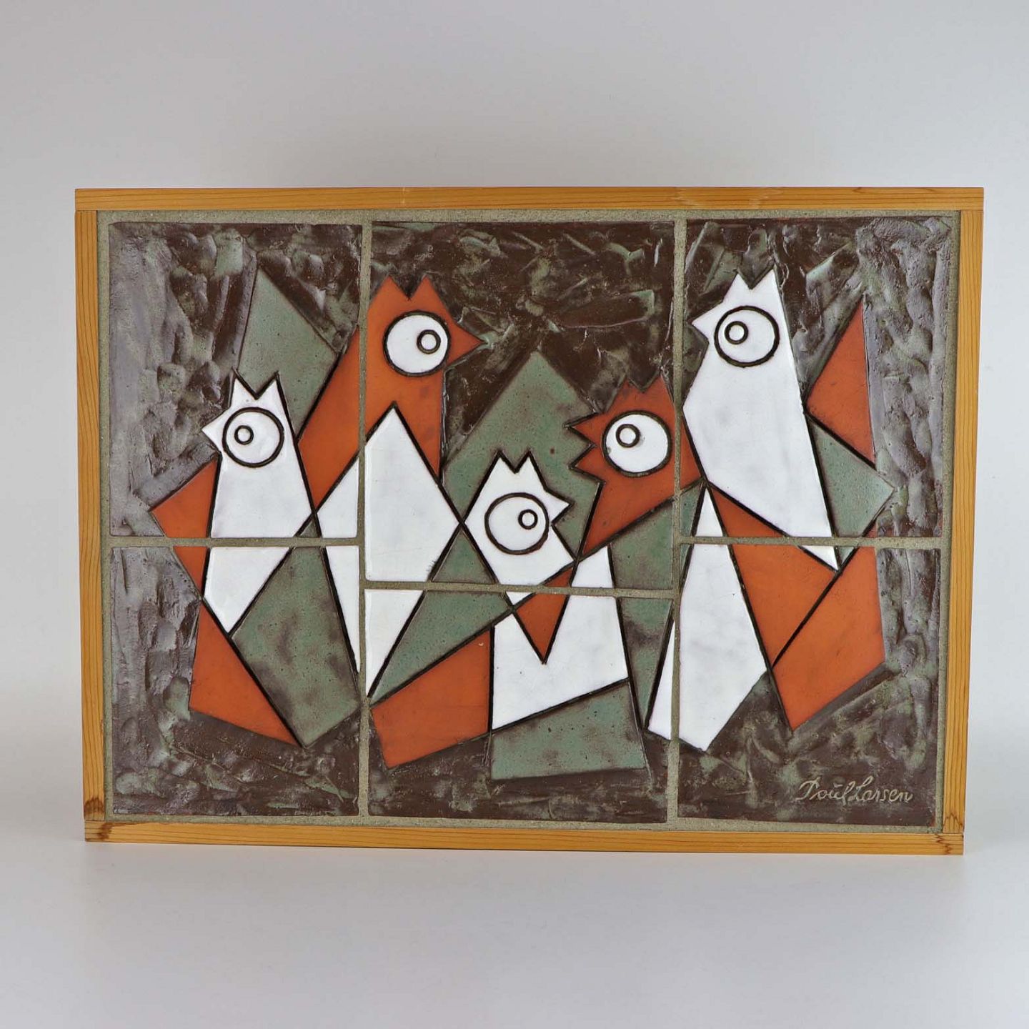 Relief i stentøj omgivet af træramme i fyrtræ med motiv af hvide, orange og grønne høns på brun baggrund